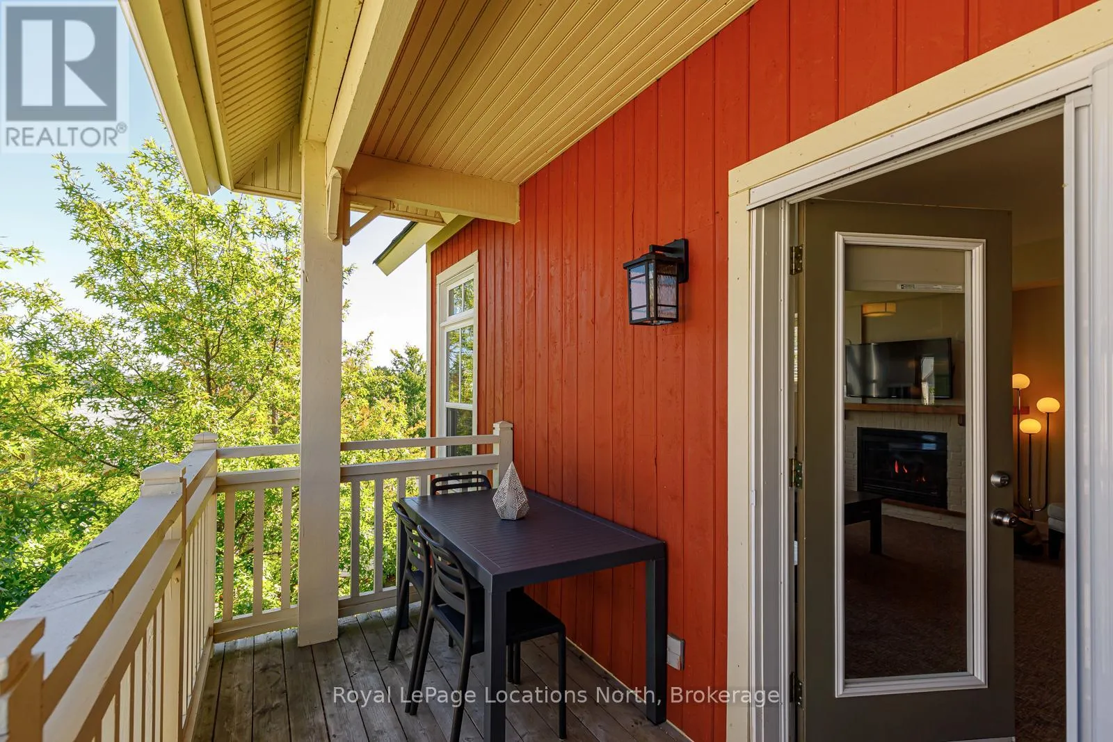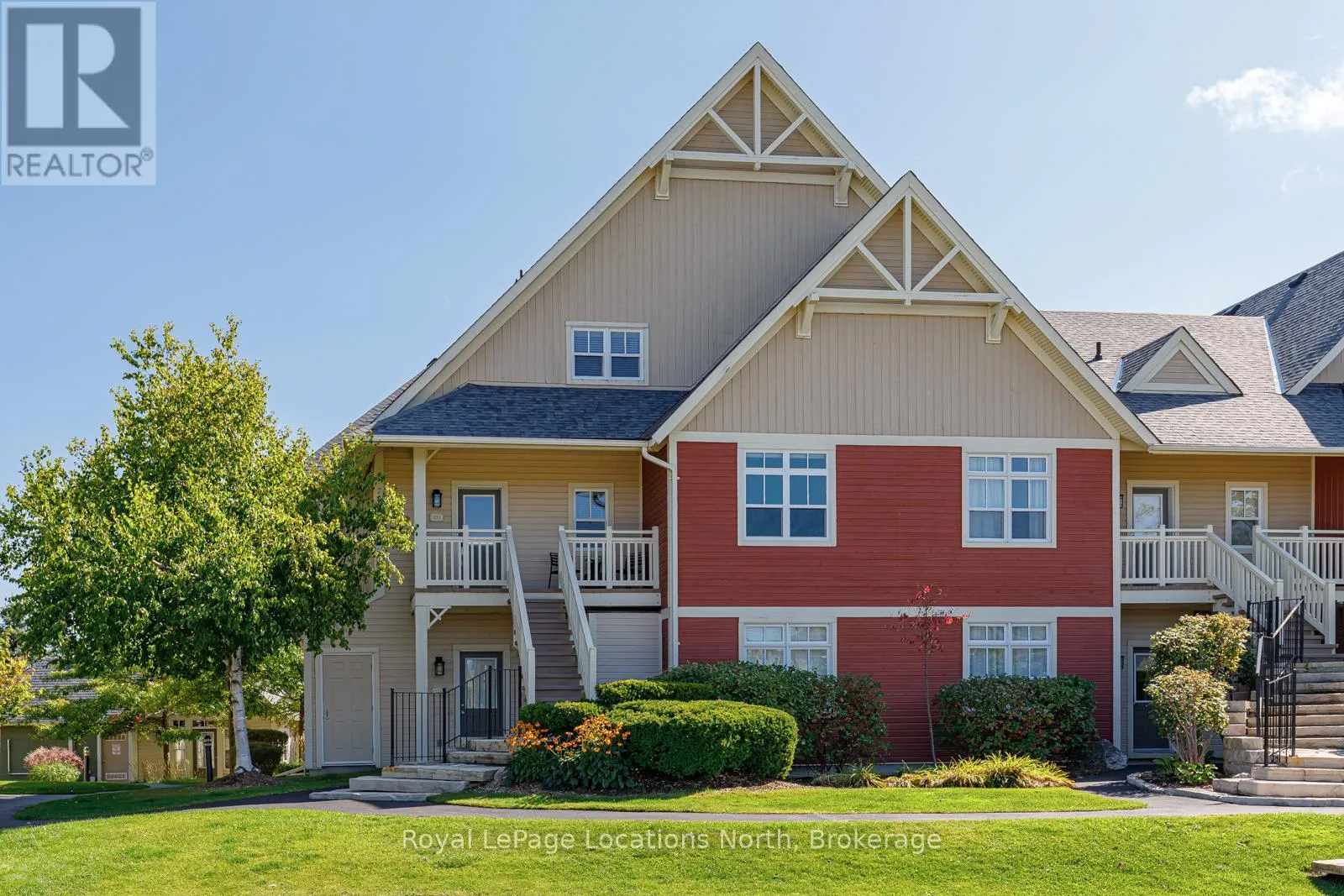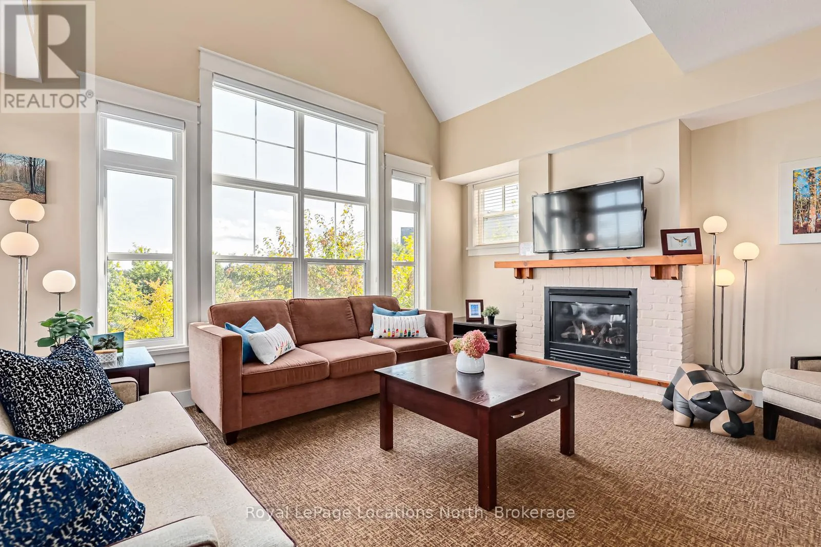 Mountain Road to 19 to Jozo Weider, then North on Fairway Court to end and building is on your right. Turnkey 3-bedroom, 2-bath upper-level end-unit condo in Rivergrass, just a short stroll to Blue Mountain Village with easy access to ski slopes, golf, hiking and cycling trails. A true four-season getaway in the heart of it all. Bright and inviting, the main floor offers a spacious family room with cathedral ceilings, cozy gas fireplace, and walkout to a private deck - perfect for après-ski or summer evenings. The open-concept kitchen with bar seating keeps everyone connected while cooking and entertaining. This level also features two generous bedrooms, a 4-piece bathroom, and in-suite laundry. Upstairs, the private primary retreat includes a Juliette balcony, 3-piece ensuite, and double closet, creating a comfortable space to unwind.The condo is being leased fully furnished and equipped - truly turnkey. Recent upgrades include window coverings throughout, thermostat, and updated light fixtures in the bathrooms and unit. A lockable ski locker (approx. 3x4x8 ft) adds secure storage for gear. Owners and guests enjoy on-site amenities, including a summer outdoor pool and year-round hot tub, ideal after a day on the hills or trails. A shuttle stop just steps away provides convenient service to Blue Mountain Village and the ski lifts. (id:27476)