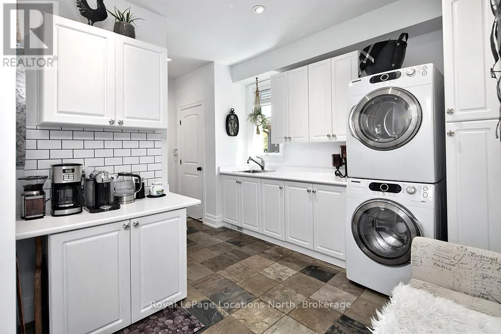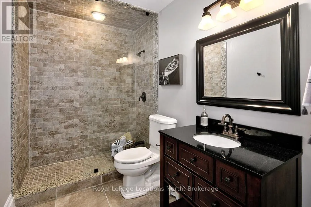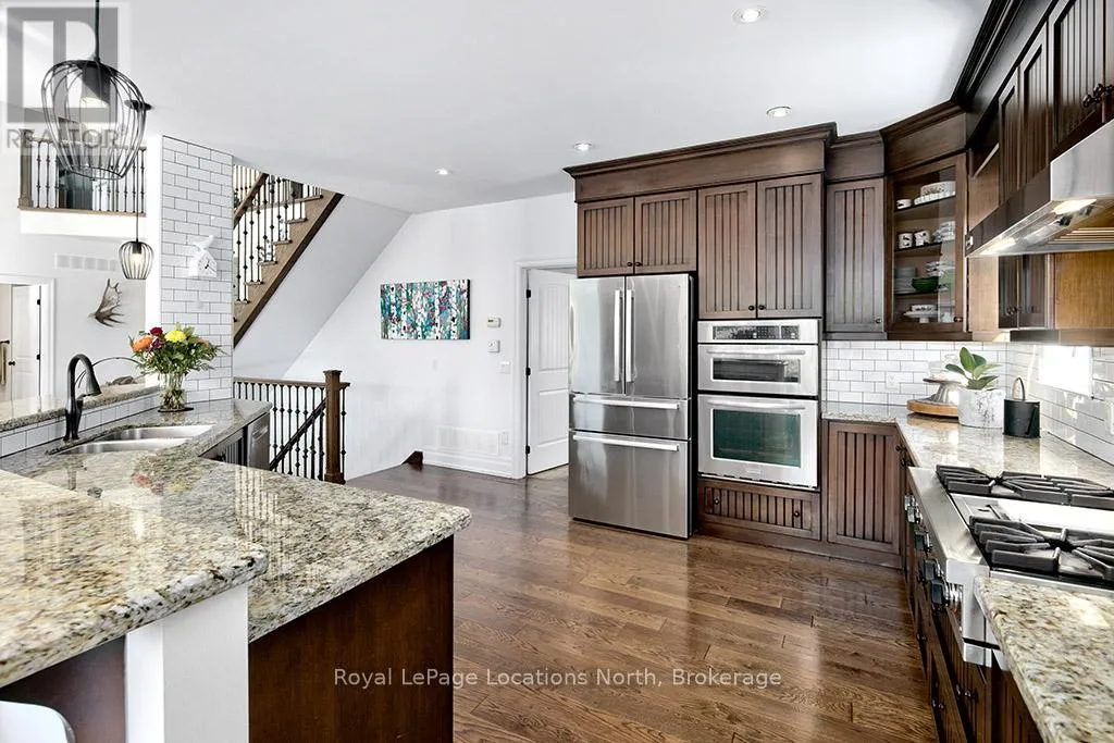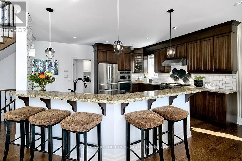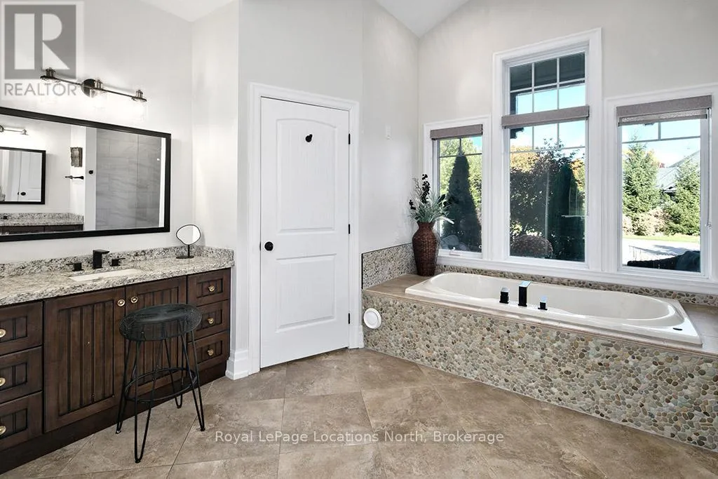 East ridge dr, Rankins cres Discover over 5,300 square feet of beautifully appointed living space in this 5 bed, 4 bath home located in the Lora Bay community, just mins from downtown Thornbury.The open-concept main floor welcomes you with soaring ceilings in the great room, highlighted by a striking floor-to-ceiling stone wood-burning fireplace that creates a warm and inviting focal point. The chef's kitchen offers granite countertops, high-end built-in appliances, a generous island with bar seating, and plenty of space for gathering with family and friends. The spacious primary suite features a gas fireplace, luxurious 5pc ensuite bathroom, and walk-in closet, providing a private and serene retreat. Also on the main level are a dedicated office/den, a convenient laundry room with pantry, and access to the attached two-car garage.Upstairs, a versatile loft area overlooks the main living space and leads to 2 comfortable guest bedrooms and a 5pc bathroom. The fully finished lower level is perfect for entertaining, complete with a large recreation room featuring a bar and projector, pool table, flex room, 2 additional bedrooms, wine cellar and a 3pc bathroom.Outside, the private backyard offers a tranquil escape surrounded by mature trees, beautiful landscaping, and a new privacy fence-ideal for relaxing or hosting gatherings after a day of golf or skiing.Recent updates include a new fibreglass front door and custom sliding patio doors (2025), new carpet in the den (2025), new roof (2024), a fitness room and recreation room bar addition (2024), a wine cellar (2021), and high-efficiency furnace and air conditioning (2020). Extensive landscaping enhancements complete this impressive property.Living in Lora Bay means more than just a beautiful home-it's a lifestyle. Enjoy access to an award-winning golf course, clubhouse restaurant, members-only lodge, fitness centre,two private beaches, with private ski and golf clubs nearby. (id:27476)