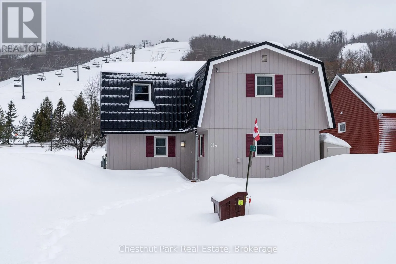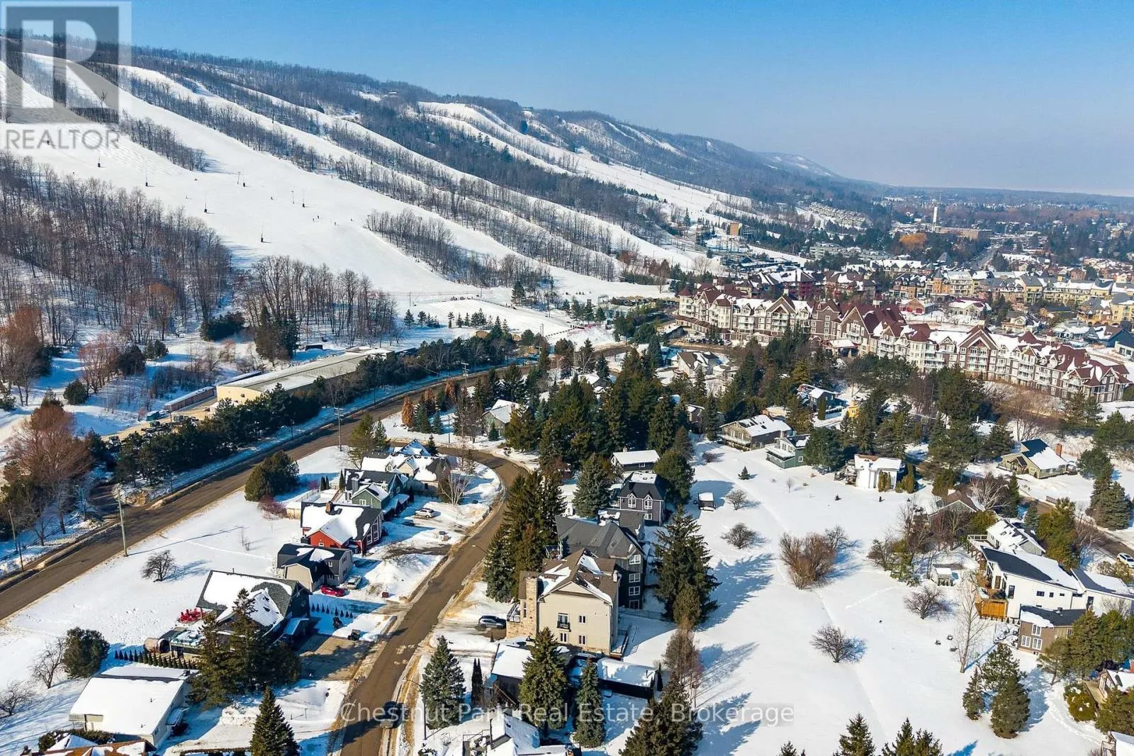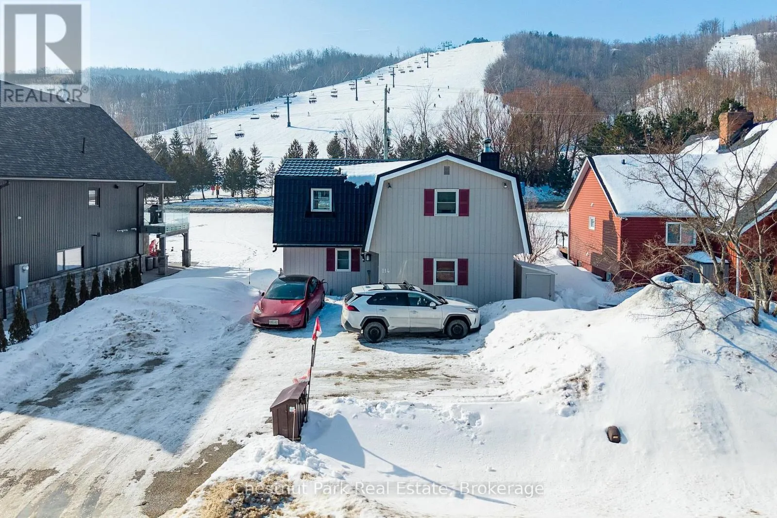 Cross Streets: Gord Canning Drive and Carmichael Crescent. ** Directions: Grey Rd 19 to the round-about to Gord Canning Drive to Carmichael Crescent to the sign on property. Leave your car in the driveway and live the ultimate mountain lifestyle, ideally located on one of the best streets at the base of Blue Mountain. Just walk through your back yard, across the road and catch the first chair lift of the day. A short 2 minute walk to the Village at Blue, this street is known for its welcoming neighbours and unbeatable convenience - everything you need is steps away. This reverse floorplan Turn-key home offers 1760 sq. ft. of finished living space with 6 bedrooms and 1.5 baths. Backing onto the panoramic views of the ski hills, here kids can run and play freely in your yard, take your pets for long walks or enjoy après ski gatherings around a backyard firepit with family and friends. Upon entering the main floor foyer, 4 bedrooms and a 2-piece bath with separate shower provide comfort and flexibility for family or guests. A utility room with ski storage, boot/hat and mitt cubbies and back door access to your yard offer immediate ski access. Upstairs the open floor plan kitchen and dining room open to a small deck with views of the mountain. The family room features an inviting wood-burning fireplace and sliding doors that walk-out to a large deck designed for great gatherings with front-row panoramic views of Blue Mountain's night-lit ski runs or summer BBQ's. Down the hall is another guest bedroom, a primary bedroom and 4 pc bathroom. Five minutes to private ski clubs, golf courses, and a short ride to Northwinds Beach, the Georgian Trail, and downtown Collingwood's shops, restaurants and cultural attractions or the charming town of Thornbury 15 minutes away. Don't miss your chance to start your next chapter in Southern Georgian Bay. Enjoy slopeside living at its finest. (id:27476)