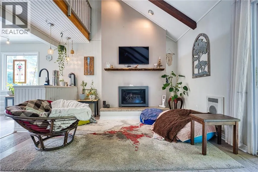 Hwy 21 to Centennial Rd to Woodland Dr Welcome to this beautiful year-round 3-bed, 2-bath, 1,326 sqft home or cottage, perfectly situated in a peaceful lakeside subdivision just outside of Bayfield. Featuring an ideal blend of comfort, charm & functionality, this property is designed for both relaxing getaways & full-time living. Step inside to discover a warm & inviting layout featuring soaring cathedral ceilings & stylish updated flooring. The living room features a cozy gas fireplace & sliding doors provide plenty of natural light. The open concept dining area is perfect for entertaining, while the updated kitchen features modern open shelving. The sunroom is the perfect place for morning coffee or a good book. The main floor primary bedroom includes a private 2-pc ensuite, while a convenient laundry closet completes this level. Upstairs, youâll find a good-sized second bedroom w/ access to a Juliette balcony, a versatile den space that can easily serve as a third bedroom, home office or hobby area & a 4-pc bath. Additional highlights include updated windows, a built-in wall air conditioning unit, a detached insulated garage w/ heat pump & hydro (2 cars can be parked tandem) which could potentially be converted to a bunkie, plus a concrete 3-car driveway. Enjoy peaceful outdoor living w/ decks at both the front & back of the property (brand new expanded deck installed at the back), English gardens, gazebo, outdoor shower, plus a hot tub for year-round relaxation. The landscaped yard features mature trees & peaceful views of the surrounding countryside, all while being just a short stroll to the beach w/ deeded access to Lake Huron. With municipal water, municipal road access & high-speed/fibre optic internet, this property features modern conveniences in a serene setting. Currently enjoyed as a full-time residence, this home is turn-key & ready to be yours! Note: All items on the property negotiable including furniture, etc. Main heat source: Gas fireplace w/ supplemental electric baseboard heating. (id:27476)