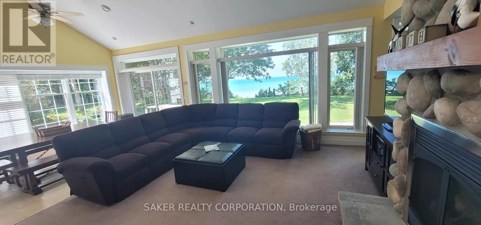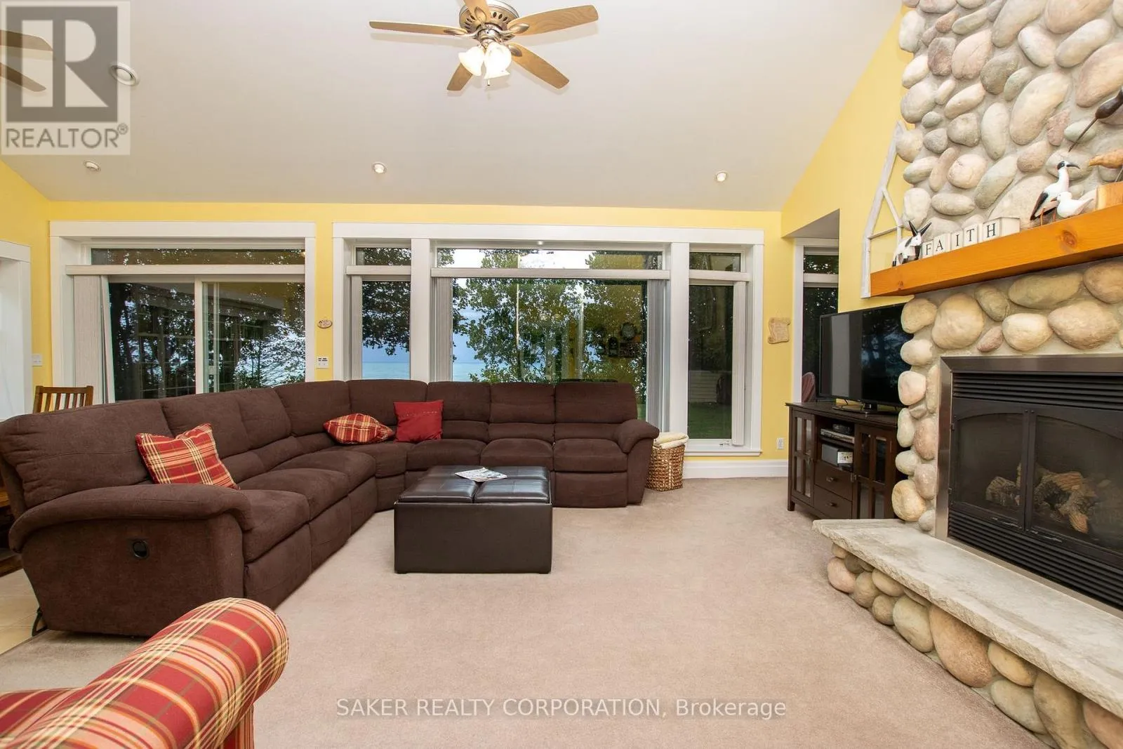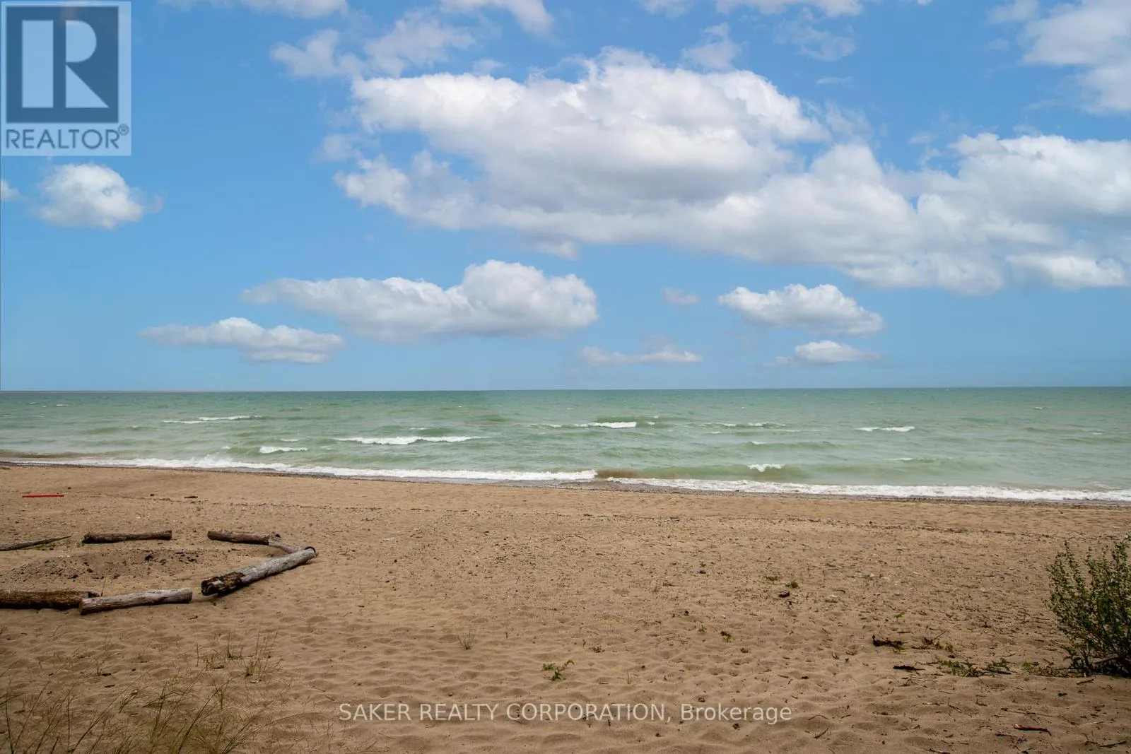 Cross Streets: EVELYN. ** Directions: JUST 5 MIN NORTH OF GRAND BEND. Experience one of the most beautiful beaches on Lake Huron, where silky smooth sand meets shallow, Caribbean-blue waters just a 5 minute drive to Grand Bend and is located in the Highland 3 subdivision. This property is protected by a seawall and offers unparalleled views both from the hilltop and the home itself, designed to capture ever-changing scenery and breathtaking sunsets. The private yard is shaded by mature trees, while a pressure-treated staircase leads down to a wide, sandy beach with ample space for kayaks, Seadoos, and more. Inside, the 3-bedroom home features an open-concept layout with floor-to-ceiling windows, a striking gas fieldstone fireplace, and unobstructed lake vistas. The master suite occupies its own private second-floor retreat with a luxurious ensuite and sweeping views. Additional highlights include a new roof (2024), generous parking for up to eight vehicles on a concrete laneway, and potential for a double-car garage. perfect for lakeside living at its finest. (id:27476)