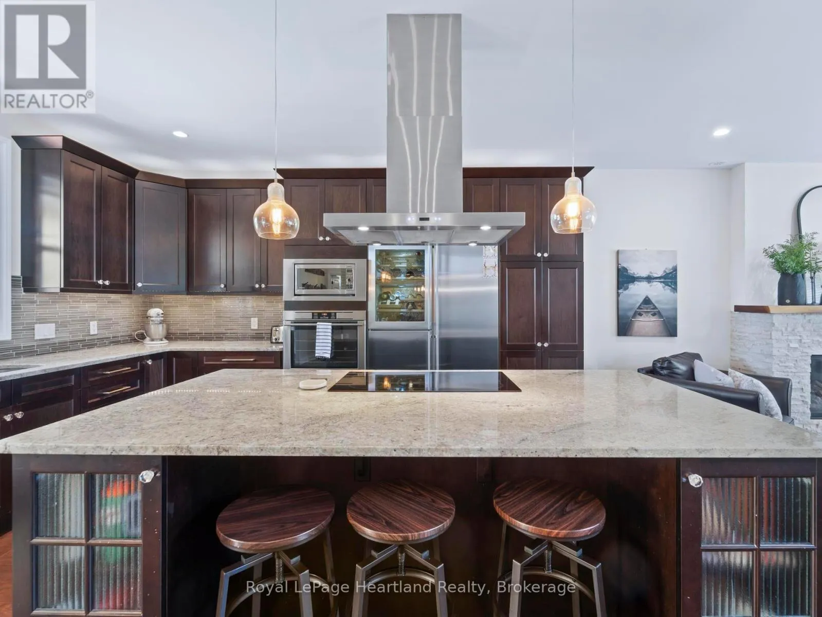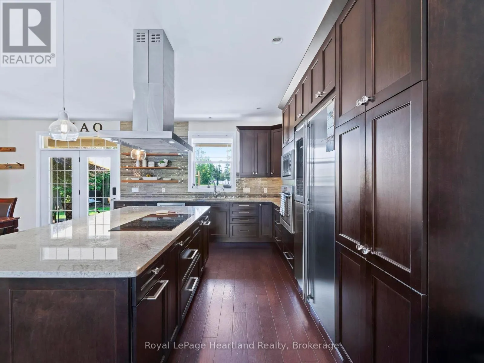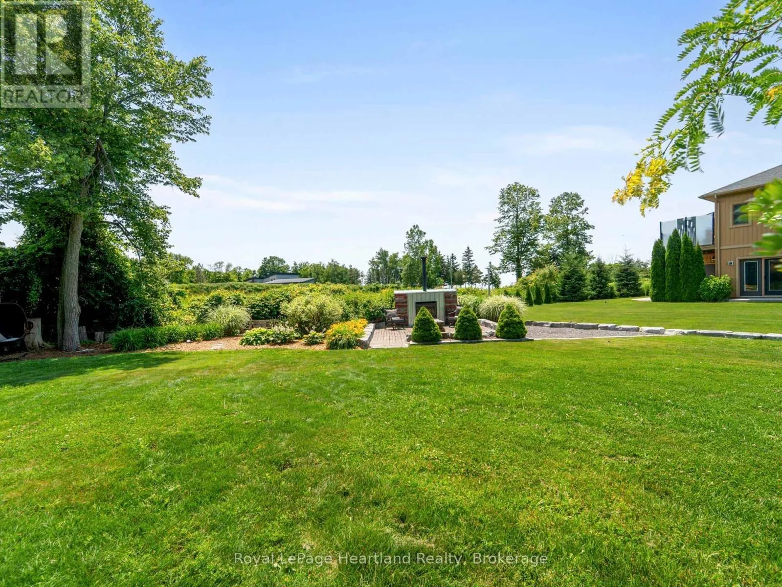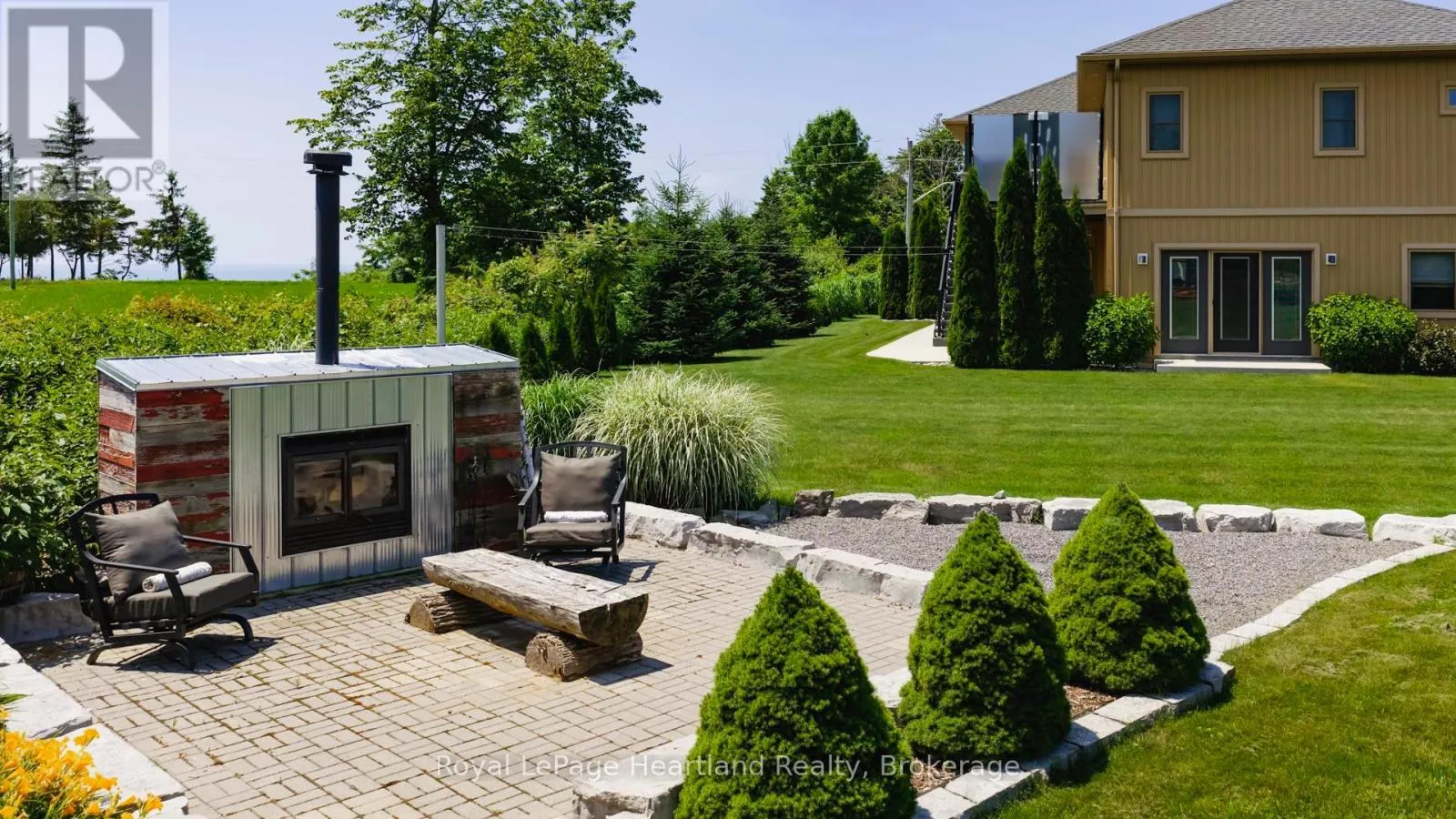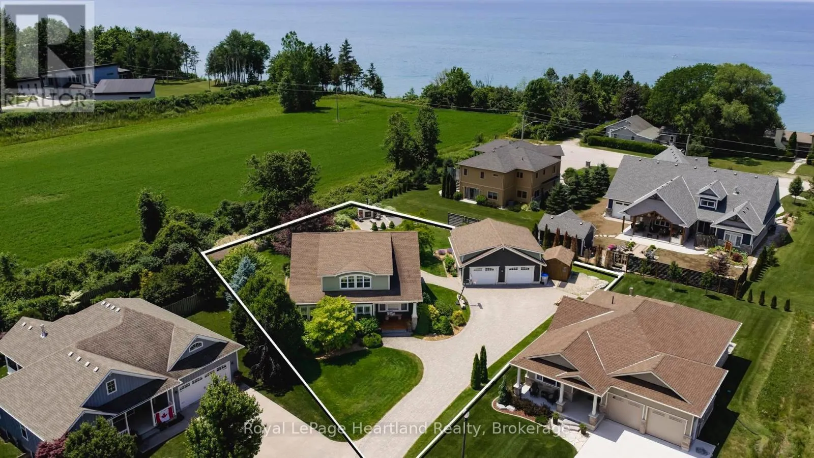 Cross Streets: Bluewater Highway to Cameron. Turn left onto Lidderdale. Turn right onto Thimbleweed. ** Directions: Bluewater Highway to Cameron. Turn left onto Lidderdale. Turn right onto Thimbleweed. Watch for sign. 24 Thimbleweed Drive- a stunning custom-built 4 bed, 4 bath home in one of Bayfield's most prestigious lakeside neighbourhoods. Just steps from Lake Hurons sandy beaches and a short stroll to the village core, this exceptional residence offers over 3,000 sq ft of finished living space, a rare heated 4-car garage with 12' ceilings and car hoist, and premium finishes throughout. Inside, enjoy a sunlit open-concept layout with a chefs kitchen featuring granite countertops, stainless appliances, and custom cabinetry. The elegant great room flows to the expansive deck, while the luxurious main floor primary suite offers a spa-inspired ensuite and walk-in closet with built-ins. The beautiful staircase leads to the second level with two spacious bedrooms and a 4 piece spa like bathroom. The fully finished lower level is a showstopper featuring radiant in-floor heating, a second full kitchen, large rec room, an additional bedroom, a stylish bath, and spacious laundry room with granite counters and storage galore. Outdoors, entertain or unwind in your private hot tub, around the built-in fireplace, or on the oversized deck with sweeping views of open countryside and lake horizon. Professionally landscaped with full irrigation, this home delivers tranquility and wow factor in equal measure.A rare opportunity to own one of Bayfield's finest homes offering luxury, functionality, and an unbeatable location. This is lakeside living at its best! (id:27476)