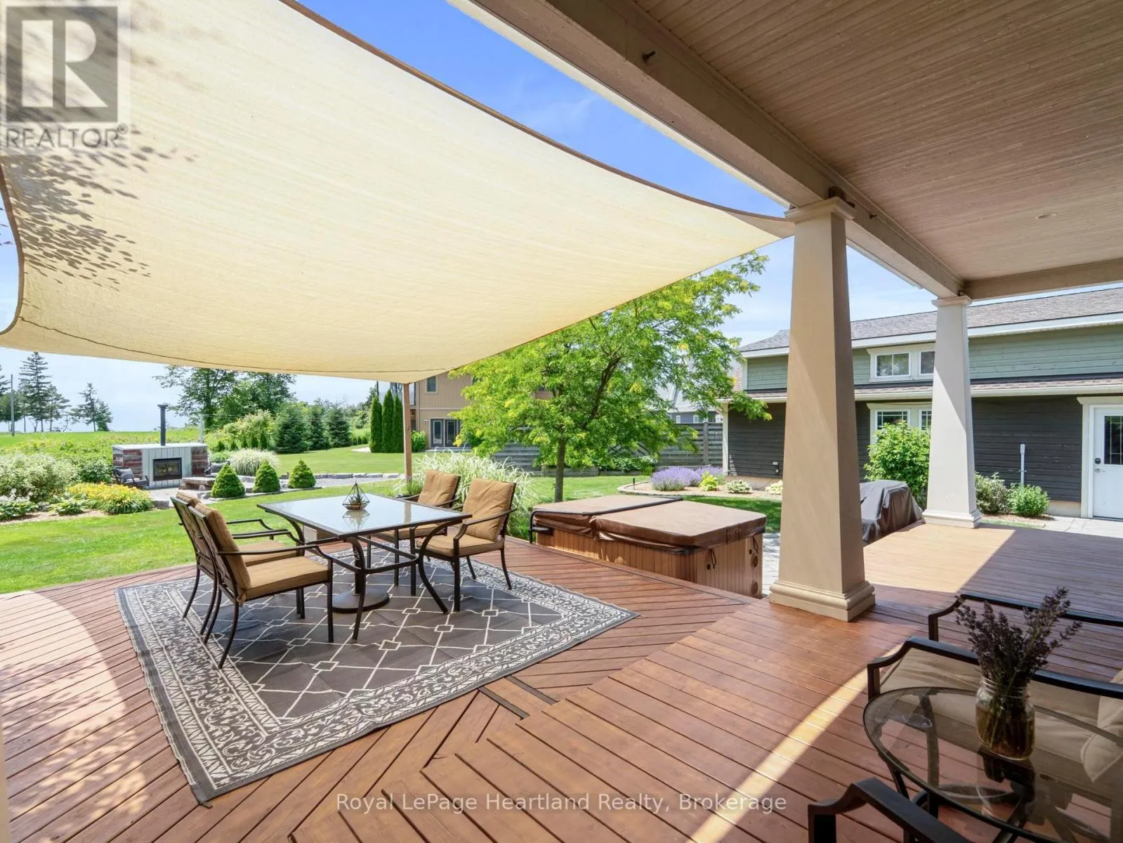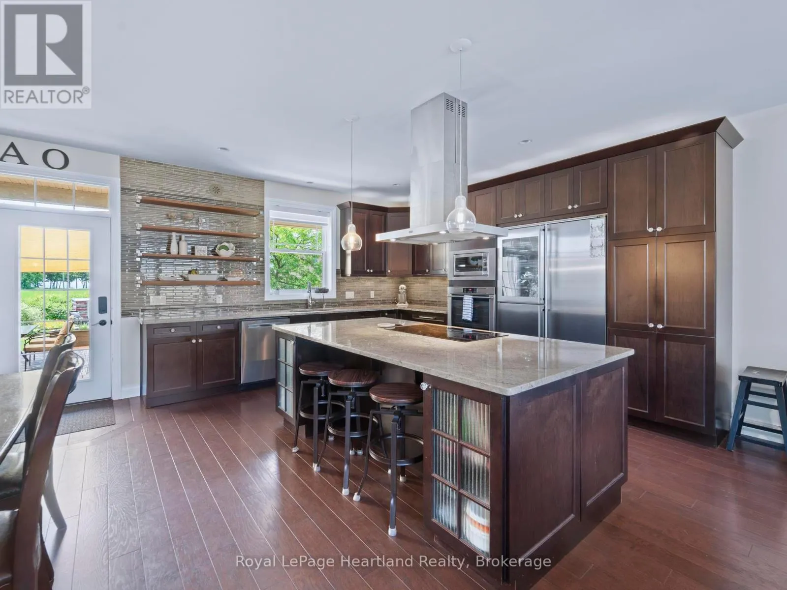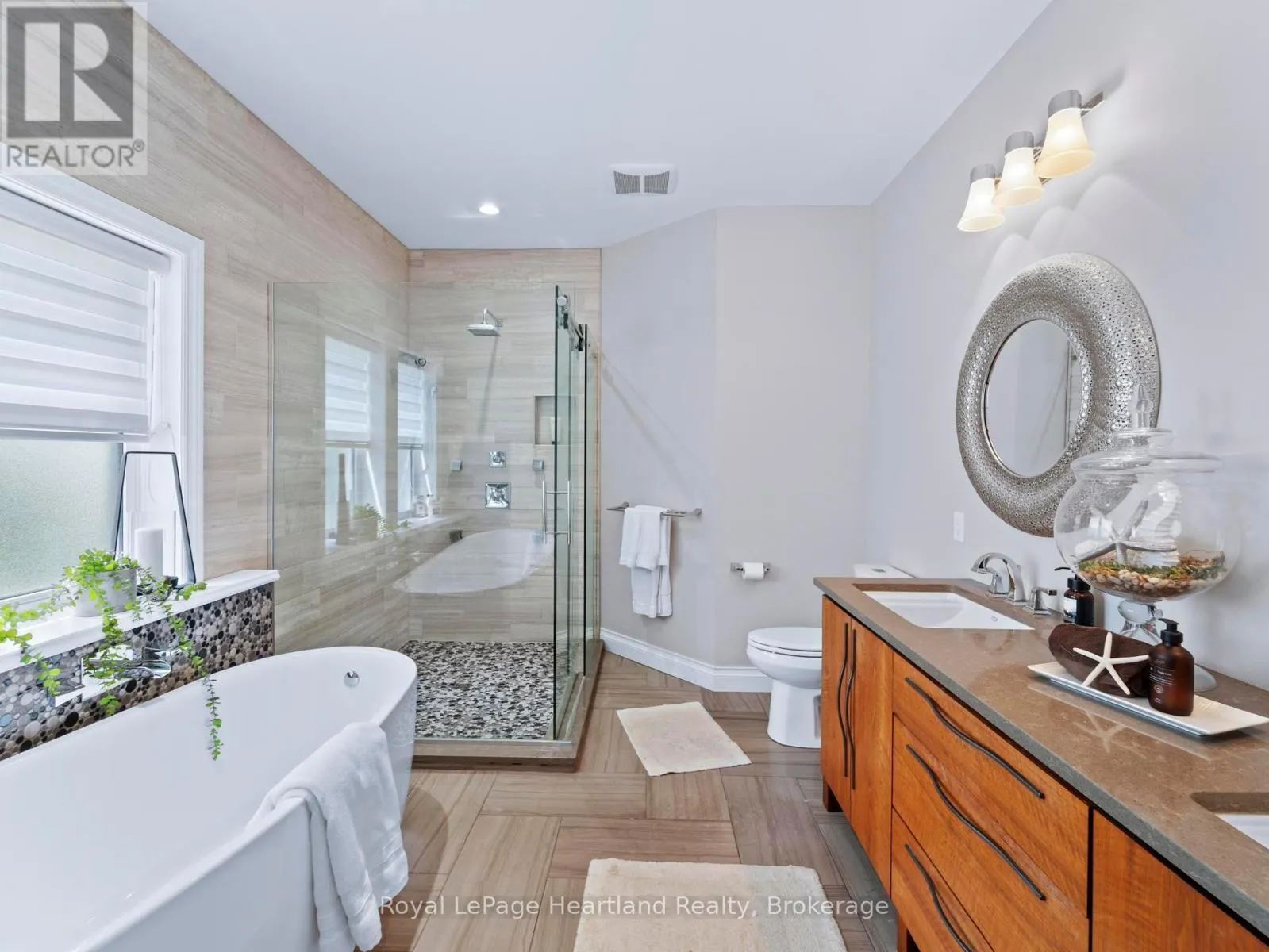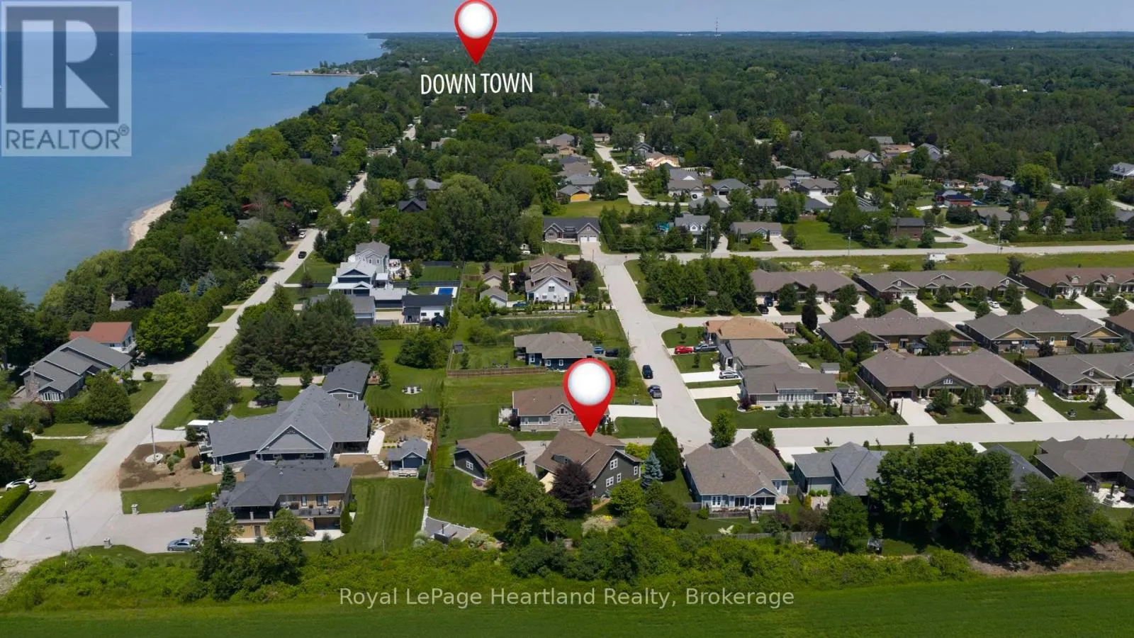 Cross Streets: Bluewater Highway to Cameron. Turn left onto Lidderdale. Turn right onto Thimbleweed. ** Directions: Bluewater Highway to Cameron. Turn left onto Lidderdale. Turn right onto Thimbleweed. Watch for sign. 24 Thimbleweed Drive- a stunning custom-built 4 bed, 4 bath home in one of Bayfield's most prestigious lakeside neighbourhoods. Just steps from Lake Hurons sandy beaches and a short stroll to the village core, this exceptional residence offers over 3,000 sq ft of finished living space, a rare heated 4-car garage with 12' ceilings and car hoist, and premium finishes throughout. Inside, enjoy a sunlit open-concept layout with a chefs kitchen featuring granite countertops, stainless appliances, and custom cabinetry. The elegant great room flows to the expansive deck, while the luxurious main floor primary suite offers a spa-inspired ensuite and walk-in closet with built-ins. The beautiful staircase leads to the second level with two spacious bedrooms and a 4 piece spa like bathroom. The fully finished lower level is a showstopper featuring radiant in-floor heating, a second full kitchen, large rec room, an additional bedroom, a stylish bath, and spacious laundry room with granite counters and storage galore. Outdoors, entertain or unwind in your private hot tub, around the built-in fireplace, or on the oversized deck with sweeping views of open countryside and lake horizon. Professionally landscaped with full irrigation, this home delivers tranquility and wow factor in equal measure.A rare opportunity to own one of Bayfield's finest homes offering luxury, functionality, and an unbeatable location. This is lakeside living at its best! (id:27476)