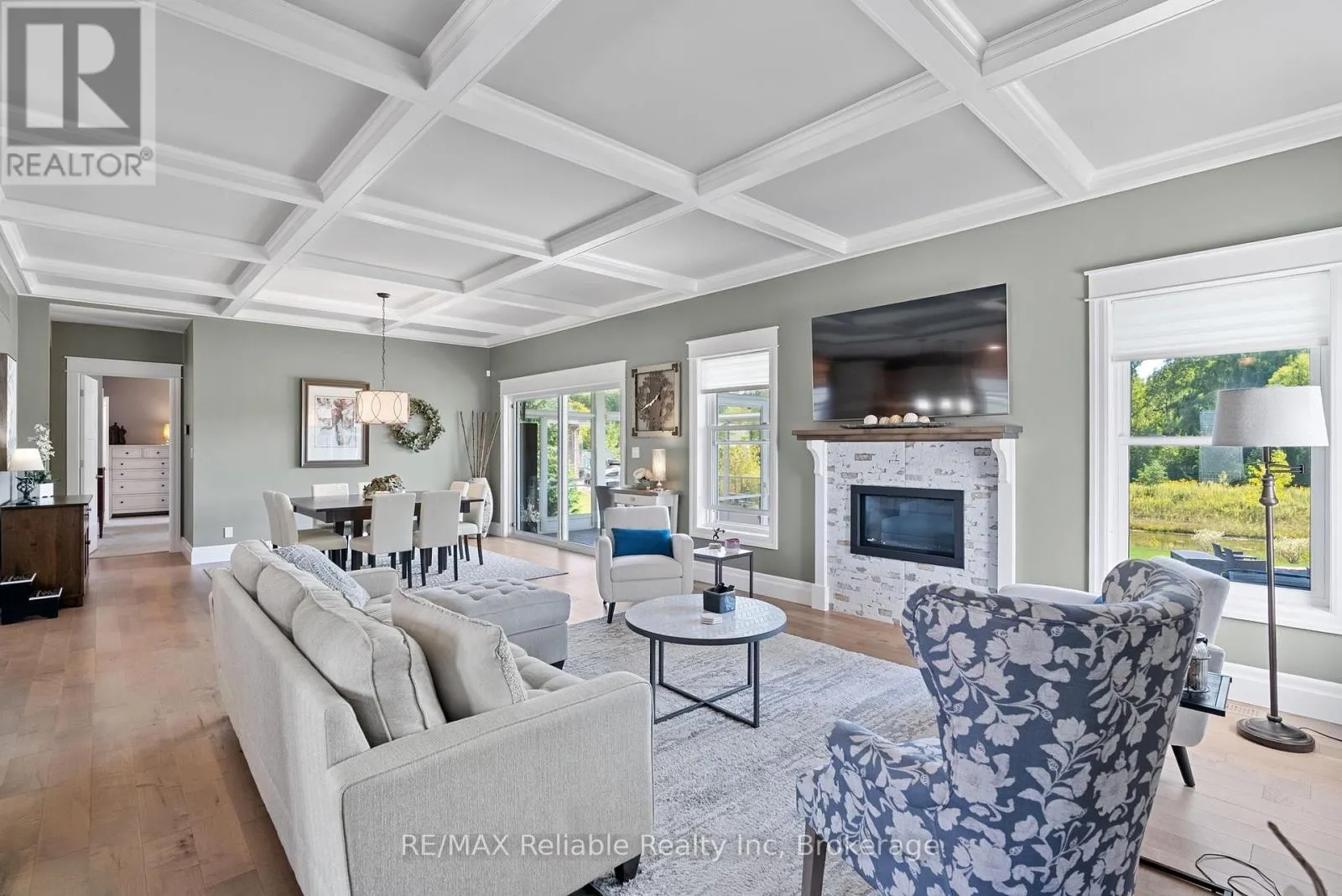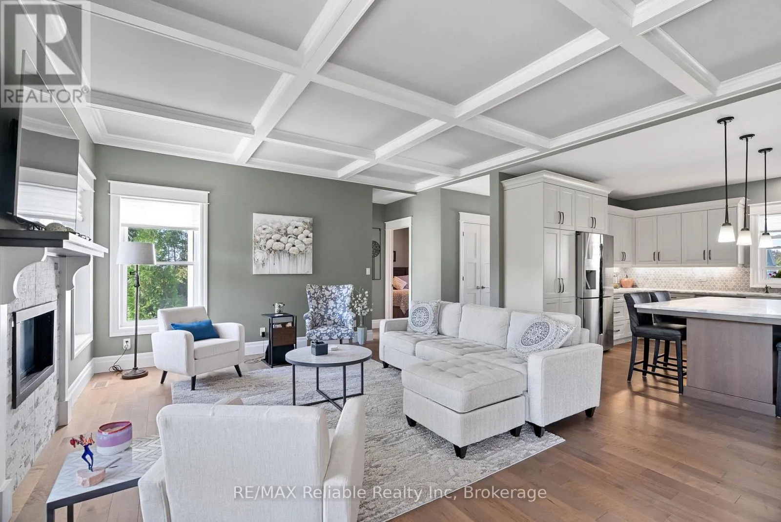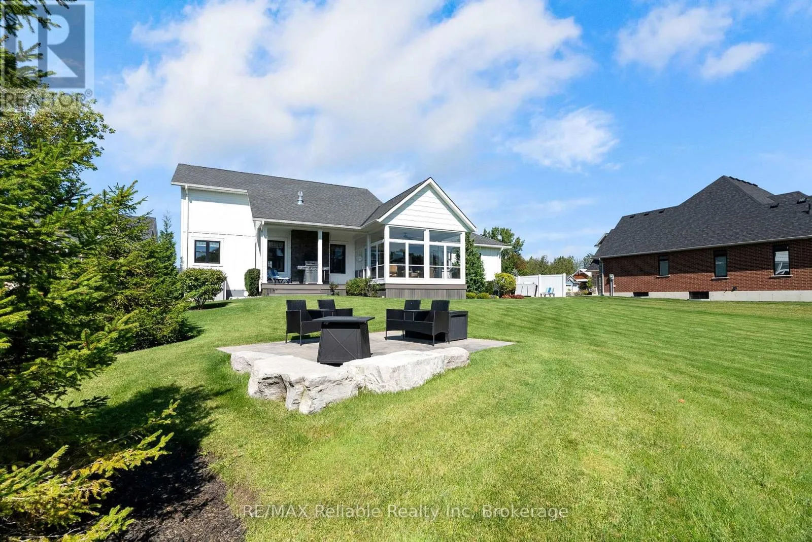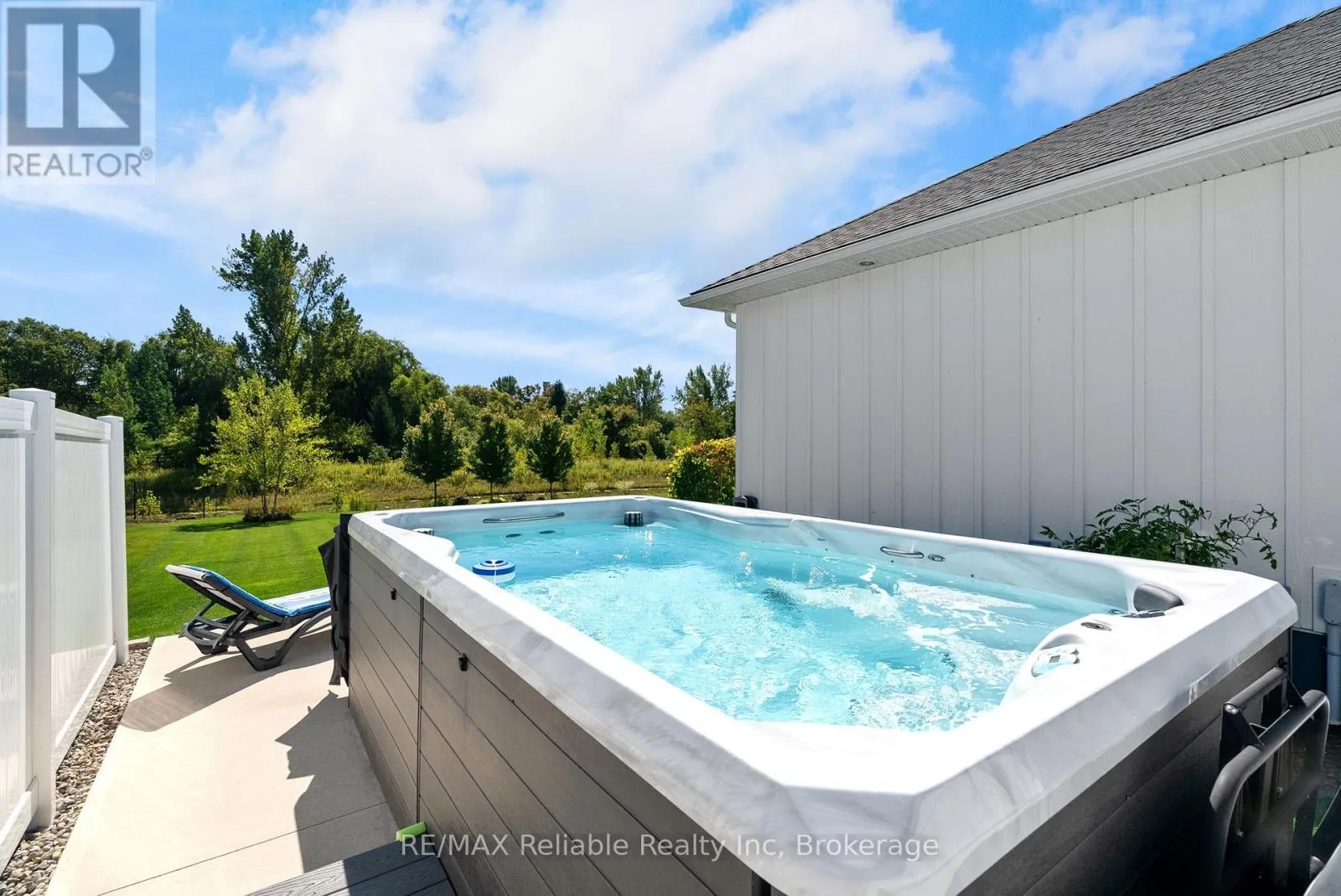 Cross Streets: Lidderdale and Fawn Creek Lane. ** Directions: Bluewater highway to Cameron Street to Lidderdale to Fawn Creek Lane. Built in 2019, this charming farmhouse-style bungalow offers exceptional curb appeal and is located on highly sought-after Fawn Creek Lane, just a five-minute walk to Bayfield's beautiful Lake Huron beaches. Step inside to an open-concept living, kitchen, and dining area featuring coffered ceilings, hardwood floors, and a cozy fireplac The kitchen is a chefs delight with granite countertops, an island with seating, built-in ovens, and an adjacent pantry. The main floor also includes a spacious primary suite with hardwood flooring, walk-in closets and a private ensuite, plus a second bedroom and full four-piece bath. The fully-finished lower level provides even more living space with a family room, two additional bedrooms, a three-piece bath, and abundant storage. Comfort is enhanced with in-floor hot water heating in both the basement and garage, as well as electric heating in the bathroom floors. Outdoors, the backyard is designed for both relaxation and recreation, overlooking a tranquil pond and featuring a private swim-spa. The attached two-car garage includes vinyl walls for easy maintenance, a workbench, and a storage area with a separate access door for lawn equipment. Located in the desirable south end, this home combines luxurious style, with casual comfort and convenience to Bayfield Main Street shops and restaurants. (id:27476)
