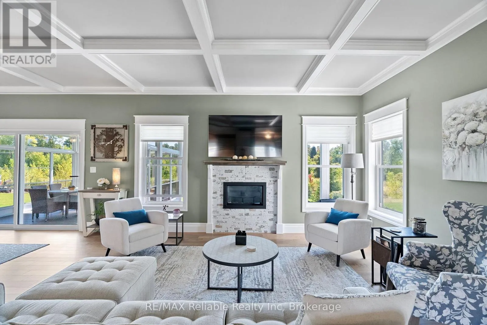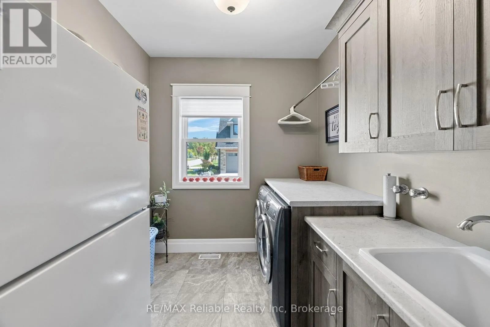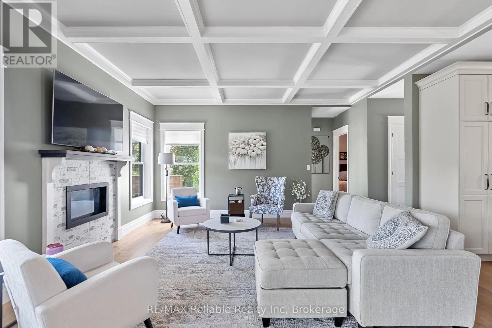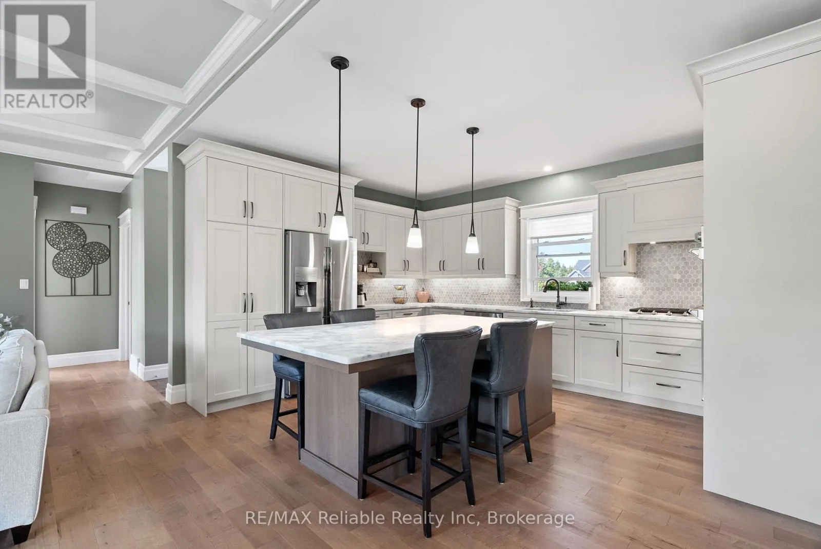 Cross Streets: Lidderdale and Fawn Creek Lane. ** Directions: Bluewater highway to Cameron Street to Lidderdale to Fawn Creek Lane. Built in 2019, this charming farmhouse-style bungalow offers exceptional curb appeal and is located on highly sought-after Fawn Creek Lane, just a five-minute walk to Bayfield's beautiful Lake Huron beaches. Step inside to an open-concept living, kitchen, and dining area featuring coffered ceilings, hardwood floors, and a cozy fireplac The kitchen is a chefs delight with granite countertops, an island with seating, built-in ovens, and an adjacent pantry. The main floor also includes a spacious primary suite with hardwood flooring, walk-in closets and a private ensuite, plus a second bedroom and full four-piece bath. The fully-finished lower level provides even more living space with a family room, two additional bedrooms, a three-piece bath, and abundant storage. Comfort is enhanced with in-floor hot water heating in both the basement and garage, as well as electric heating in the bathroom floors. Outdoors, the backyard is designed for both relaxation and recreation, overlooking a tranquil pond and featuring a private swim-spa. The attached two-car garage includes vinyl walls for easy maintenance, a workbench, and a storage area with a separate access door for lawn equipment. Located in the desirable south end, this home combines luxurious style, with casual comfort and convenience to Bayfield Main Street shops and restaurants. (id:27476)