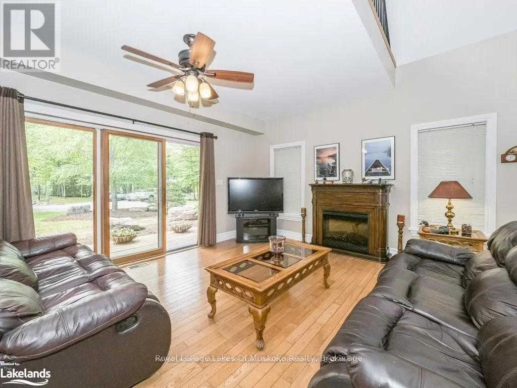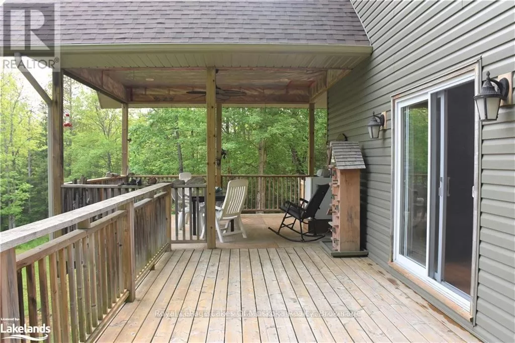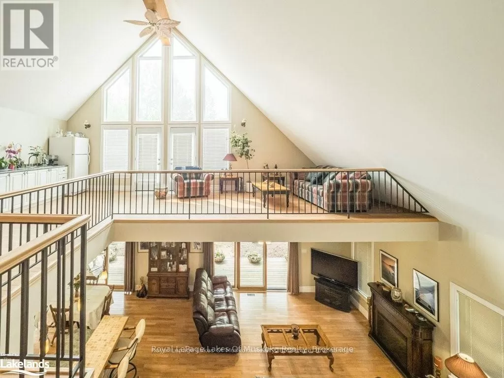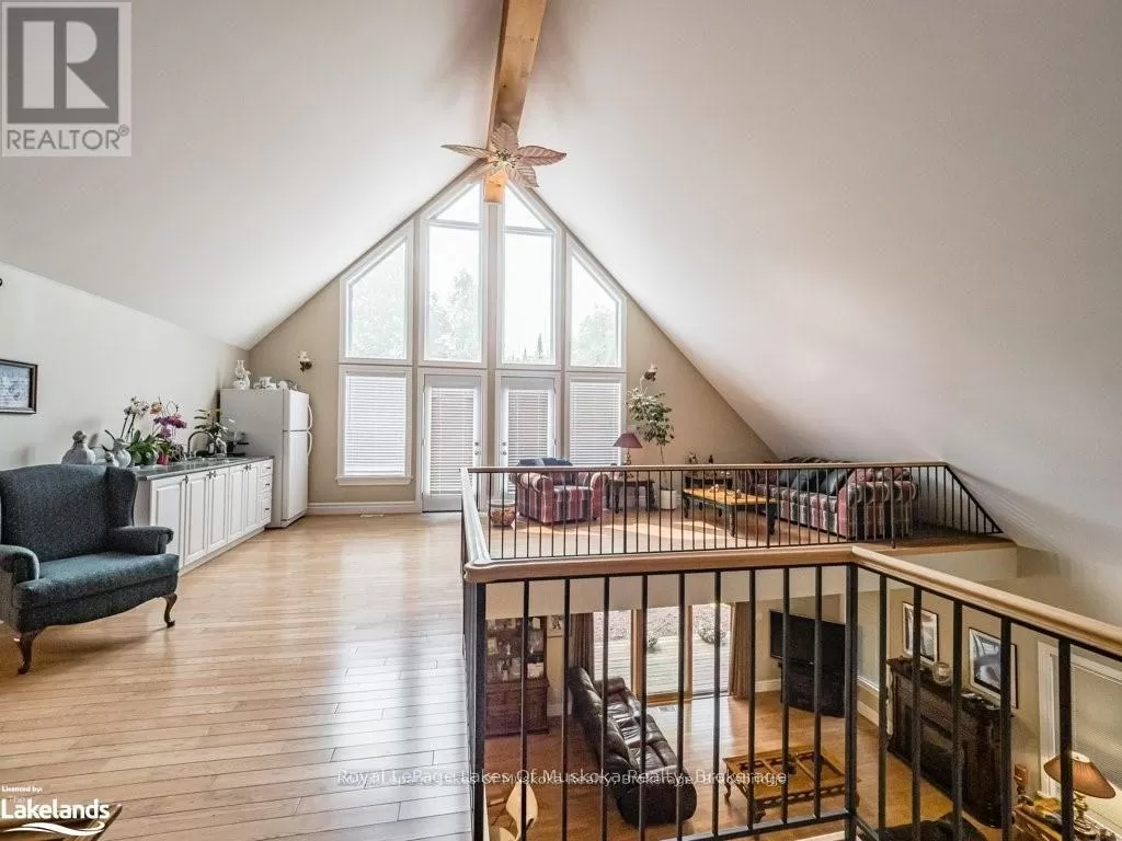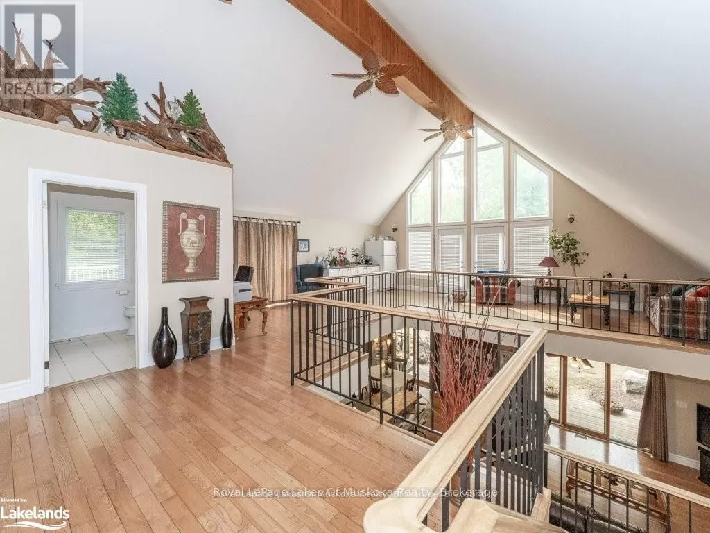Cross Streets: Hwy. 118E & Prospect Lk. Rd. ** Directions: HWY. 118 E To SOP. Offering a stunning custom-built home nestled on a private 2-acre country lot with a lovely view over a pond where the birds and wildlife like to visit. This home is large enough to share with an extended family or to host your overnight guests when they come to visit Muskoka. Enjoy the summer breeze as you relax on the huge wrap around veranda leading to a large, covered deck for dining and BBQ's. Upon entry, the home features an open concept floor plan with soaring cathedral ceilings. The primary bedroom is on the main floor with patio doors overlooking the backyard and pond leading to the back deck. There is a large main floor 4 pc. bathroom and a convenient laundry room. Upstairs is the loft with a wet bar and patio doors leading to two large balconies with beautiful views of the forest. Two additional bedrooms are also on the second level along with a 4 pc. bathroom. Gleaming red ash floors grace the principal rooms and upper level. Great potential for a 1400 sq. ft. family accomodations in the lower level, all with above grade windows to two walkouts to the backyard. A finished fourth bedroom and third 4 pc. bathroom along with an ample rec room and family room which could be finished off as a eat-in kitchen. The kitchen cabinets are not mounted but are included in the sale. There is a cute bunkie next to the house which could be used as a workshop studio or extra accommodations. All of this is only a short drive to town or a five-minute drive from the public beach on Prosect Lake where you can go for a quick dip or to launch the watercraft to go fishing. Enjoy the country lifestyle while working, living and playing in beautiful Muskoka! ** This is a linked property.** (id:27476)