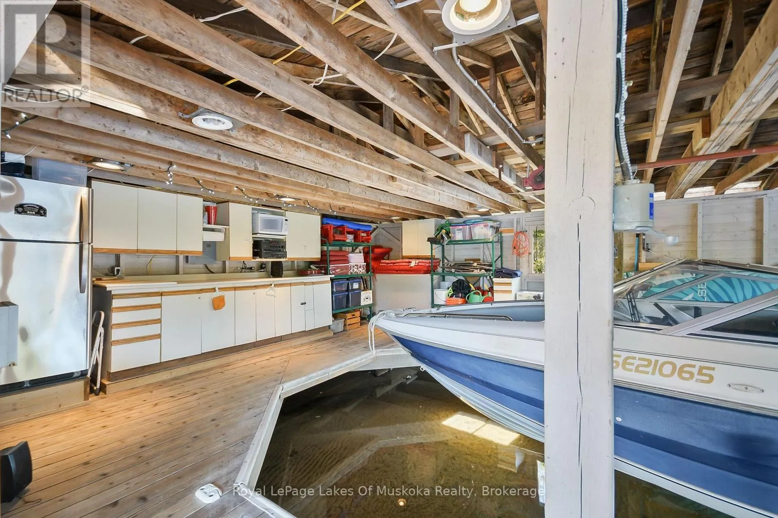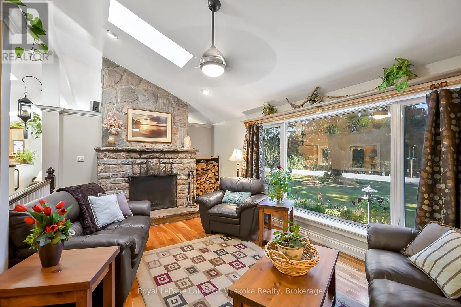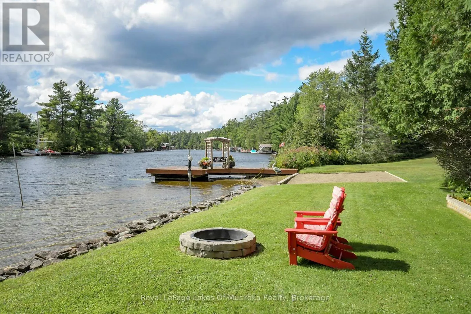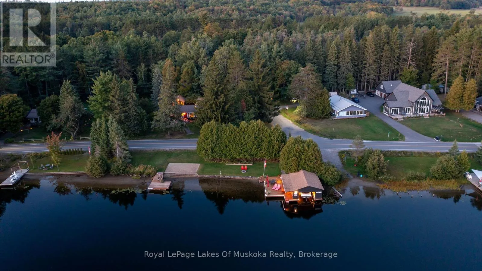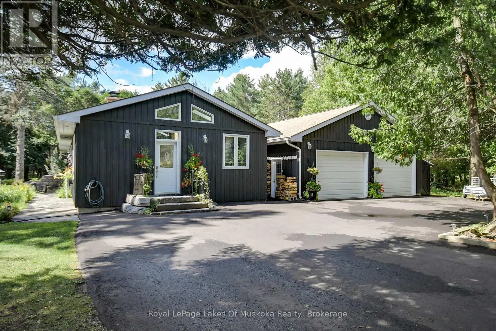 Cross Streets: Santa's Village Road to Leslie Drive. ** Directions: wellington to Santa's Village Road to Leslie (SOP). With 150 frontage accessing Lake Muskoka, a grandfathered boathouse, two docks, a fully renovated home and a guest bunkie you literally have everything that you could ever want in a Muskoka property! There is plenty of room for the whole family in a renovated home (1800 sq.ft.)+/- that boasts solid hardwood floors, large custom kitchen, granite counters with high-end appliances, PFA, CA, a stunning original stone wood burning fireplace and a recently renovated large primary suite with large custom walk-in closet, beautiful custom primary bath and walkout to the rear private hot tub retreat. The main 4 piece bath satisfies the needs of the second bedroom as well as any guests. The custom vaulted ceiling with six skylights provides natural light that adds an ambiance often enjoyed while overlooking the waters edge. Additionally the main floor offers an open, bright office. The lower level contains another bedroom, full bathroom, rec room with fireplace and a complete bar as well as an excellent storage room and full laundry room. The guest bunkie can host up to 6 people comfortably, has a 2-piece bath, propane fireplace and AC, so it is excellent for overflow guests year round. The grandfathered boathouse (2010) and two docks are positioned to offer full usage of your frontage that is level with its own beach giving ample room for enjoying every game the family wants to play. The detached oversized (900 sq.ft)+/- double garage has a 3rd garage door to the rear yard for ease of access. The property is fully landscaped and the circular driveway is newly paved. This is a location that is close to town yet just a quick ride to Lake Muskoka for all of the destination boating you could ask for. (id:27476)