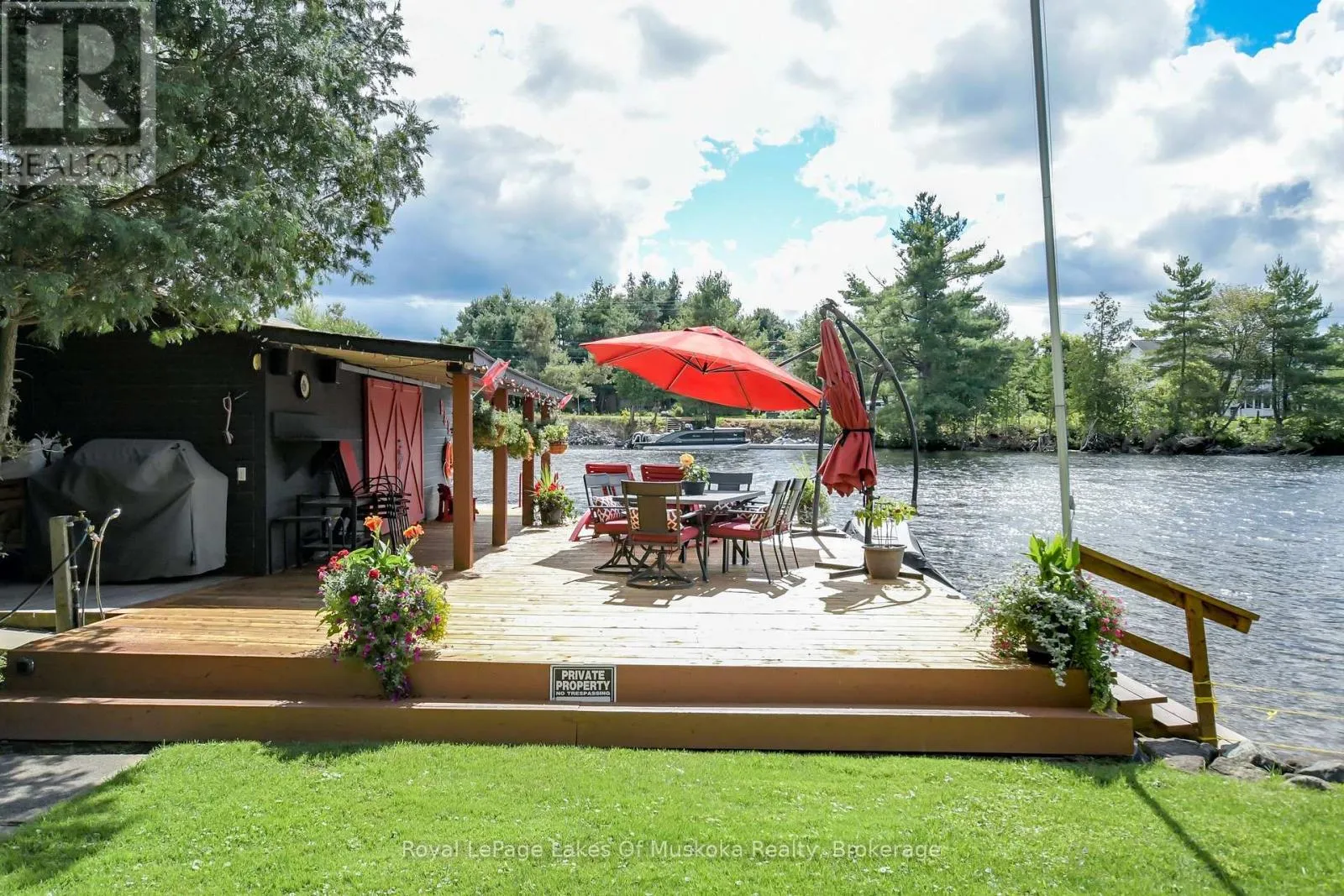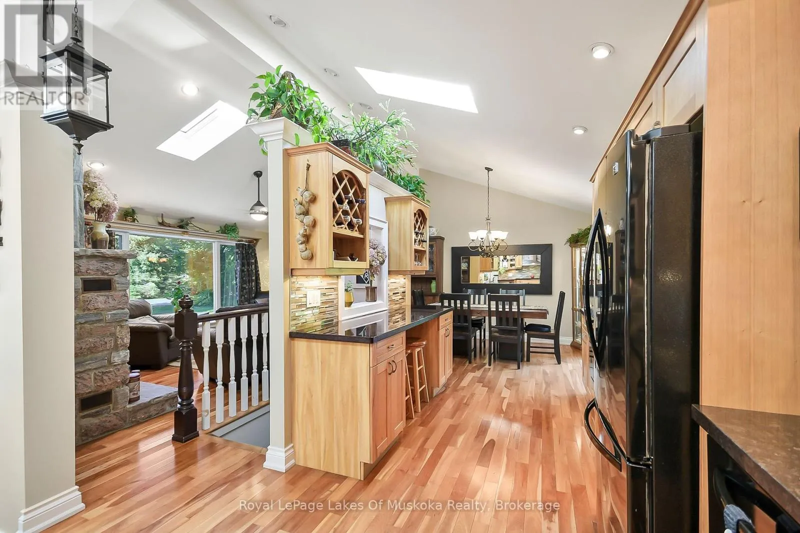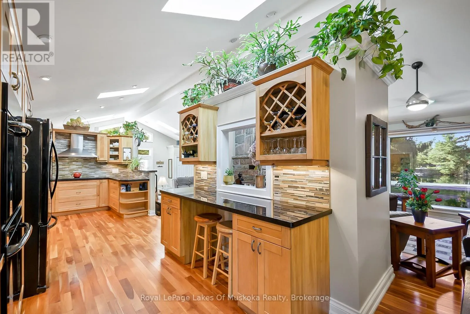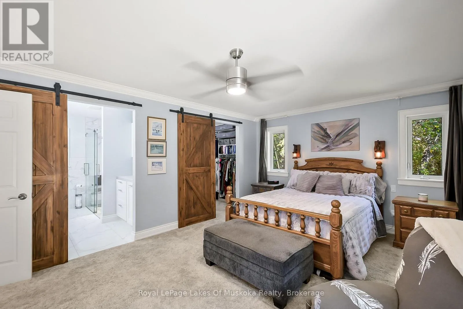 Cross Streets: Santa's Village Road to Leslie Drive. ** Directions: wellington to Santa's Village Road to Leslie (SOP). With 150 frontage accessing Lake Muskoka, a grandfathered boathouse, two docks, a fully renovated home and a guest bunkie you literally have everything that you could ever want in a Muskoka property! There is plenty of room for the whole family in a renovated home (1800 sq.ft.)+/- that boasts solid hardwood floors, large custom kitchen, granite counters with high-end appliances, PFA, CA, a stunning original stone wood burning fireplace and a recently renovated large primary suite with large custom walk-in closet, beautiful custom primary bath and walkout to the rear private hot tub retreat. The main 4 piece bath satisfies the needs of the second bedroom as well as any guests. The custom vaulted ceiling with six skylights provides natural light that adds an ambiance often enjoyed while overlooking the waters edge. Additionally the main floor offers an open, bright office. The lower level contains another bedroom, full bathroom, rec room with fireplace and a complete bar as well as an excellent storage room and full laundry room. The guest bunkie can host up to 6 people comfortably, has a 2-piece bath, propane fireplace and AC, so it is excellent for overflow guests year round. The grandfathered boathouse (2010) and two docks are positioned to offer full usage of your frontage that is level with its own beach giving ample room for enjoying every game the family wants to play. The detached oversized (900 sq.ft)+/- double garage has a 3rd garage door to the rear yard for ease of access. The property is fully landscaped and the circular driveway is newly paved. This is a location that is close to town yet just a quick ride to Lake Muskoka for all of the destination boating you could ask for. (id:27476)