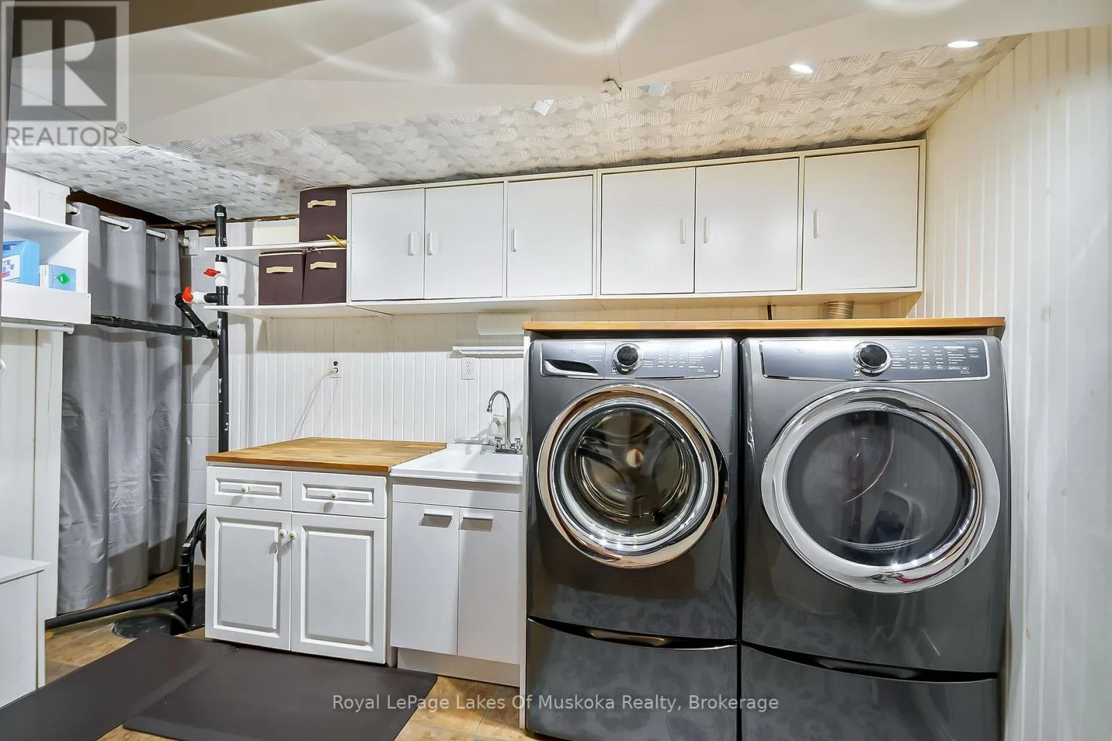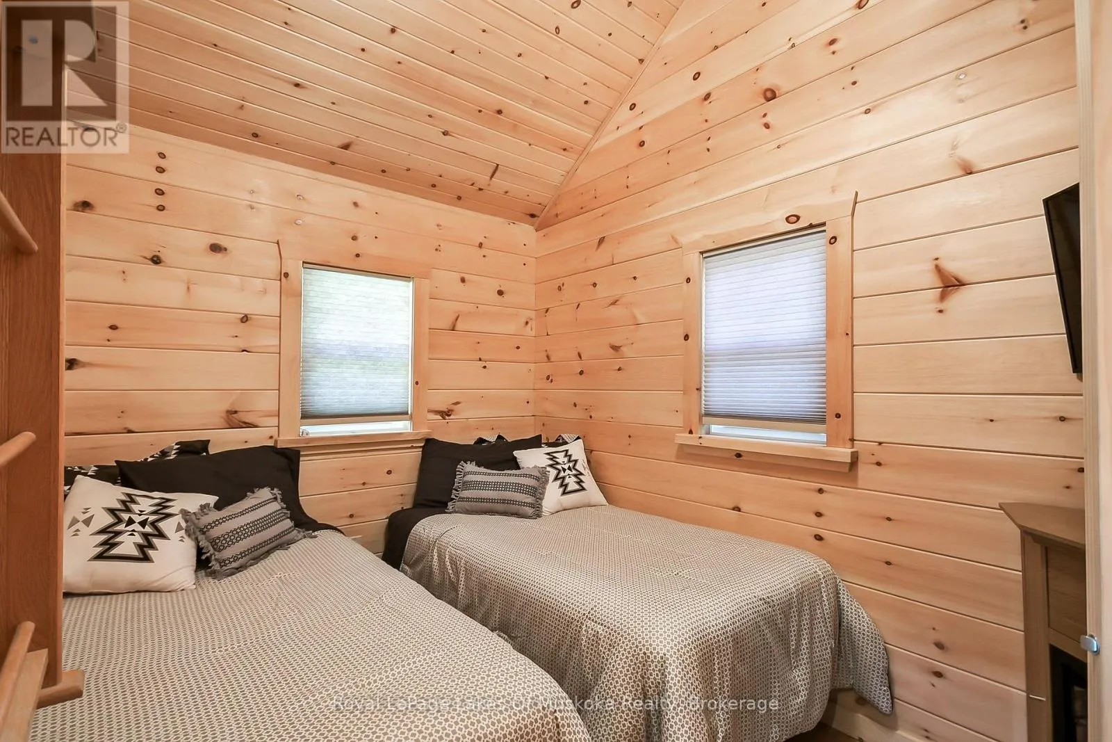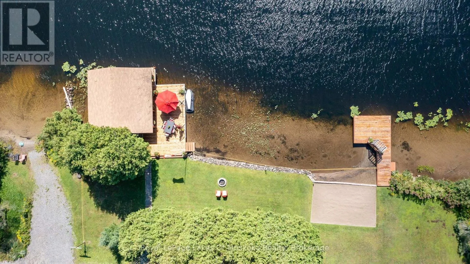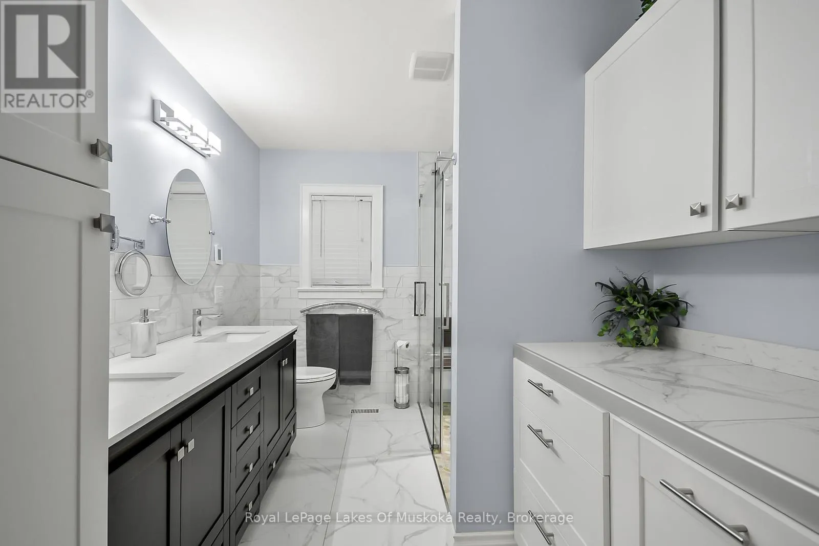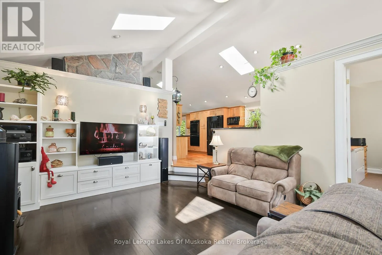 Cross Streets: Santa's Village Road to Leslie Drive. ** Directions: wellington to Santa's Village Road to Leslie (SOP). With 150 frontage accessing Lake Muskoka, a grandfathered boathouse, two docks, a fully renovated home and a guest bunkie you literally have everything that you could ever want in a Muskoka property! There is plenty of room for the whole family in a renovated home (1800 sq.ft.)+/- that boasts solid hardwood floors, large custom kitchen, granite counters with high-end appliances, PFA, CA, a stunning original stone wood burning fireplace and a recently renovated large primary suite with large custom walk-in closet, beautiful custom primary bath and walkout to the rear private hot tub retreat. The main 4 piece bath satisfies the needs of the second bedroom as well as any guests. The custom vaulted ceiling with six skylights provides natural light that adds an ambiance often enjoyed while overlooking the waters edge. Additionally the main floor offers an open, bright office. The lower level contains another bedroom, full bathroom, rec room with fireplace and a complete bar as well as an excellent storage room and full laundry room. The guest bunkie can host up to 6 people comfortably, has a 2-piece bath, propane fireplace and AC, so it is excellent for overflow guests year round. The grandfathered boathouse (2010) and two docks are positioned to offer full usage of your frontage that is level with its own beach giving ample room for enjoying every game the family wants to play. The detached oversized (900 sq.ft)+/- double garage has a 3rd garage door to the rear yard for ease of access. The property is fully landscaped and the circular driveway is newly paved. This is a location that is close to town yet just a quick ride to Lake Muskoka for all of the destination boating you could ask for. (id:27476)