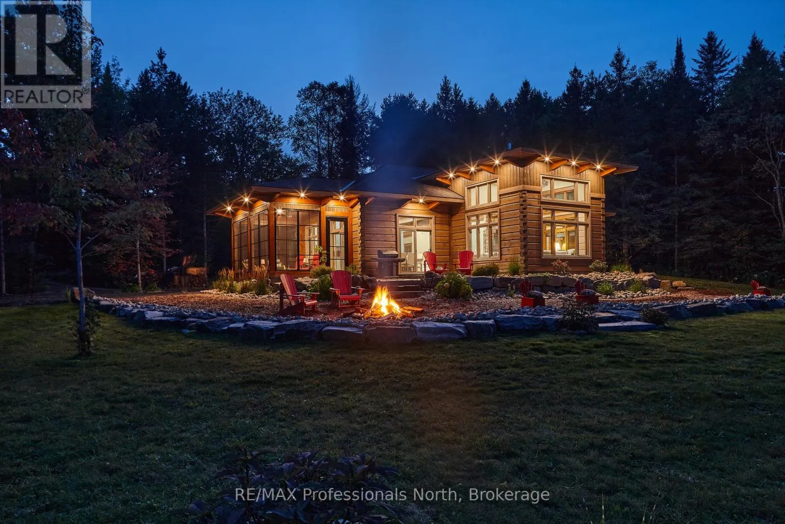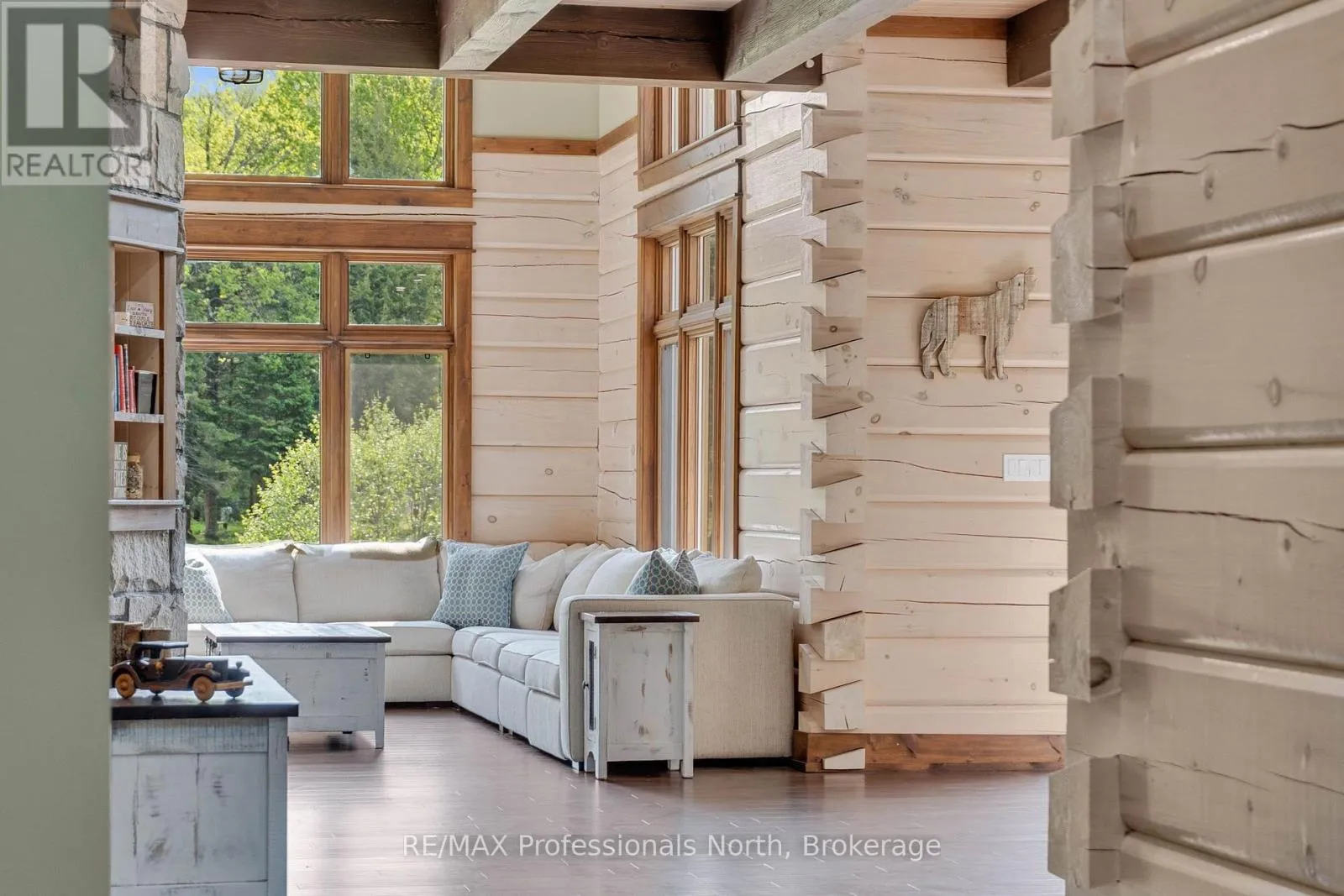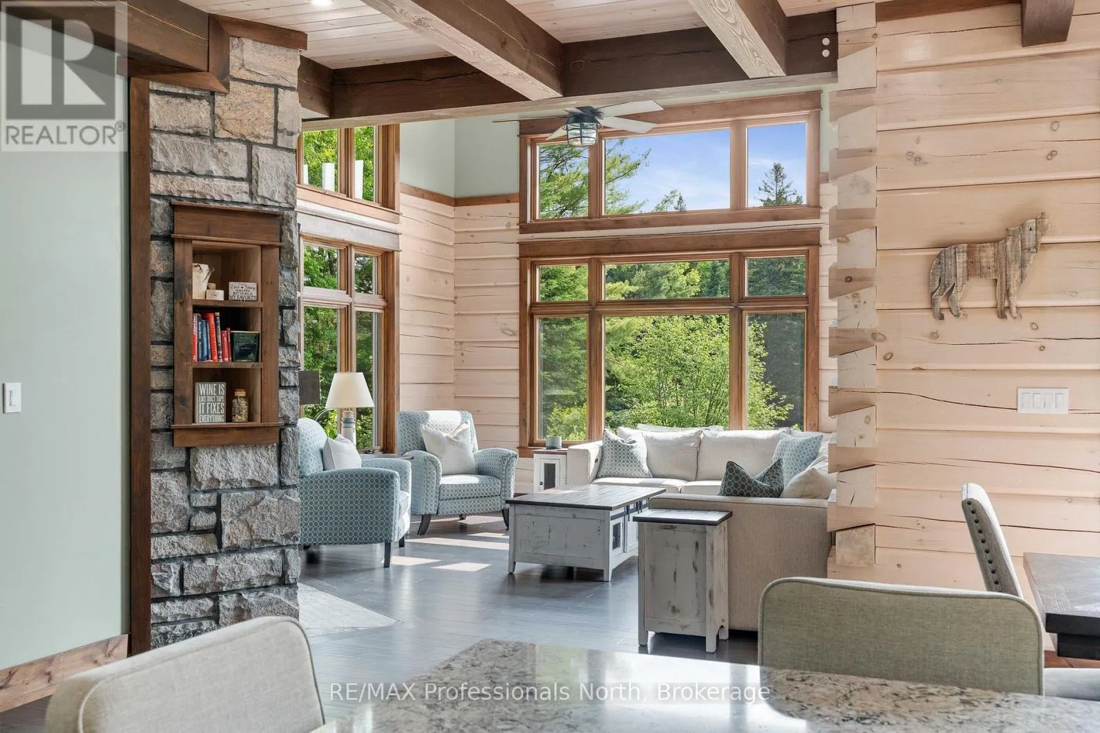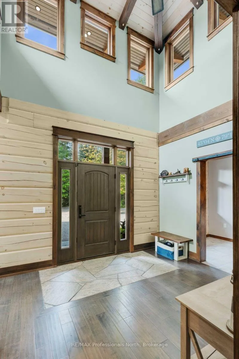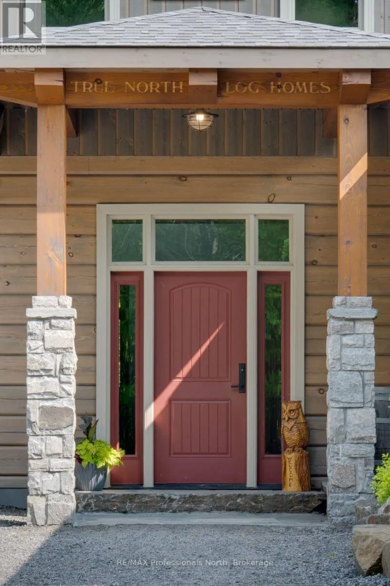 Cross Streets: Bonnell & Highfalls Road. ** Directions: HWY 11 to high falls road, left onto bonnel road, sop few houses in on left. Nestled along the pristine Muskoka River sitting on 1.37 acres and 215 feet of riverfront, just minutes from downtown Bracebridge renowned for its small town charm and as a gateway to the natural beauty of Muskoka this award-winning luxury custom log bungalow offers timeless elegance and modern convenience in a premium riverfront setting. Located just off Highway 11, the property delivers ideal accessibility while offering serene privacy that feels worlds away. Built in 2020, this meticulously crafted True North Log Home greets you with impressive curb appeal and thoughtful detail at every turn. Inside, the 8x12 white pine logs, soaring ceilings, white-washed pine accents, and rich dark wood beams set a warm and sophisticated tone. The open-concept layout features 3 spacious bedrooms and 2 full bathrooms, with radiant in-floor heating powered by a propane boiler, plus a forced-air furnace and central A/C ensuring year-round comfort. Maple flooring flows throughout, accented by granite stone and tile in the entryways and bathrooms. The chef-inspired kitchen with a 10'x5' island is perfect for entertaining gatherings of any size, while the great room showcases a stunning granite floor-to-ceiling wood burning fireplace. The Muskoka room offers a peaceful retreat to take in the sounds of nature. while the primary bedroom is a true sanctuary, complete with a walk-in closet, elegant ensuite, and a granite stone walkout to a private sunken 7x7 hot tub. Outside, professionally landscaped gardens feature natural granite, river rock, and cedar mulch. The fully insulated 26'x25' garage is not to be overlooked, offering in-floor heat, dual floor drains, 8'x9' automatic garage doors, and wired for an EV charger ideal for luxury vehicles or passionate hobbyists. (id:27476)