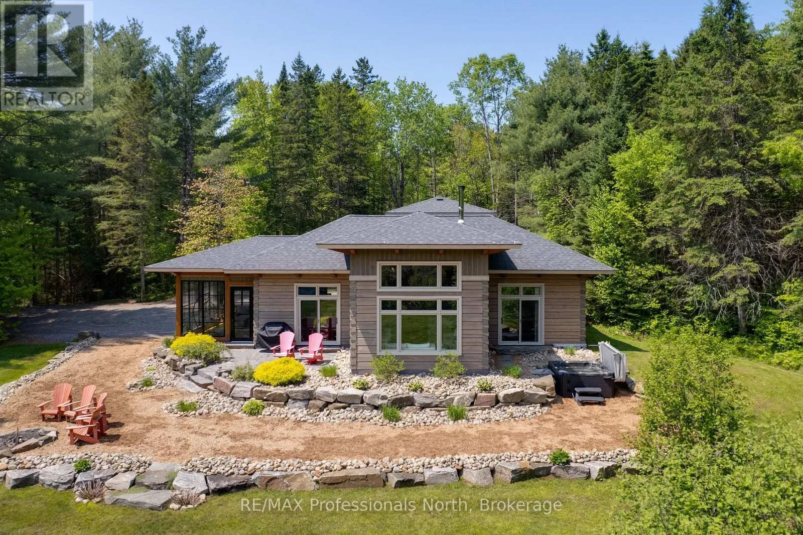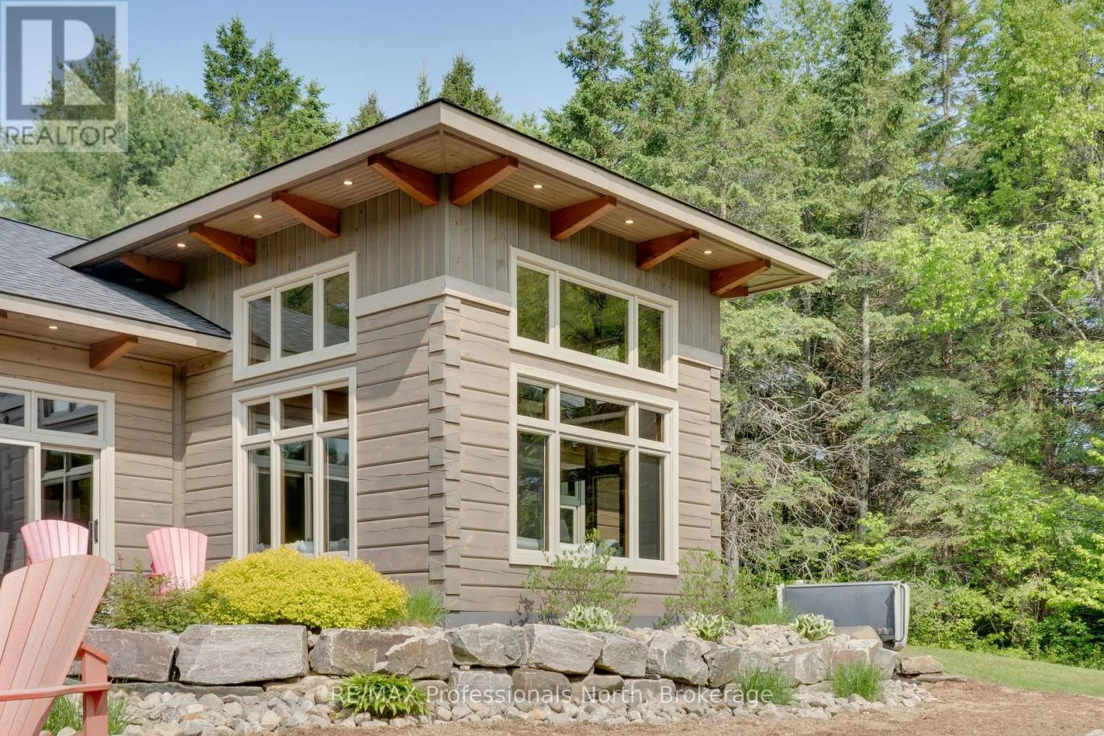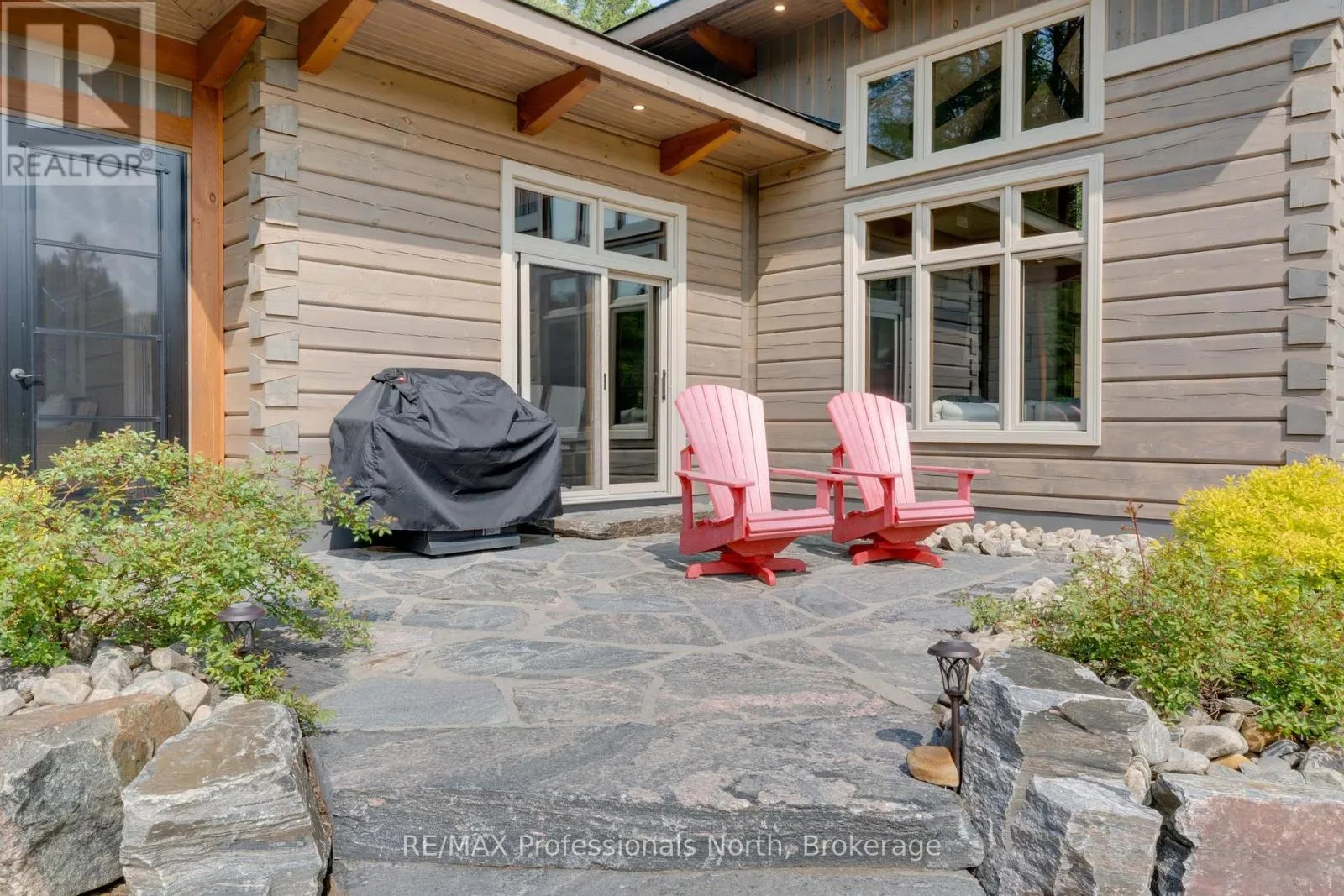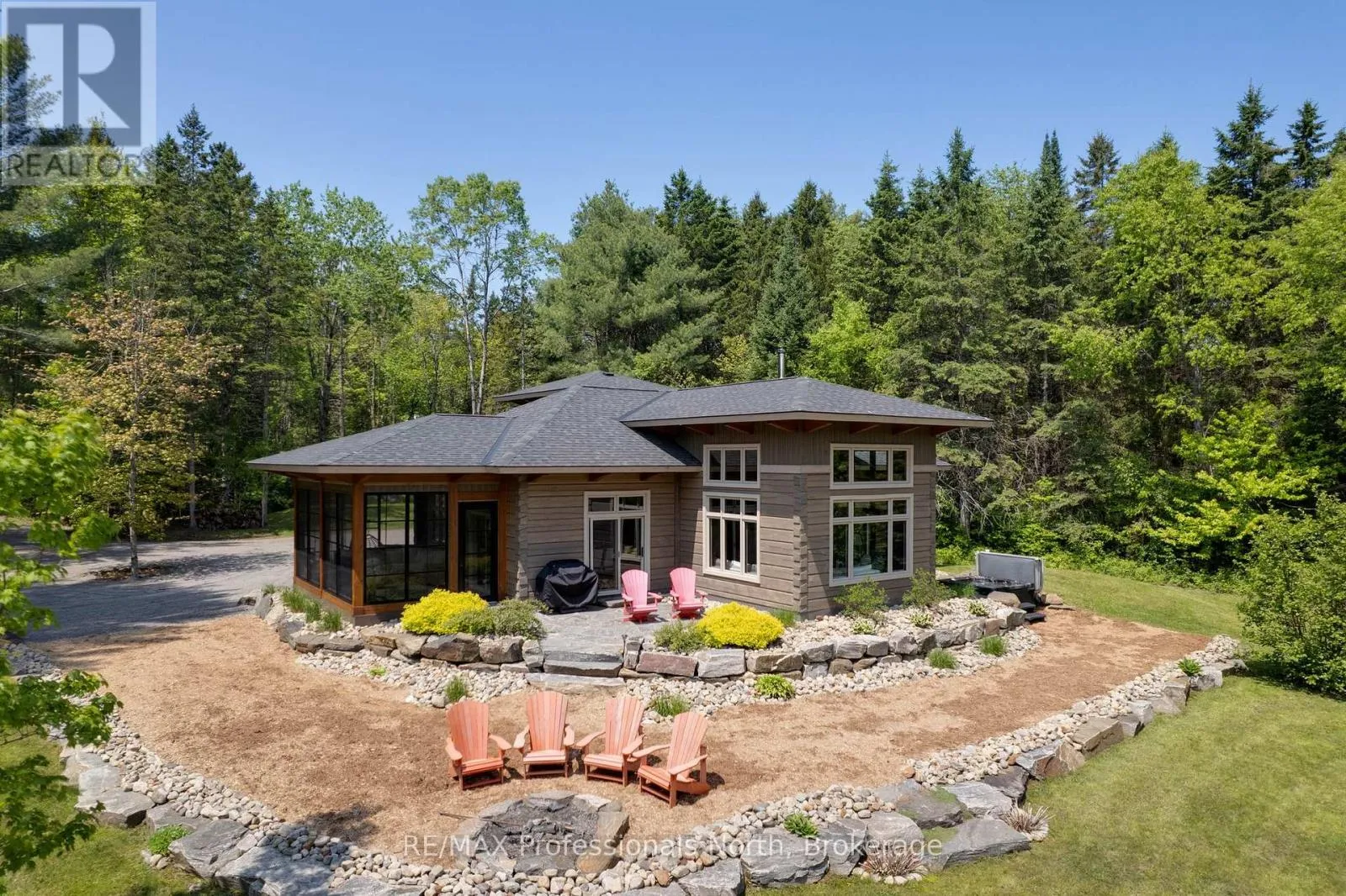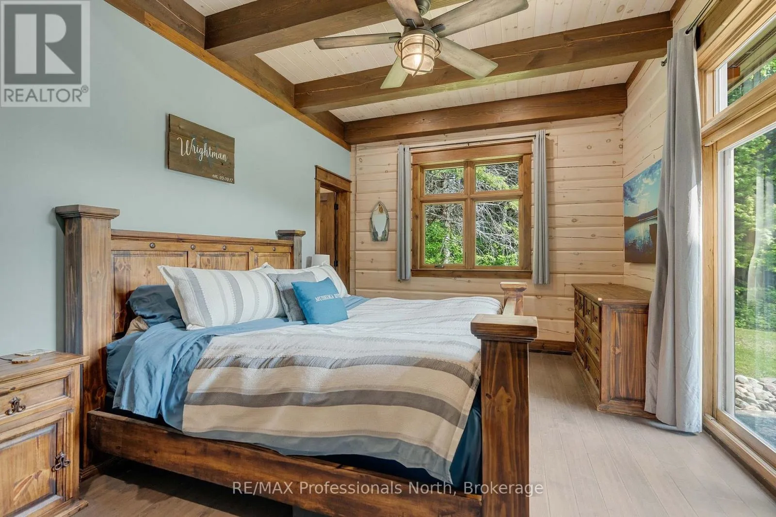 Cross Streets: Bonnell & Highfalls Road. ** Directions: HWY 11 to high falls road, left onto bonnel road, sop few houses in on left. Nestled along the pristine Muskoka River sitting on 1.37 acres and 215 feet of riverfront, just minutes from downtown Bracebridge renowned for its small town charm and as a gateway to the natural beauty of Muskoka this award-winning luxury custom log bungalow offers timeless elegance and modern convenience in a premium riverfront setting. Located just off Highway 11, the property delivers ideal accessibility while offering serene privacy that feels worlds away. Built in 2020, this meticulously crafted True North Log Home greets you with impressive curb appeal and thoughtful detail at every turn. Inside, the 8x12 white pine logs, soaring ceilings, white-washed pine accents, and rich dark wood beams set a warm and sophisticated tone. The open-concept layout features 3 spacious bedrooms and 2 full bathrooms, with radiant in-floor heating powered by a propane boiler, plus a forced-air furnace and central A/C ensuring year-round comfort. Maple flooring flows throughout, accented by granite stone and tile in the entryways and bathrooms. The chef-inspired kitchen with a 10'x5' island is perfect for entertaining gatherings of any size, while the great room showcases a stunning granite floor-to-ceiling wood burning fireplace. The Muskoka room offers a peaceful retreat to take in the sounds of nature. while the primary bedroom is a true sanctuary, complete with a walk-in closet, elegant ensuite, and a granite stone walkout to a private sunken 7x7 hot tub. Outside, professionally landscaped gardens feature natural granite, river rock, and cedar mulch. The fully insulated 26'x25' garage is not to be overlooked, offering in-floor heat, dual floor drains, 8'x9' automatic garage doors, and wired for an EV charger ideal for luxury vehicles or passionate hobbyists. (id:27476)