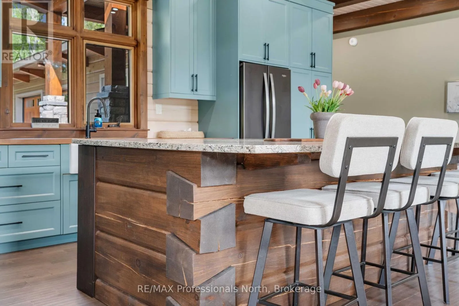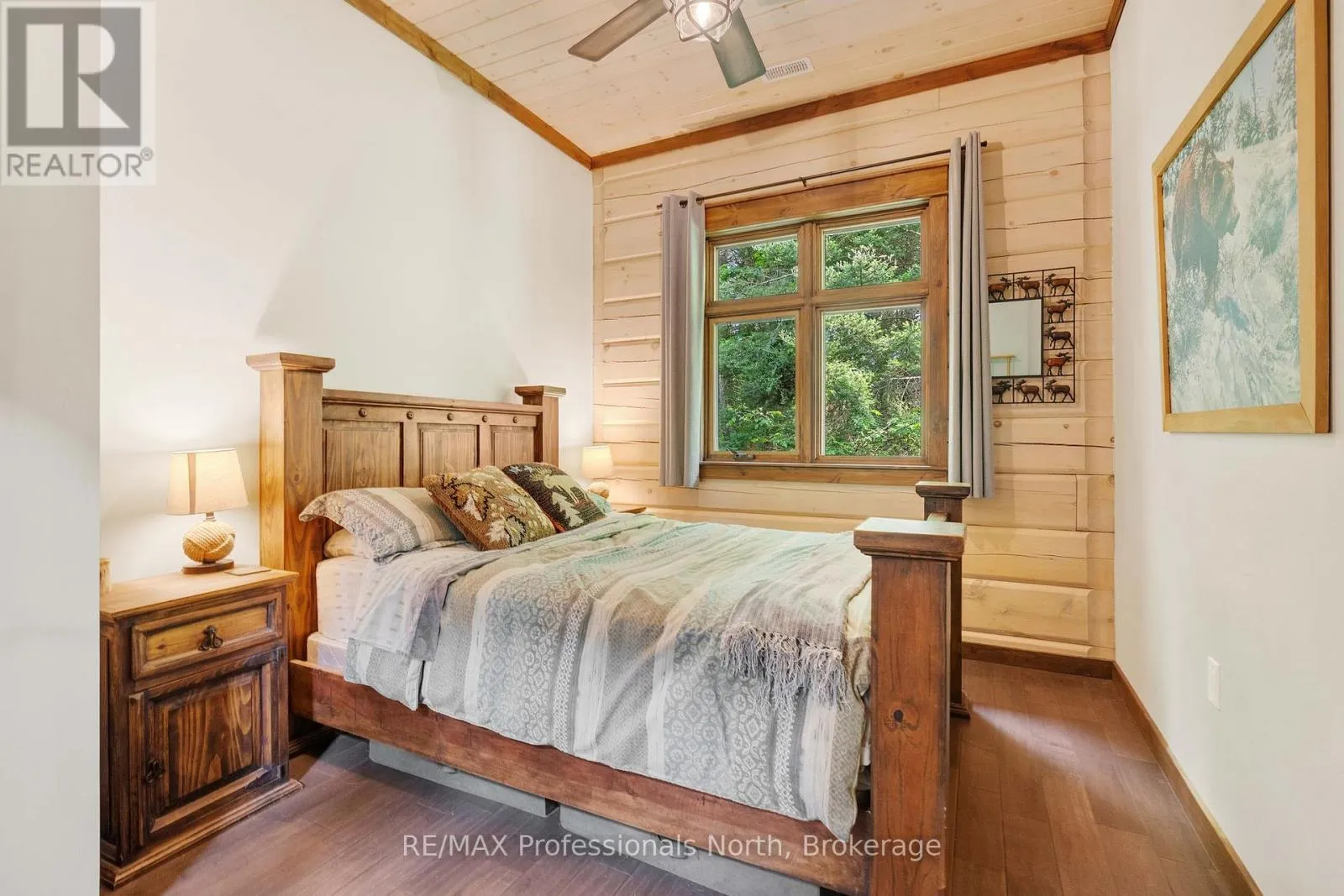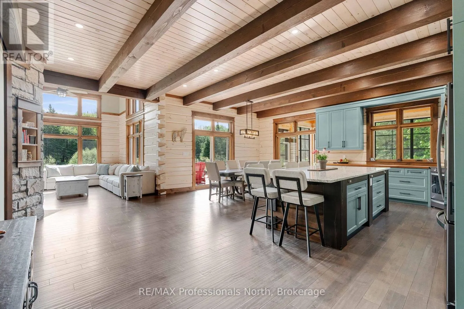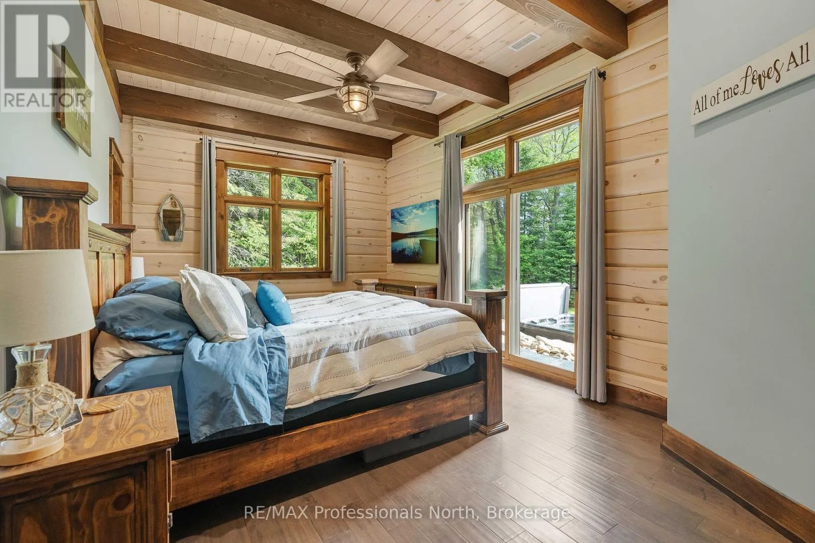 Cross Streets: Bonnell & Highfalls Road. ** Directions: HWY 11 to high falls road, left onto bonnel road, sop few houses in on left. Nestled along the pristine Muskoka River sitting on 1.37 acres and 215 feet of riverfront, just minutes from downtown Bracebridge renowned for its small town charm and as a gateway to the natural beauty of Muskoka this award-winning luxury custom log bungalow offers timeless elegance and modern convenience in a premium riverfront setting. Located just off Highway 11, the property delivers ideal accessibility while offering serene privacy that feels worlds away. Built in 2020, this meticulously crafted True North Log Home greets you with impressive curb appeal and thoughtful detail at every turn. Inside, the 8x12 white pine logs, soaring ceilings, white-washed pine accents, and rich dark wood beams set a warm and sophisticated tone. The open-concept layout features 3 spacious bedrooms and 2 full bathrooms, with radiant in-floor heating powered by a propane boiler, plus a forced-air furnace and central A/C ensuring year-round comfort. Maple flooring flows throughout, accented by granite stone and tile in the entryways and bathrooms. The chef-inspired kitchen with a 10'x5' island is perfect for entertaining gatherings of any size, while the great room showcases a stunning granite floor-to-ceiling wood burning fireplace. The Muskoka room offers a peaceful retreat to take in the sounds of nature. while the primary bedroom is a true sanctuary, complete with a walk-in closet, elegant ensuite, and a granite stone walkout to a private sunken 7x7 hot tub. Outside, professionally landscaped gardens feature natural granite, river rock, and cedar mulch. The fully insulated 26'x25' garage is not to be overlooked, offering in-floor heat, dual floor drains, 8'x9' automatic garage doors, and wired for an EV charger ideal for luxury vehicles or passionate hobbyists. (id:27476)