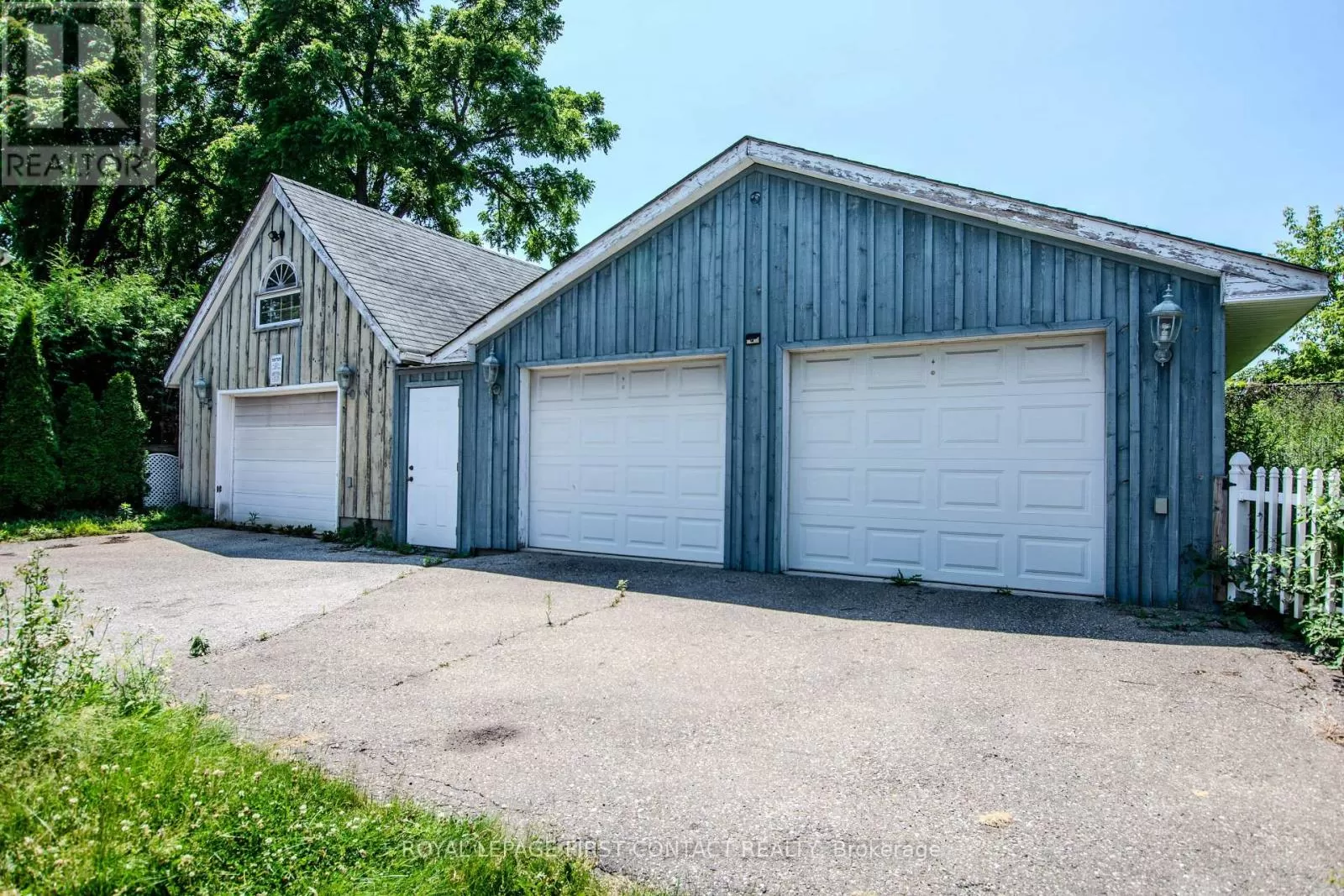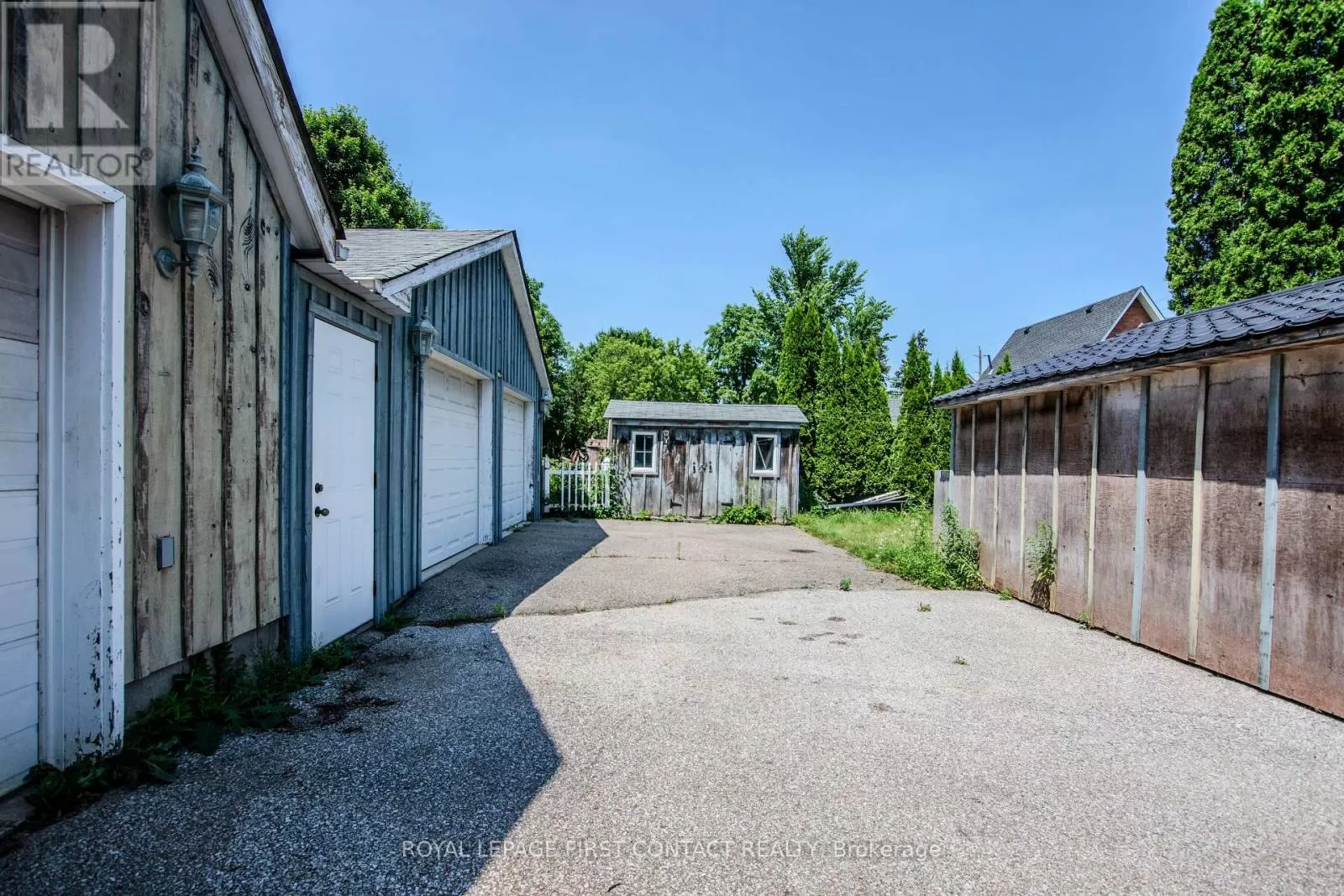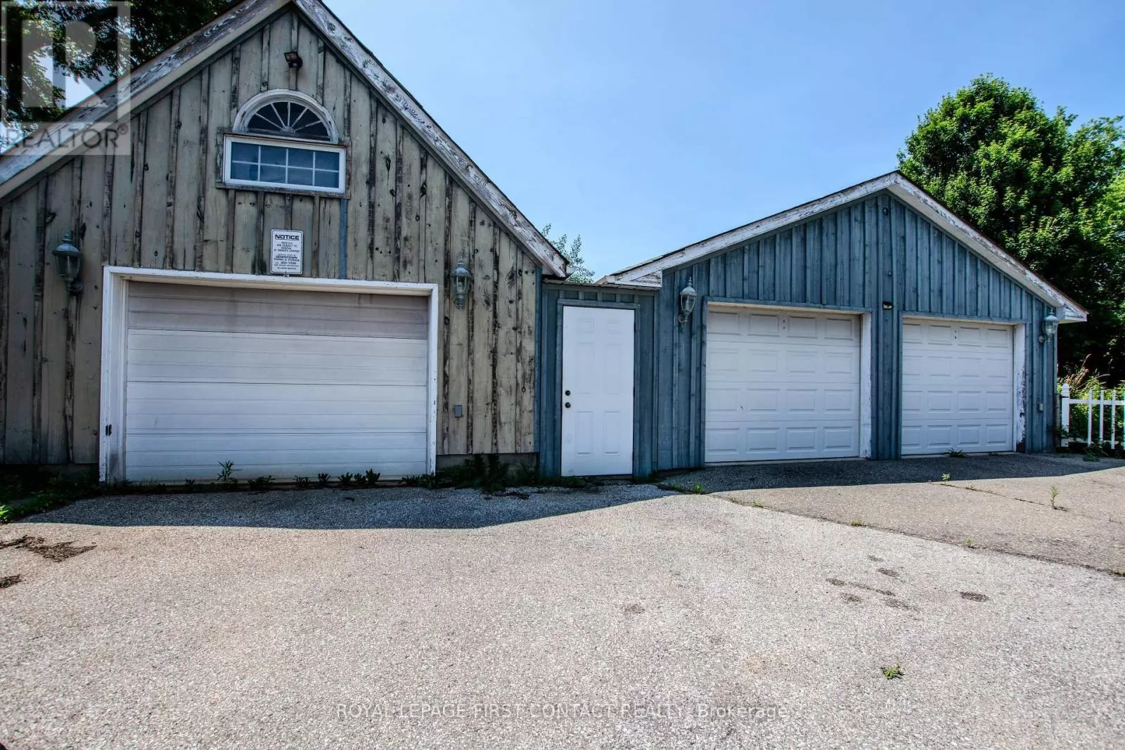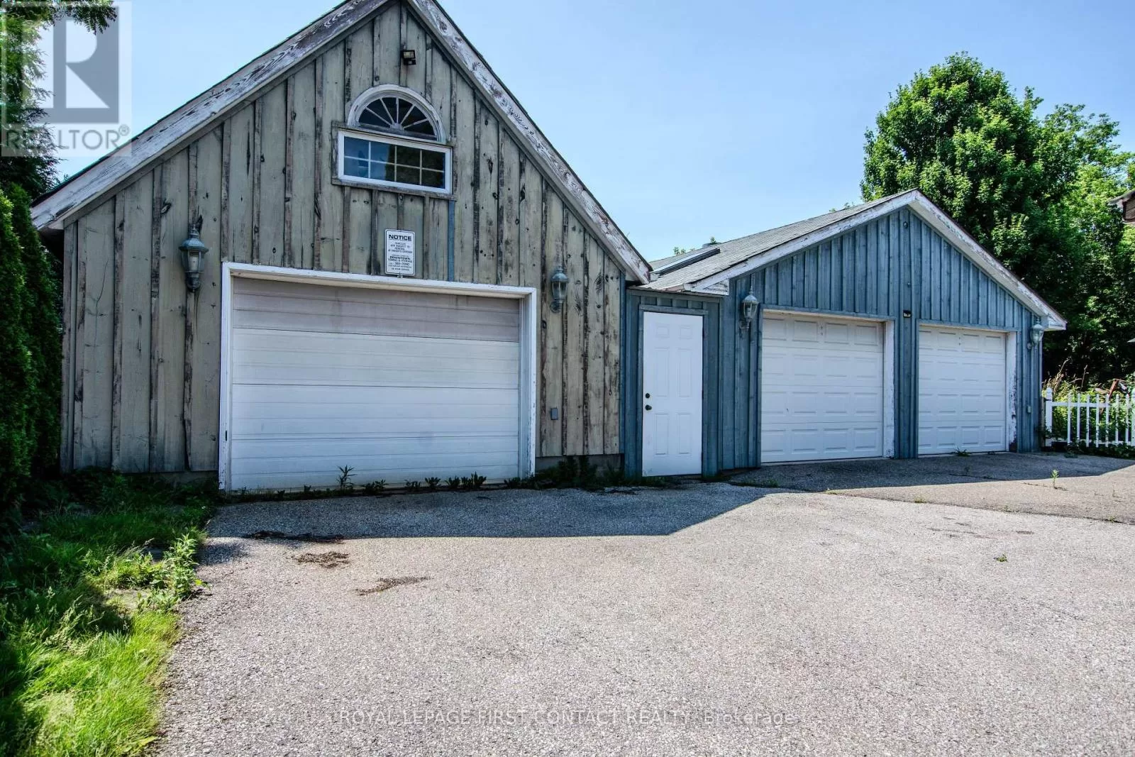 Cross Streets: Simcoe Rd.4 & Holland St. W. ** Directions: Simcoe Rd.4 - Holland St. W. Home and workshop! This two-story century home is ideally located close to schools, parks, and all the amenities Bradford has to offer. Set on a fenced lot with mature trees. A paved single driveway two garages, plus an additional outbuilding offering two extra parking spaces or storage. The south side garage is a single-car unit with an insulated loft, concrete floor, separate hydro panel perfect for a workshop or studio. The north side garage is a double-car, fully insulated and heated space featuring floor heating, a spray booth, hot water heater, (owner-built return air system). Ideal for hobbyists . Inside the home, you'll find hardwood floors and some distinctive trim. A large kitchen with skylights and walkouts to two porches - ideal for entertaining or enjoying your morning coffee. Main floor 3-piece bath with skylight and walk-in shower. The beautiful den boast ornate wood paneling, built-in shelving, and a cozy woodstove . Spacious upper level primary bedroom with hardwood flooring. Two additional bedrooms, both with hardwood-one with a walk-in and skylight. 3-piece upper bathroom with tub and skylight. Additional features include a garden shed and multiple porch spaces perfect for relaxing or gathering with family and friends. This one-of-a-kind property offers a rare combination of historic charm and man cave bliss. Ready and waiting for your ideas, TLC and upgrades. Imagine the possibilities here for your family. (id:27476)