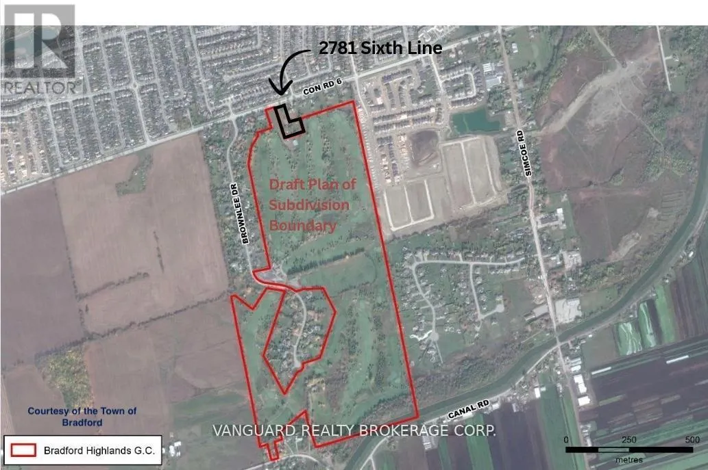 Line 6/ 10 Sideroad A prime investment opportunity to acquire 1.631 acres of land located at the main entrance of Bradford's largest upcoming residential subdivision with 998 homes, the Bradford Highlands(former Bradford Highlands Golf Course). This exceptional corner lot boasts over 110 feet of frontage on Sixth Line and over 427 feet along the future main entrance of the subdivision,offering high visibility and exposure. Strategically positioned within a rapidly growing community, this property presents endless potential for future development, including commercial use, a small plaza, gas station, or residential projects (subject to approvals). With ongoing residential expansion and a surging local population, this parcel offers outstanding potential for investors and developers seeking to establish a presence in one of Bradford's most desirable growth areas.Its size, location, and direct adjacency to new subdivision lands make it a valuable long-term addition to any real estate portfolio. A 5 bedroom, 2-storey home with over 2,300 sq. ft. of above-ground living space adds further value to the property ideal for rental income or as a comfortable residence while capitalizing on future development potential. (id:27476)