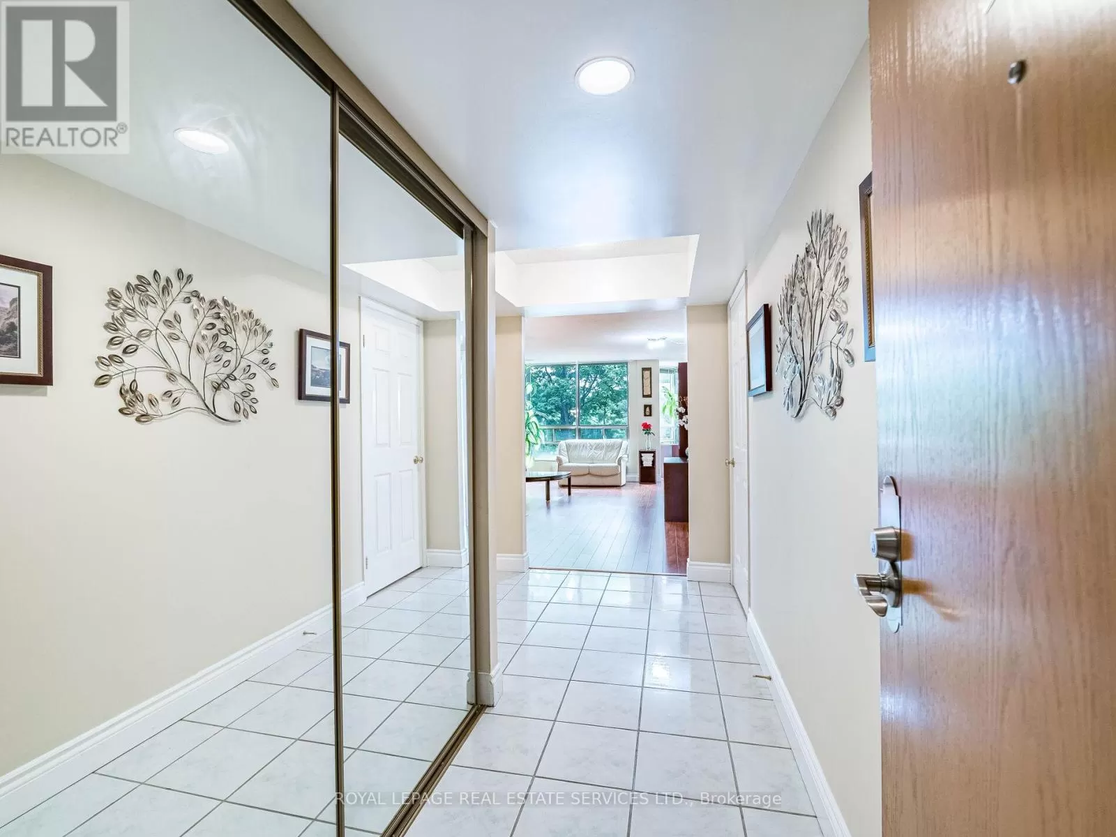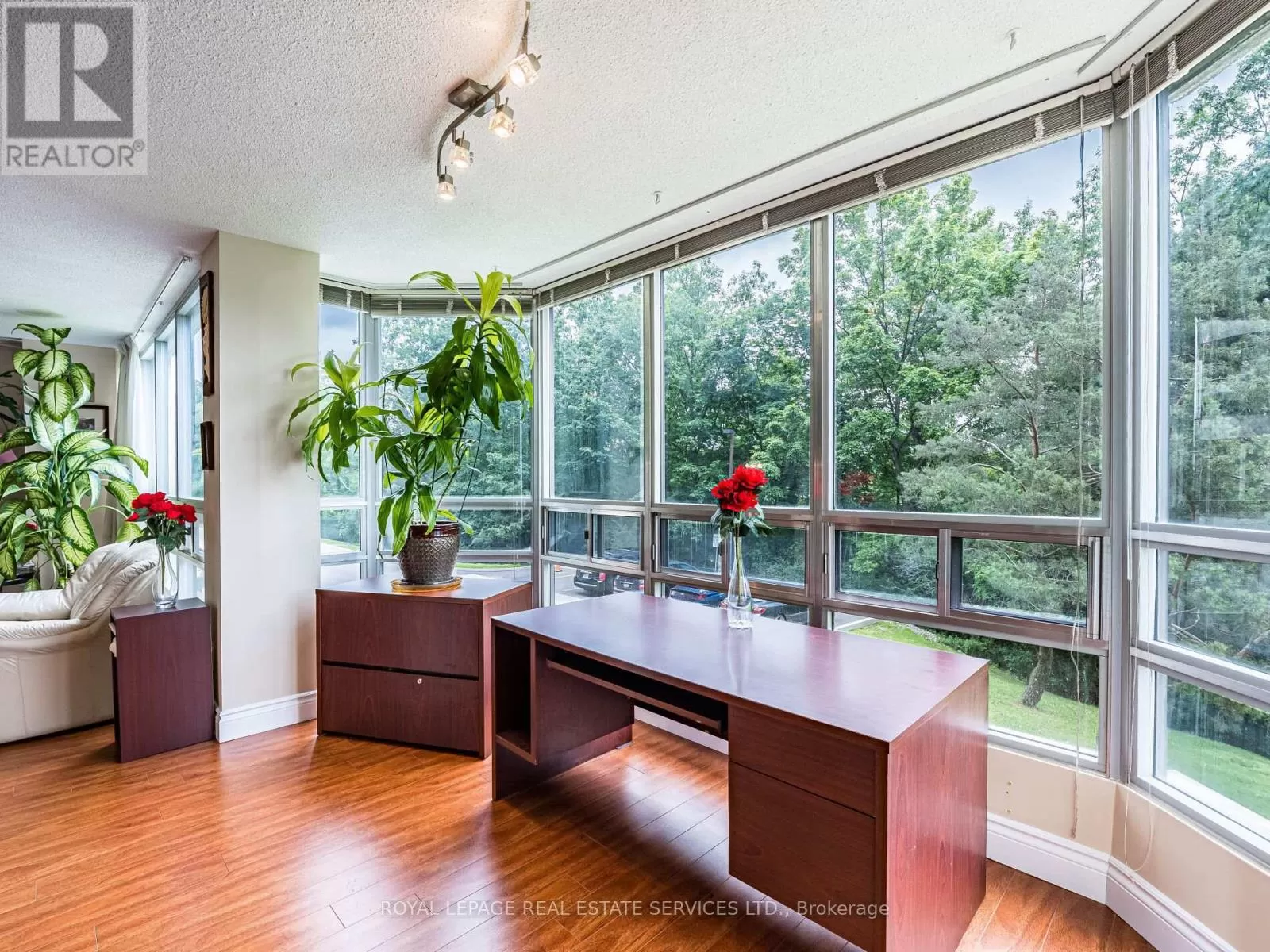 Main Street South/ Elgin Drive Welcome to Pinnacle I a rare gem nestled above the tranquil Etobicoke Creek ravine. This exceptionally well-maintained unit (1,280 sq. ft. as per MPAC) is located in one of the areas most established and desirable buildings. Featuring a bright, spacious layout with expansive southeast views, this home offers both comfort and elegance. The modern kitchen includes a charming built-in China cabinet and opens seamlessly into a generous living and dining area filled with natural light and surrounded by lush greenery. Ideal for a variety of lifestyles, the unit offers, an open concept living space with two full bathrooms including a private ensuite with a separate shower and double closets in the primary bedroom. The second area currently used as an office can easily be closed off to become a second bedroom (currently open). The solarium makes an excellent home office, reading nook, or guest space. Additional conveniences include an in-suite laundry room with washer and dryer, two underground parking spaces, and two storage lockers. Pinnacle I is known for its top-tier amenities and warm community atmosphere. Enjoy 24-hour concierge service, a recently renovated indoor pool, men's and women's saunas, two fully equipped fitness rooms, a tennis court, games room, party/meeting rooms, a crafts room, and a beautiful outdoor barbecue and garden area perfect for entertaining. Located in a peaceful residential enclave with easy access to Gage Park, GO transit, major highways, public transit, Sheridan College, schools, shopping, dining, golf courses, and scenic walking and biking trails, this home truly offers the best of lifestyle and location. Don't miss your opportunity to own a piece of this exceptional community! (id:27476)