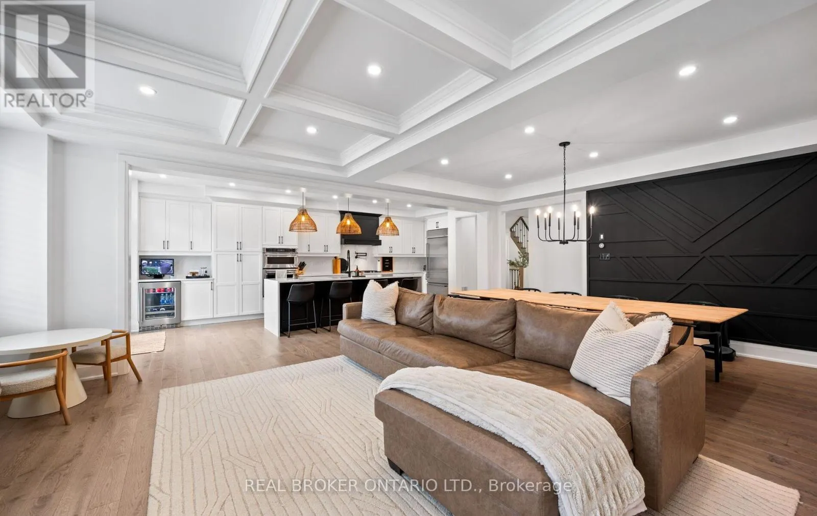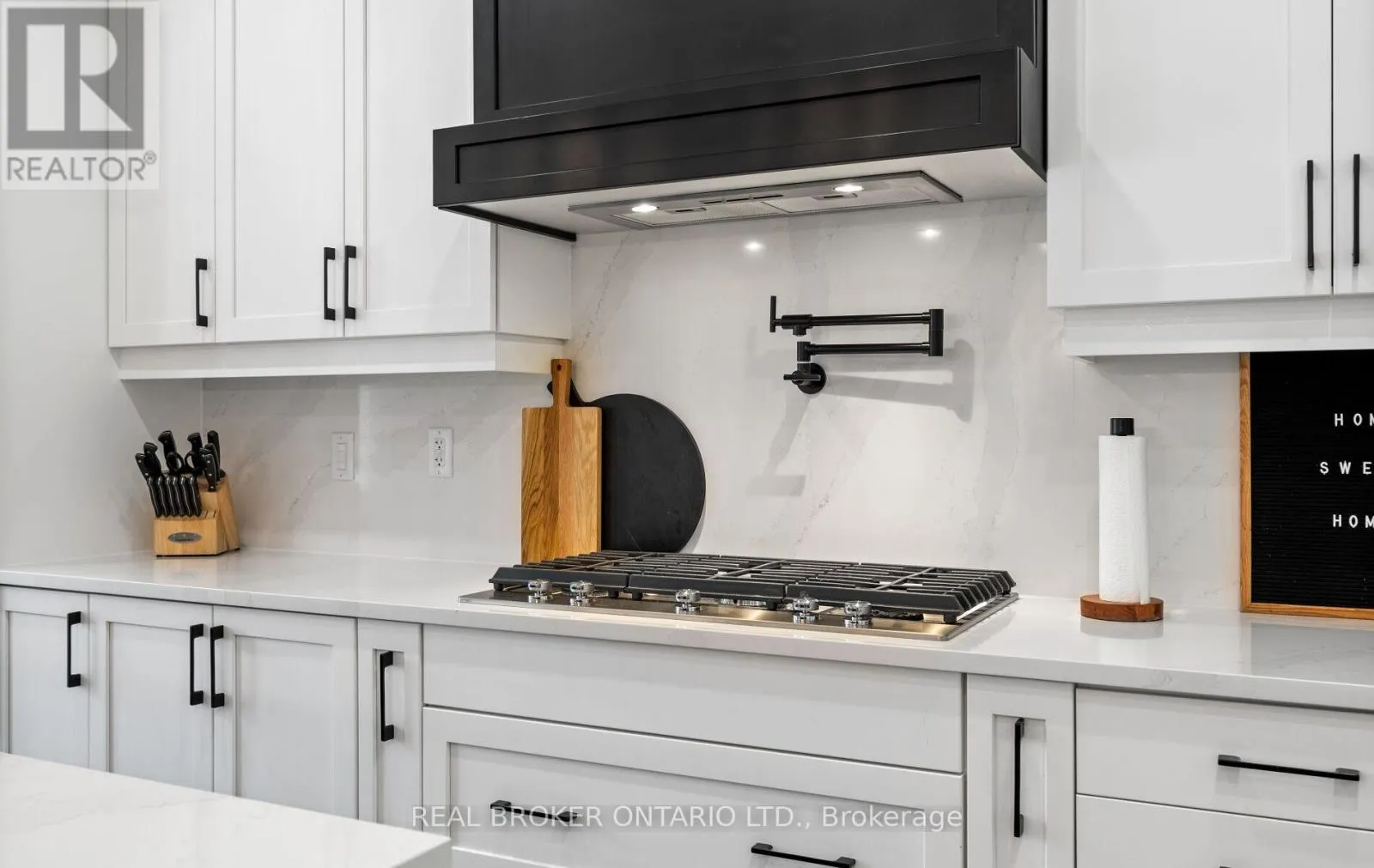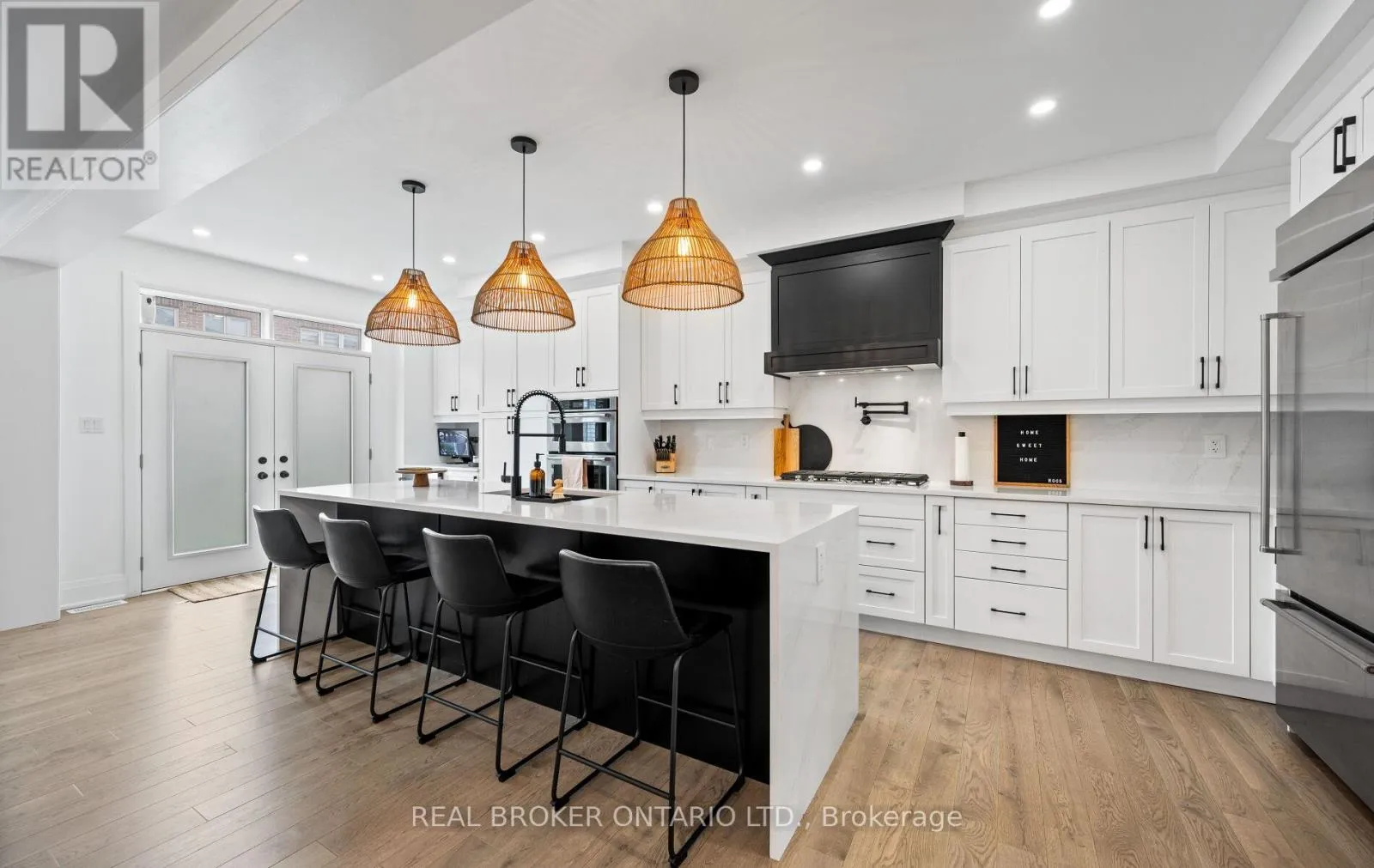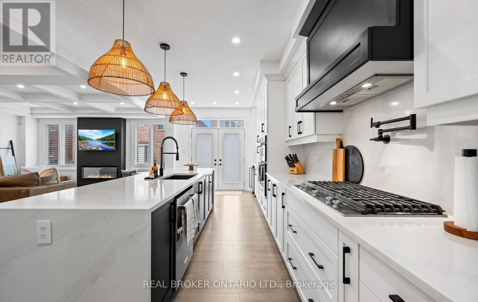 Cross Streets: Veterans/Mayfield. ** Directions: Northwest. Welcome to this beautifully upgraded 4-bedroom, 4-bathroom home offering 2656 sq ft of refined living space in Northwest Brampton. From the moment you walk through the double door entry, you're greeted with style and function. The open-concept main floor features 9-ft ceilings, 2x2 porcelain tiles, rich hardwood floors, and a waffle ceiling with pot lights. A bold black accent wall surrounds the cozy gas fireplace, adding depth and contrast to the space. The custom kitchen is the heart of the home, boasting extended cabinetry to the ceiling, a built-in wall oven, gas cooktop, custom hood with pot filler, and a stunning waterfall quartz island perfect for family living and entertaining. French doors lead to the backyard for seamless indoor-outdoor flow .Upstairs, you'll find continued luxury with 9-ft ceilings, 12x24 upgraded tiles, and hardwood floors throughout no carpet. The primary suite offers a coffered ceiling, his & hers walk-in closets, and pendant lighting. The en-suite features an oversized custom shower and upgraded finishes. Three of the four bedrooms include built-in closets, plus a convenient upstairs laundry room. All bathrooms feature quartz countertops, undermount sinks, upgraded faucets, and taller vanities. Additional highlights include: 8-ft solid shaker-style doors Upgraded baseboards & casings, Mudroom with built-in cabinets, Rod iron staircase pickets, Black hardware & upgraded light fixtures throughout. Side door entrance & cold cellar, and Exterior security cameras. Perfectly located near schools, parks, and everyday essentials this move-in-ready home checks every box. (id:27476)
