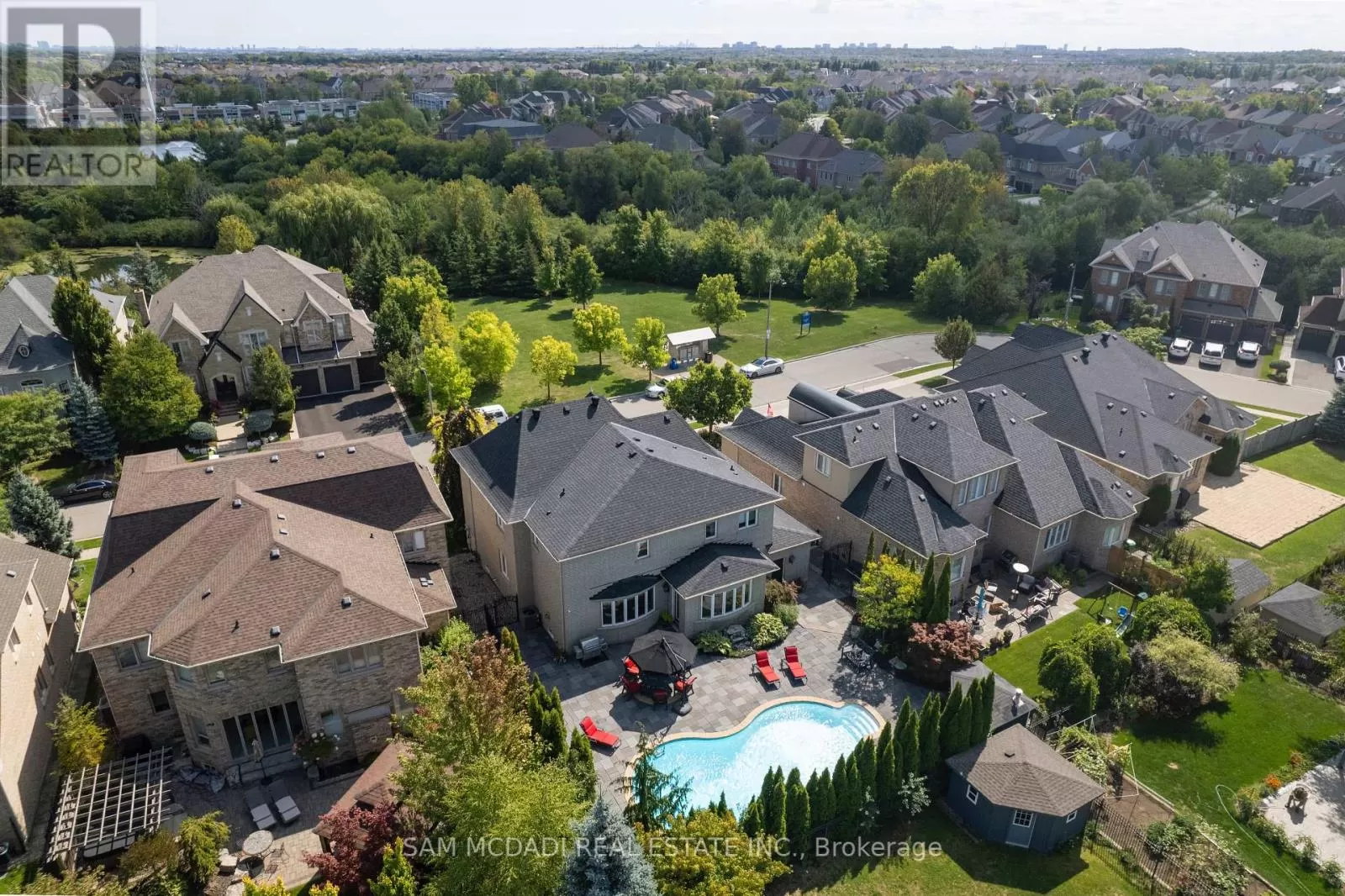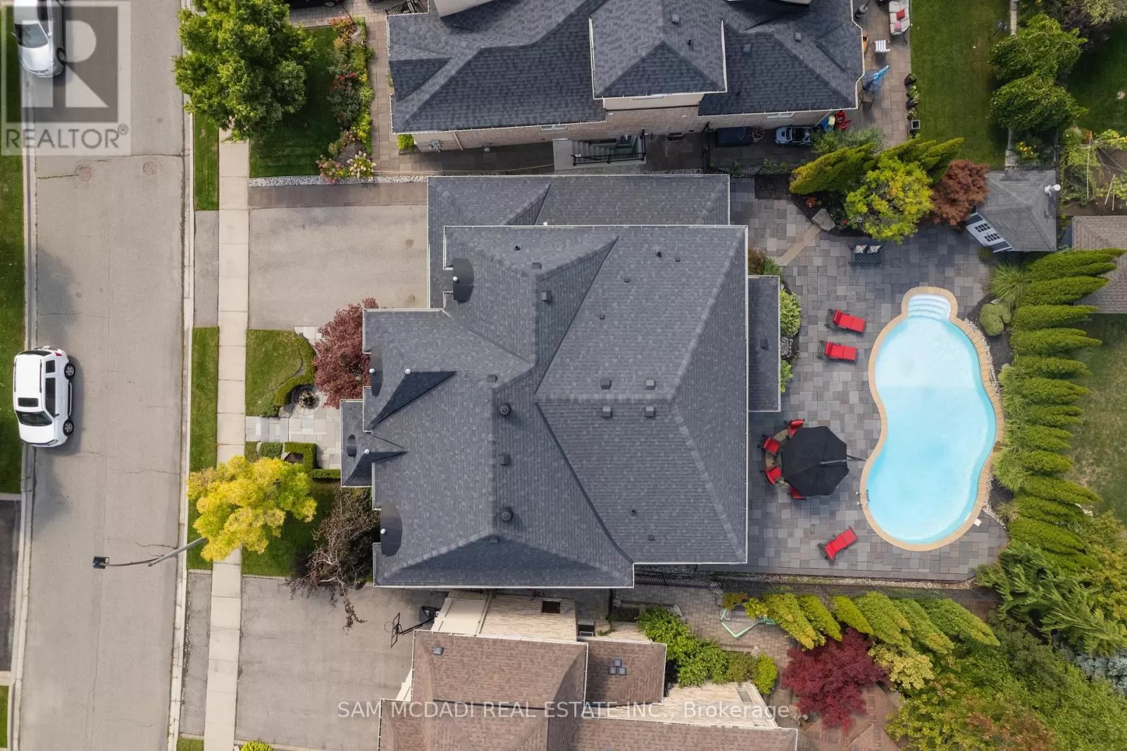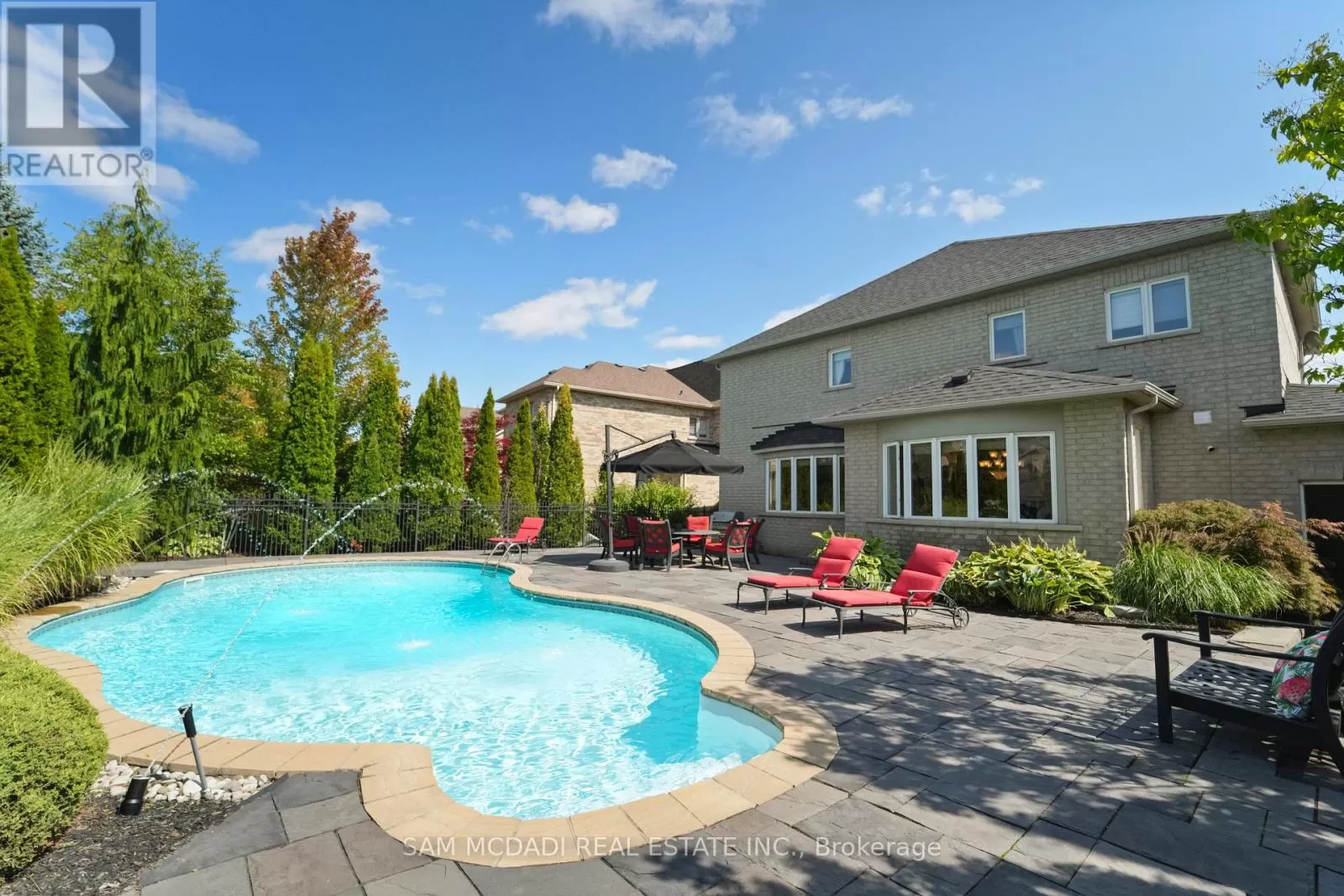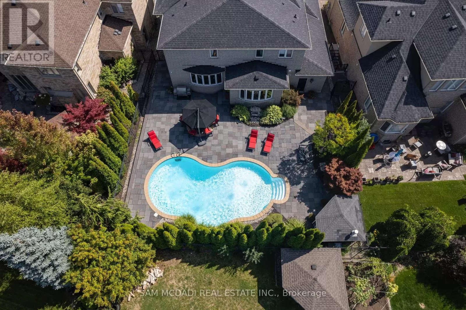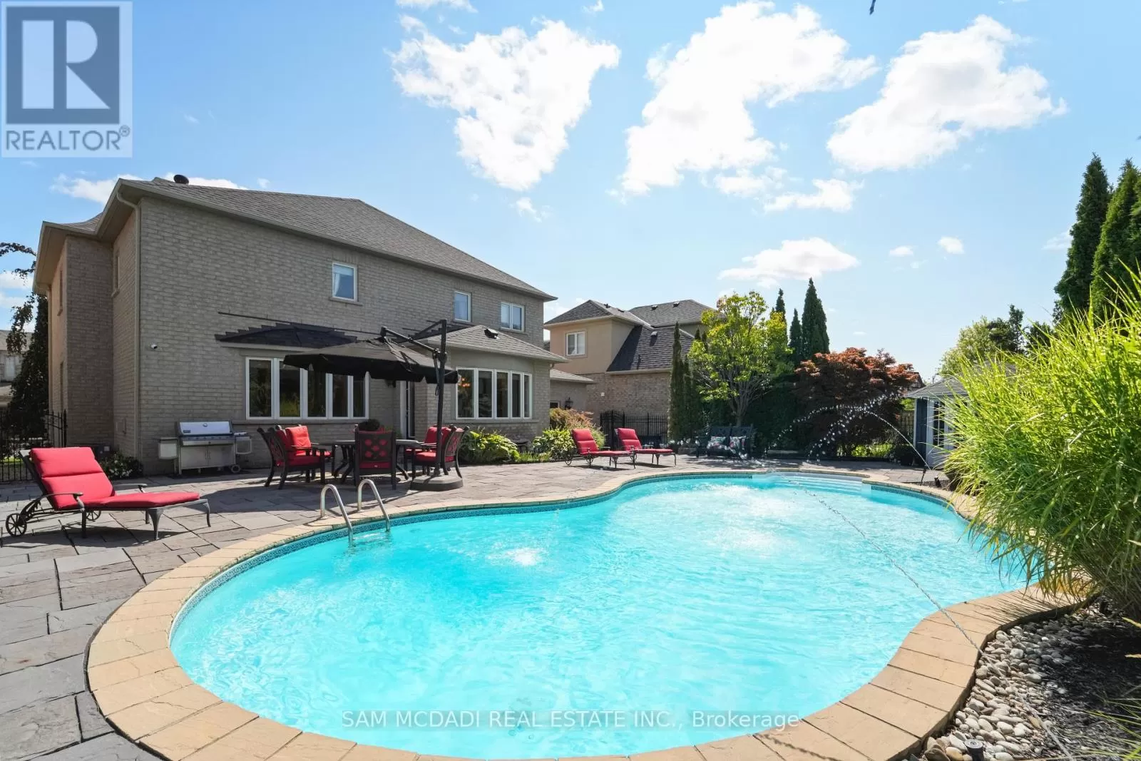 Countryside Dr & Goreway Dr Welcome to this meticulously maintained detached 2-storey home, perfectly situated on a private and exclusive street overlooking a beautiful parkette and green space. Offering 3,534 sq. ft. above grade with 4 bedrooms, 4 bathrooms, main floor office, this residence combines elegance, comfort, and functionality. The exterior is professionally landscaped with mature trees, two serene water features, inground irrigation system, and a stunning saltwater heated pool (3' - 8' depth) with three cascading waterfalls creating your own private backyard oasis. Inside, youll find spacious principal rooms and an open-concept kitchen with a center island, stone countertops, built-in desk, stainless steel appliances, and direct flow into the living area featuring a custom wall unit and cozy gas fireplace. Elegant dining room leading to 2 storey living room perfect for entertaining. Open oak staircase with wrought iron balusters. Hardwood flooring, crown molding, pot lights throughout and custom walk-in closets in all bedrooms elevate the homes style and practicality. The primary retreat boasts a walk-in closet and a luxurious 5-piece ensuite. New countertops in all bathrooms, upgraded hardwood on the second level and new front door/entry way. Security system with cameras. Parking is never an issue with a 3-car tandem garage and room for 5 more on the driveway8 total spaces. This rare offering blends luxury, privacy, and convenience, all in an exceptional setting. (id:27476)