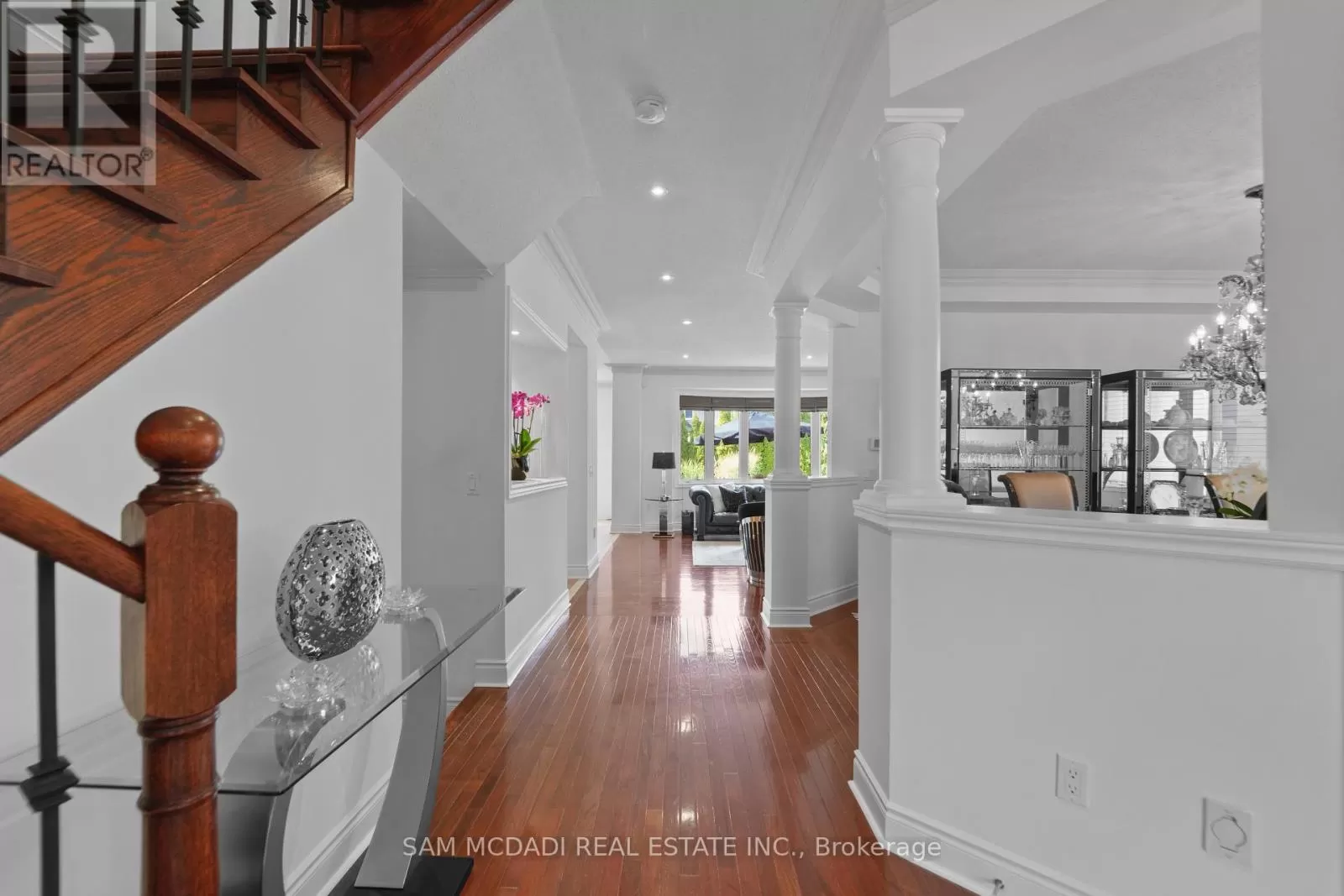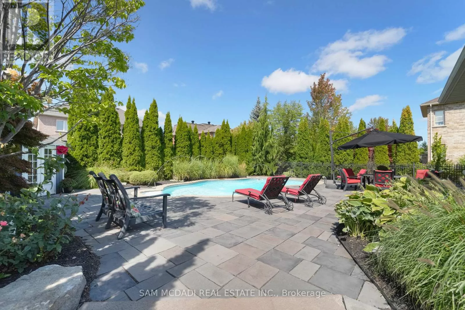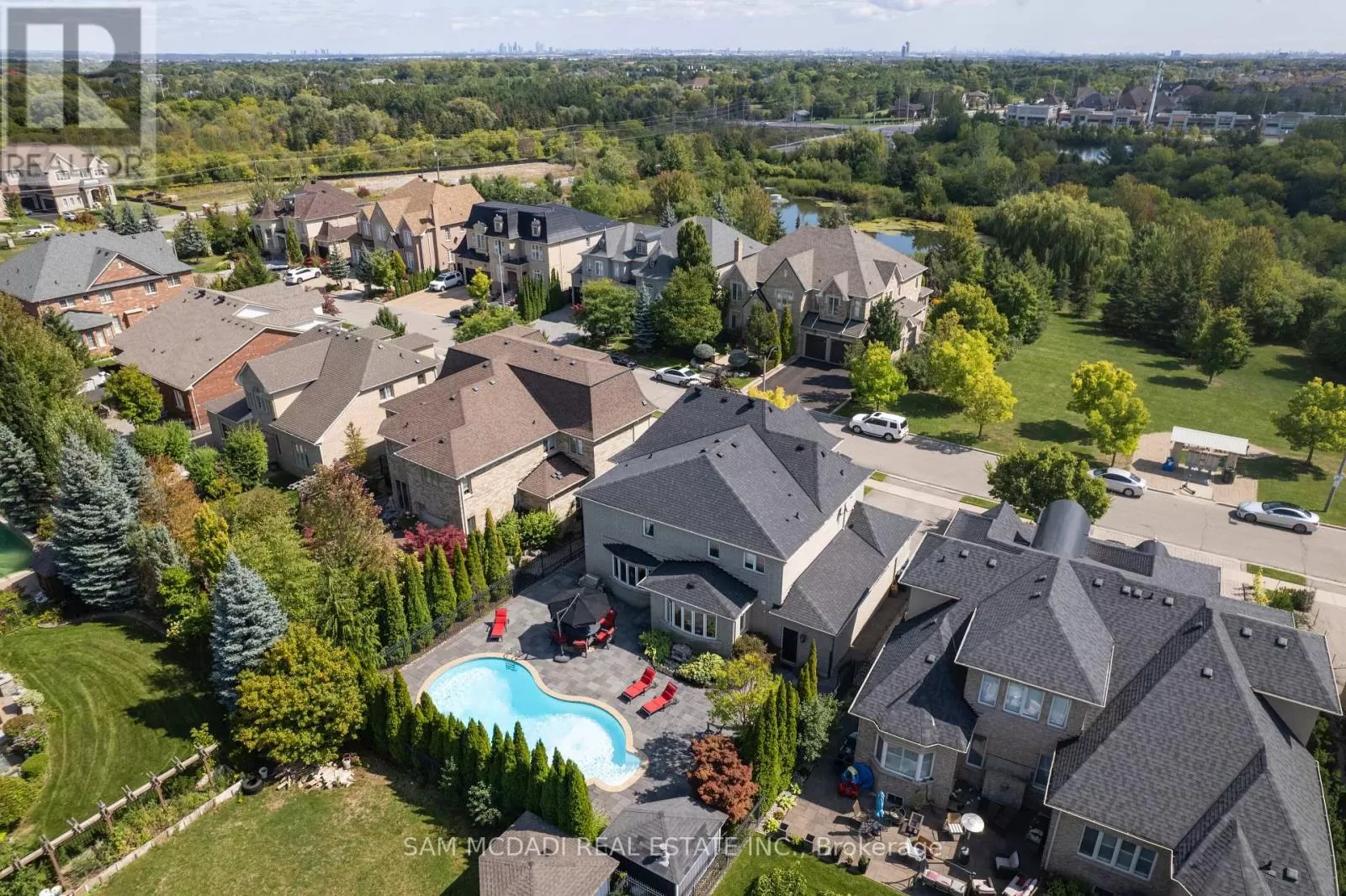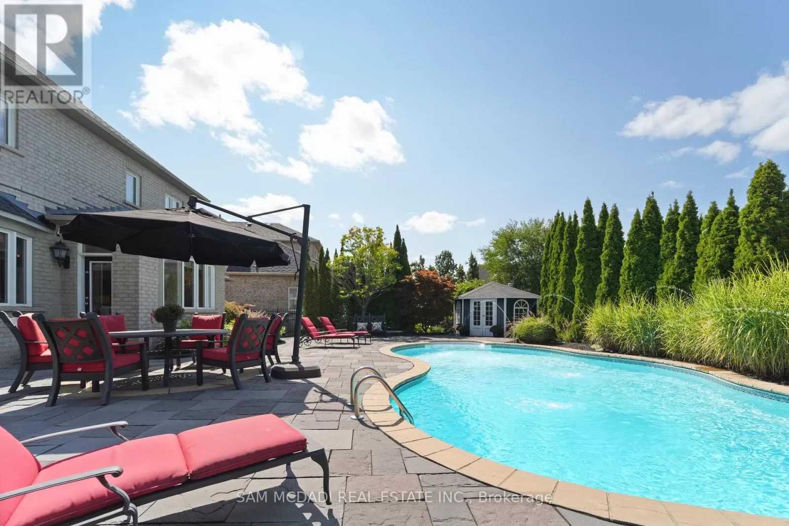 Countryside Dr & Goreway Dr Welcome to this meticulously maintained detached 2-storey home, perfectly situated on a private and exclusive street overlooking a beautiful parkette and green space. Offering 3,534 sq. ft. above grade with 4 bedrooms, 4 bathrooms, main floor office, this residence combines elegance, comfort, and functionality. The exterior is professionally landscaped with mature trees, two serene water features, inground irrigation system, and a stunning saltwater heated pool (3' - 8' depth) with three cascading waterfalls creating your own private backyard oasis. Inside, youll find spacious principal rooms and an open-concept kitchen with a center island, stone countertops, built-in desk, stainless steel appliances, and direct flow into the living area featuring a custom wall unit and cozy gas fireplace. Elegant dining room leading to 2 storey living room perfect for entertaining. Open oak staircase with wrought iron balusters. Hardwood flooring, crown molding, pot lights throughout and custom walk-in closets in all bedrooms elevate the homes style and practicality. The primary retreat boasts a walk-in closet and a luxurious 5-piece ensuite. New countertops in all bathrooms, upgraded hardwood on the second level and new front door/entry way. Security system with cameras. Parking is never an issue with a 3-car tandem garage and room for 5 more on the driveway8 total spaces. This rare offering blends luxury, privacy, and convenience, all in an exceptional setting. (id:27476)
