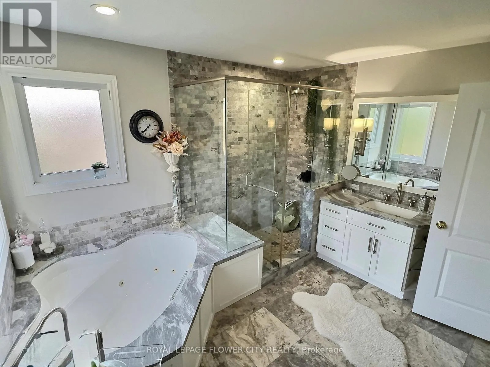 Hwy 10/Mayfield S-T-U-N-N-I-N-G executive home on a 67 ft wide lot with 3 car garage and finished basement with ensuite and full kitchen, located in one of Brampton's most prestigious neighborhoods! This approx. 5000 sqft home (3424 sqft above grade + finished basement) has been tastefully upgraded throughout. Welcoming foyer opens to separate living and dining rooms with coffered ceilings and bay window, main floor office with walk-out to yard, hardwood flooring on both levels, and a main floor laundry room with garage access. Gourmet kitchen with high-end stainless steel appliances, granite countertops, marble backsplash, and new sliding patio doors leading to a beautifully landscaped backyard. Upstairs features a spacious primary bedroom with a 5 pc ensuite and jacuzzi, 3 additional large bedrooms each with ensuites attached, plus a den and 2 full 4 pc baths. The professionally finished basement includes a full kitchen, living area, bedroom, and a large walk-in bathroom perfect for extended family or as a nanny/in-law suite. Numerous upgrades include a new 200 amp electrical panel, new pot lights, new window coverings and curtains, new security system with cameras, new sprinkler system, new washing machine, new appliances, and over $30K in new landscaping. Over $100,000+ spent on recent improvements. HUGE 67 ft wide x 122 ft deep lot with interlocking stonework, gardens, lighting, and fenced yard w/ new Gazebo. Close to top-rated schools, parks, shopping, and transit. Truly a rare find in an established and sought-after community. Seeing is believing! (id:27476)