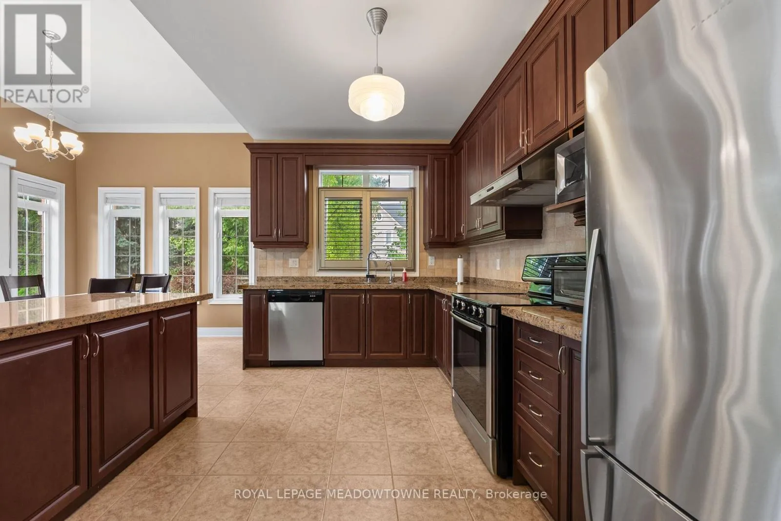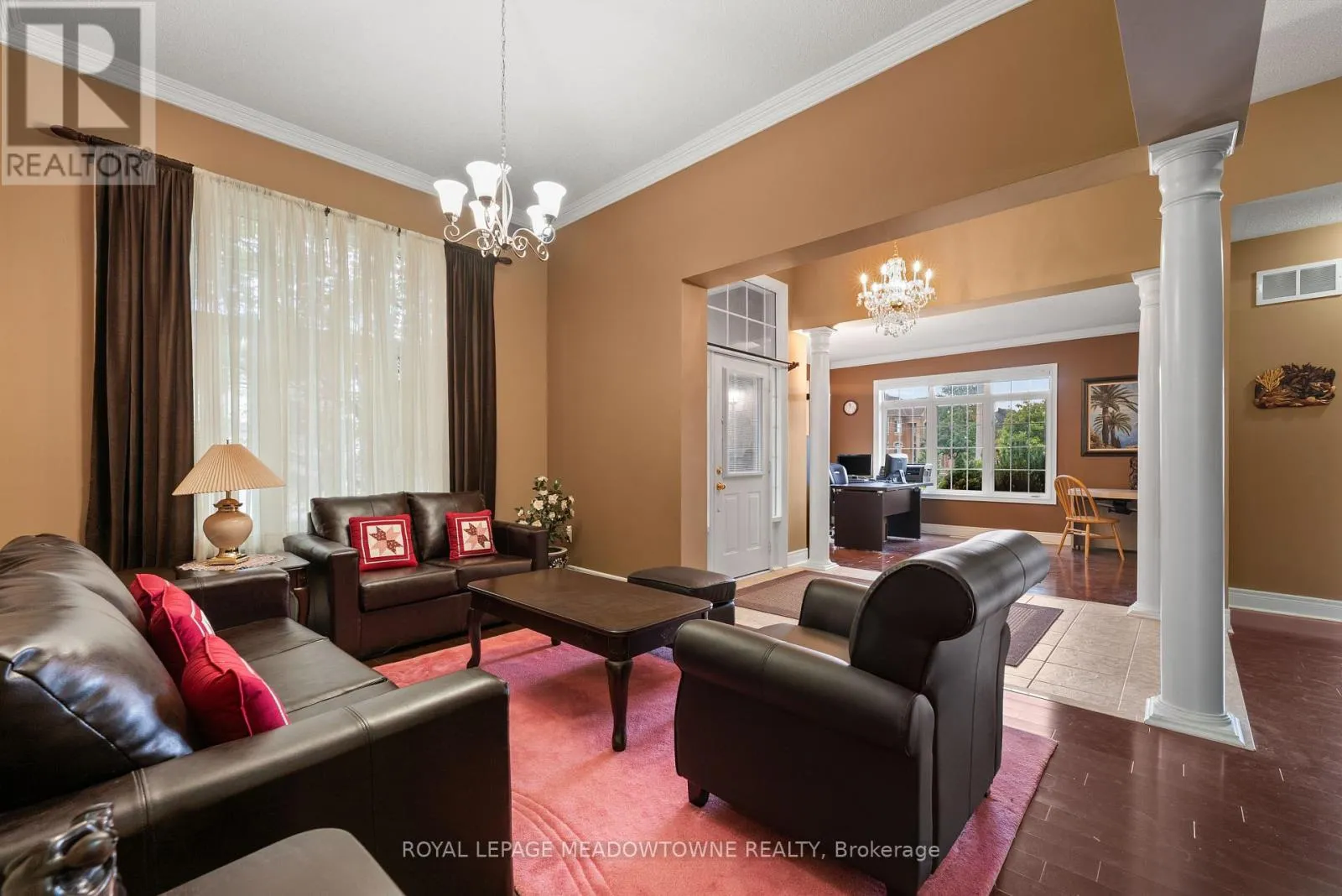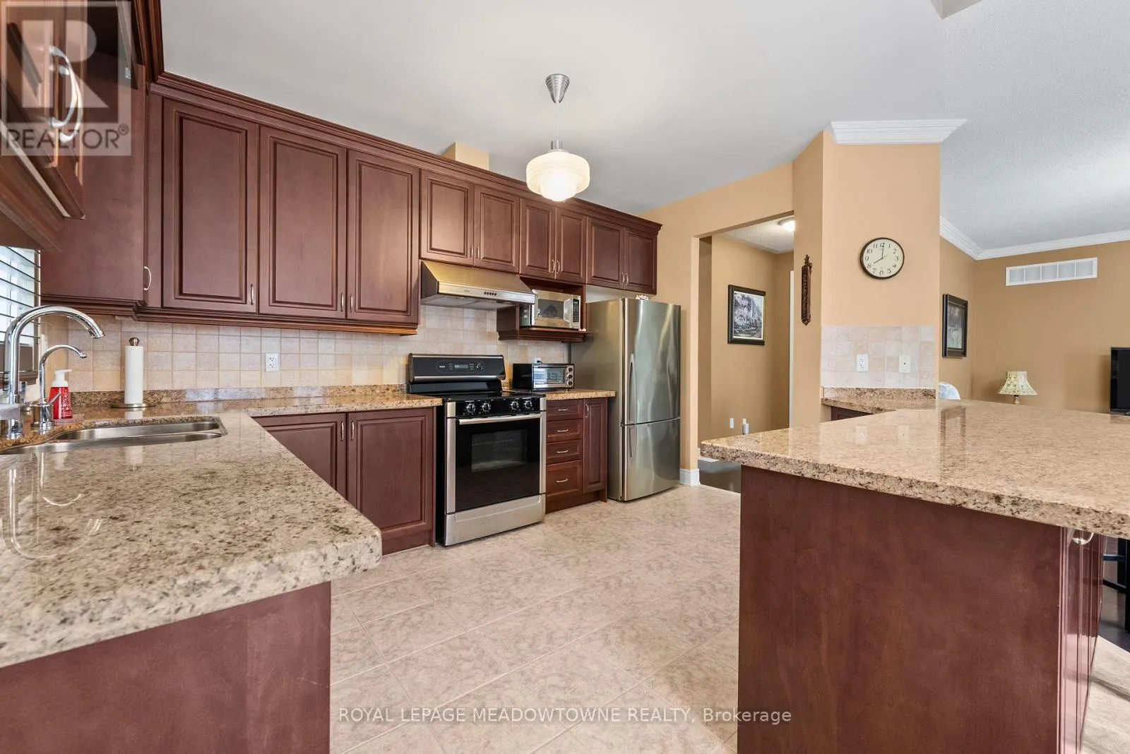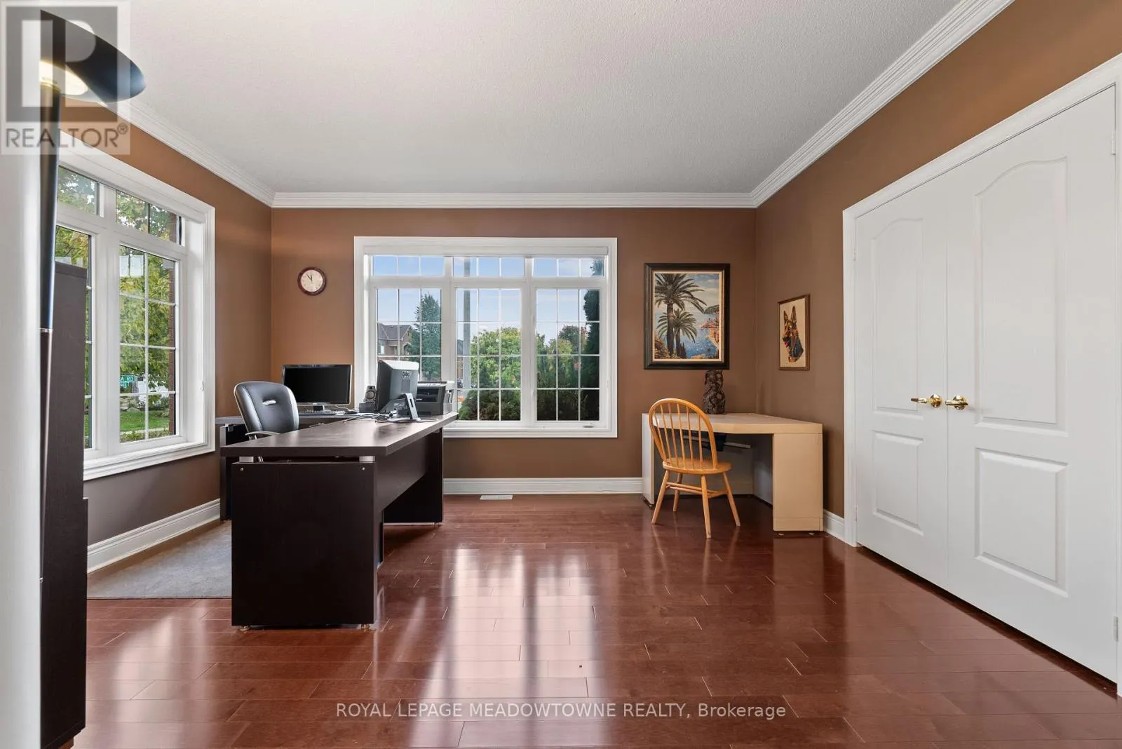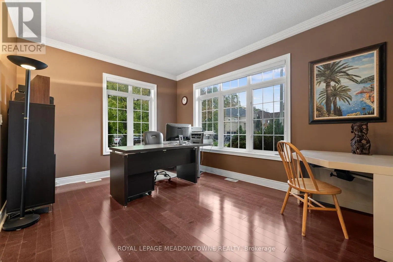 Financial Dr & Hallstone Road Gorgeous corner lot bungalow in the coveted Streetsville Glen Golf Course community. Elegant layout with soaring 10 ft and Gorgeous corner lot bungalow in the coveted Streetsville Glen Golf Course community. Elegant layout with soaring 10 ft and 12.5 ft ceilings and hardwood throughout. Sun filled interiors with abundance of windows. Living and dining rooms feature crown moulding, and the living room includes a gas fireplace. Spacious eat-in kitchen with stainless steel appliances, granite counters and a centre island, opening to the backyard. Front with patterned concrete walkways and curbs wrap the property. Rear interlock patio, beautifully landscaped and fully fenced with a gas line for the BBQ. Primary bedroom offers two closets and a five piece ensuite. Third bedroom is currently open as an office and van be converted back to a bedroom. Finished basement with a bedroom, a 3 piece bath, a dry bar, generous storage and a large open area with potential to create a second bedroom. Simply move in and enjoy. 12.5 ft ceilings and hardwood throughout. Sun filled interiors with abundance of windows. Living and dining rooms feature crown moulding, and the living room includes a gas fireplace. Spacious eat-in kitchen with stainless steel appliances, granite counters and a centre island, opening to the backyard. Front with patterned concrete walkways and curbs wrap the property. Rear interlock patio, beautifully landscaped and fully fenced with a gas line for the BBQ and a sprinkler system. Primary bedroom offers two closets and a five piece ensuite. Third bedroom is currently open as an office and van be converted back to a bedroom. Finished basement with a bedroom, a 3 piece bath, a dry bar, generous storage and a large open area with potential to create a second bedroom. Simply move in and enjoy. (id:27476)