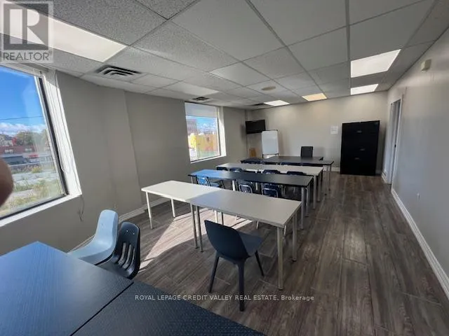 Queen/Main Great low cost 2nd floor office space downtown Brampton. Tons of natural light in this unit! Previously occupied by a commercial school and set up with offices and classrooms. 2 washrooms in the suite (one with a shower) as well as common washrooms. Building is fully accessible with an elevator. Very well maintained building with great downtown location close to all amenities and across the street from the Brampton GO/Zum terminal. DC1 zoning allows for a wide variety of uses. Very low gross rent at $23.00 per sq. ft. including all utilities. (id:27476)