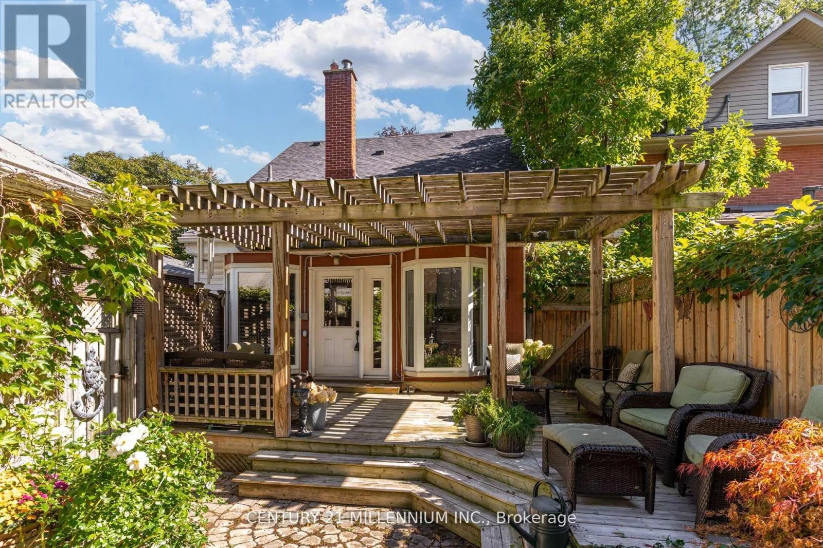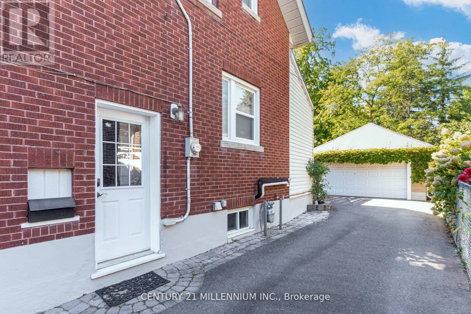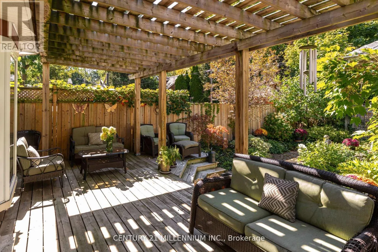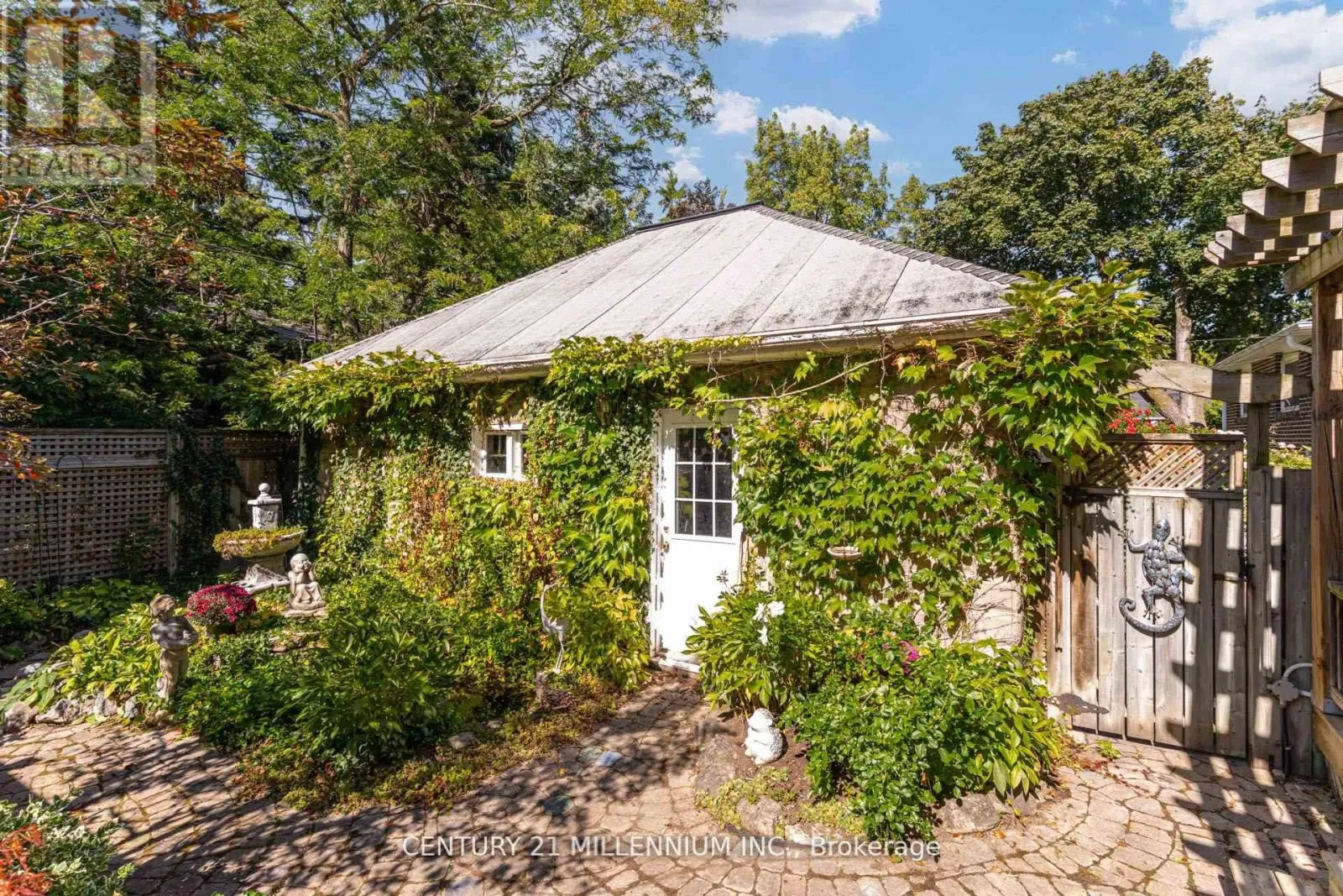 Main Street South and Frederick Street Discover this beautifully appointed, fully detached two-storey home nestled in the heart of Downtown Brampton, offering approximately 2,000 square feet of refined living space. Ideally located within walking distance to local entertainment, the GO Train station, and a variety of amenities. Open-concept layout featuring a spacious sunroom/porch dorned with transom and bay windows, complemented by a cozy gas fireplace. Formal living and dining area with wide-plank hardwood flooring, crown molding, and charming leaded glass windows. Extended hallway leading to a bright eat-in kitchen with ample white cabinetry, island with pull-out drawers, open shelving, and stainless-steel appliances. Convenient three-piece bathroom with a separate shower stall and main-level laundry. Inviting family room with cathedral ceilings and skylights, offering abundant natural light. Step out to a pergola, covered wooden deck overlooking a whimsical English-style garden, complete with ivy, perennial blooms, and a tranquil pond. Three generously sized bedrooms with large picture windows. Four-piece bathroom featuring a Whirlpool soaker tub and expansive vanity. Separate side entrance to a spacious recreation room with a Franklin-style gas fireplace. Fourth bedroom and a two-piece powder room, ideal for guests or extended family. Double car garage and a private driveway accommodating up to five vehicles. Rich character throughout, highlighted by exquisite millwork and thoughtful modern upgrades. This exceptional property blends timeless charm with contemporary comfort, an absolute must-see! (id:27476)
