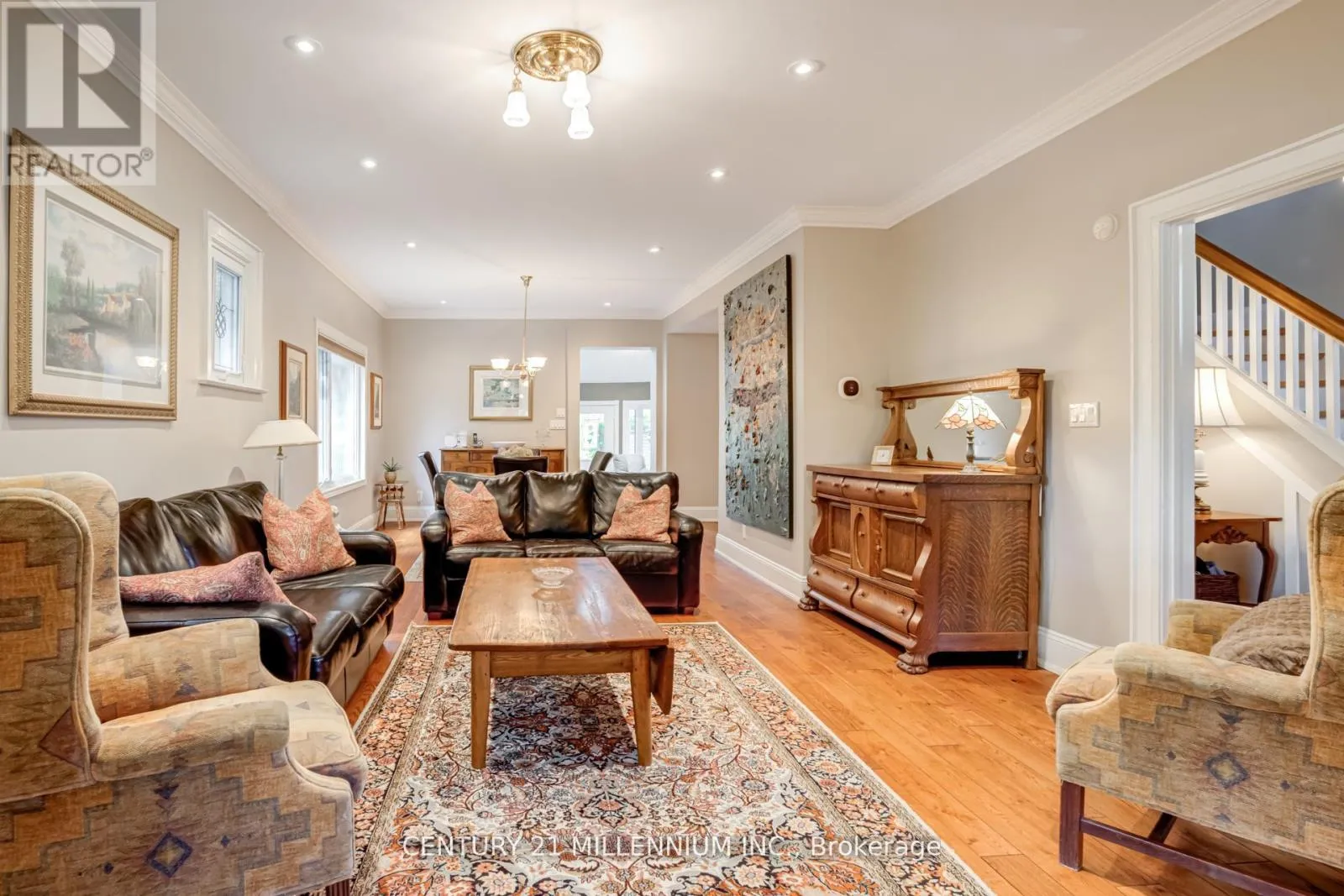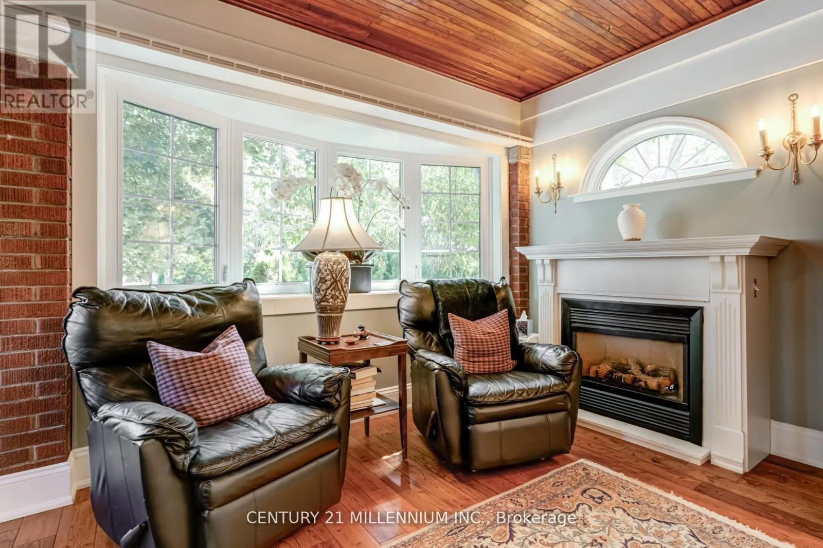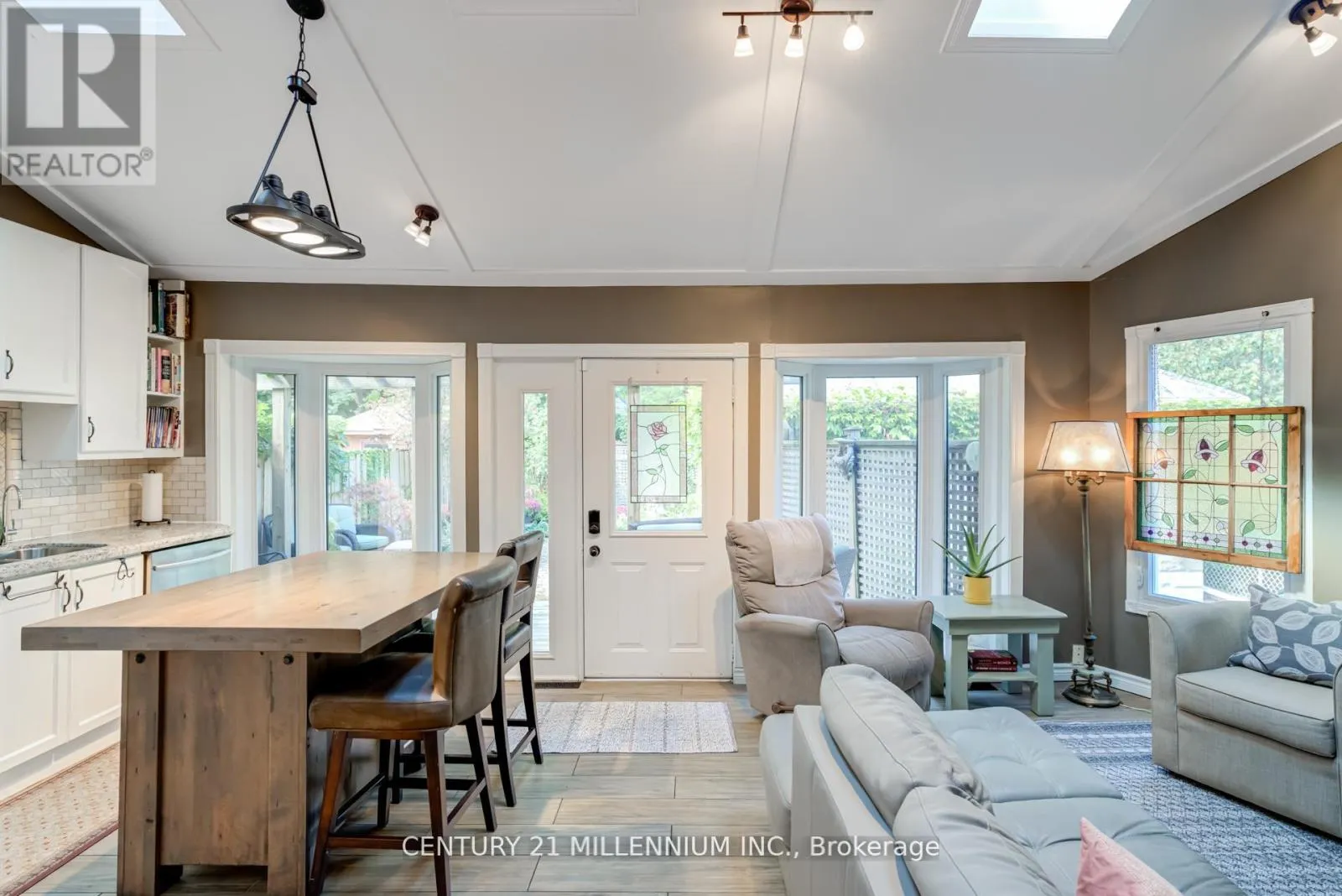 Main Street South and Frederick Street Discover this beautifully appointed, fully detached two-storey home nestled in the heart of Downtown Brampton, offering approximately 2,000 square feet of refined living space. Ideally located within walking distance to local entertainment, the GO Train station, and a variety of amenities. Open-concept layout featuring a spacious sunroom/porch dorned with transom and bay windows, complemented by a cozy gas fireplace. Formal living and dining area with wide-plank hardwood flooring, crown molding, and charming leaded glass windows. Extended hallway leading to a bright eat-in kitchen with ample white cabinetry, island with pull-out drawers, open shelving, and stainless-steel appliances. Convenient three-piece bathroom with a separate shower stall and main-level laundry. Inviting family room with cathedral ceilings and skylights, offering abundant natural light. Step out to a pergola, covered wooden deck overlooking a whimsical English-style garden, complete with ivy, perennial blooms, and a tranquil pond. Three generously sized bedrooms with large picture windows. Four-piece bathroom featuring a Whirlpool soaker tub and expansive vanity. Separate side entrance to a spacious recreation room with a Franklin-style gas fireplace. Fourth bedroom and a two-piece powder room, ideal for guests or extended family. Double car garage and a private driveway accommodating up to five vehicles. Rich character throughout, highlighted by exquisite millwork and thoughtful modern upgrades. This exceptional property blends timeless charm with contemporary comfort, an absolute must-see! (id:27476)