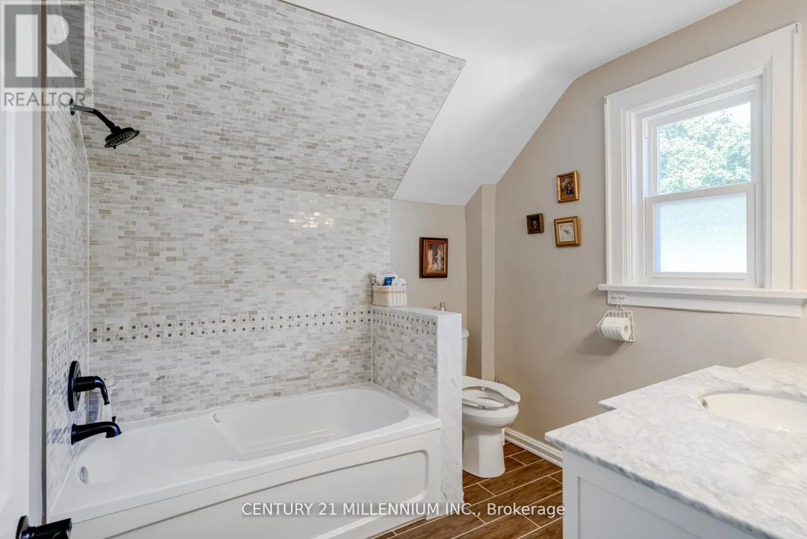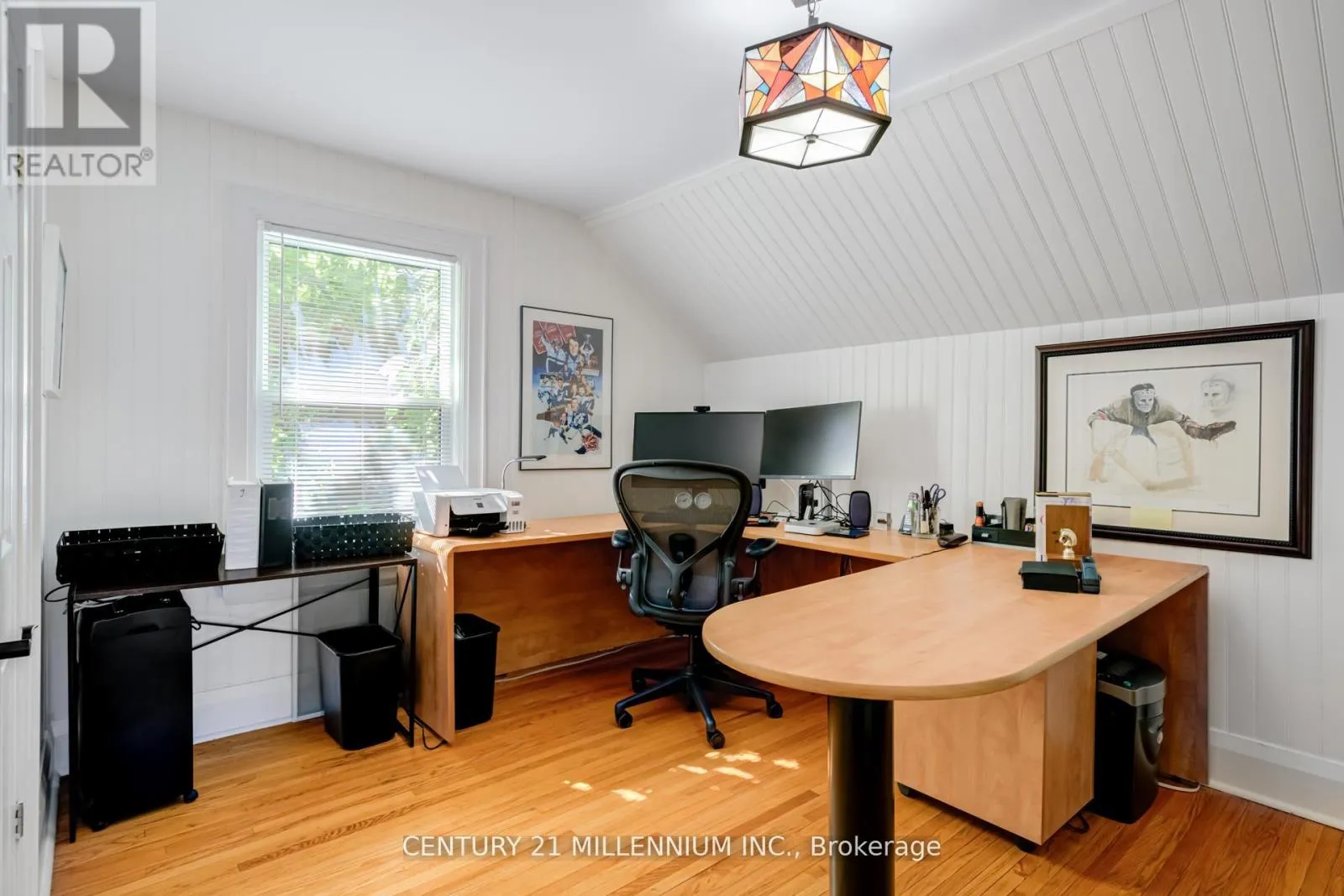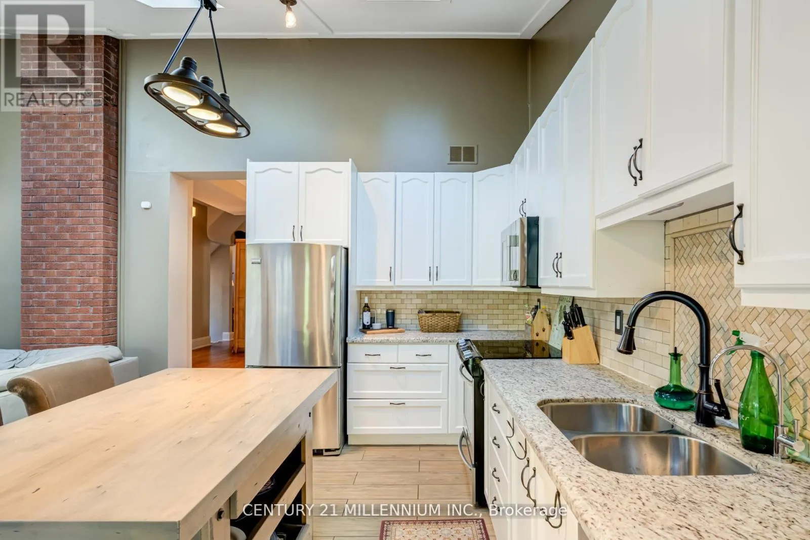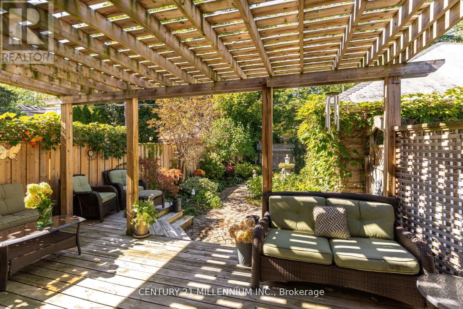 Main Street South and Frederick Street Discover this beautifully appointed, fully detached two-storey home nestled in the heart of Downtown Brampton, offering approximately 2,000 square feet of refined living space. Ideally located within walking distance to local entertainment, the GO Train station, and a variety of amenities. Open-concept layout featuring a spacious sunroom/porch dorned with transom and bay windows, complemented by a cozy gas fireplace. Formal living and dining area with wide-plank hardwood flooring, crown molding, and charming leaded glass windows. Extended hallway leading to a bright eat-in kitchen with ample white cabinetry, island with pull-out drawers, open shelving, and stainless-steel appliances. Convenient three-piece bathroom with a separate shower stall and main-level laundry. Inviting family room with cathedral ceilings and skylights, offering abundant natural light. Step out to a pergola, covered wooden deck overlooking a whimsical English-style garden, complete with ivy, perennial blooms, and a tranquil pond. Three generously sized bedrooms with large picture windows. Four-piece bathroom featuring a Whirlpool soaker tub and expansive vanity. Separate side entrance to a spacious recreation room with a Franklin-style gas fireplace. Fourth bedroom and a two-piece powder room, ideal for guests or extended family. Double car garage and a private driveway accommodating up to five vehicles. Rich character throughout, highlighted by exquisite millwork and thoughtful modern upgrades. This exceptional property blends timeless charm with contemporary comfort, an absolute must-see! (id:27476)