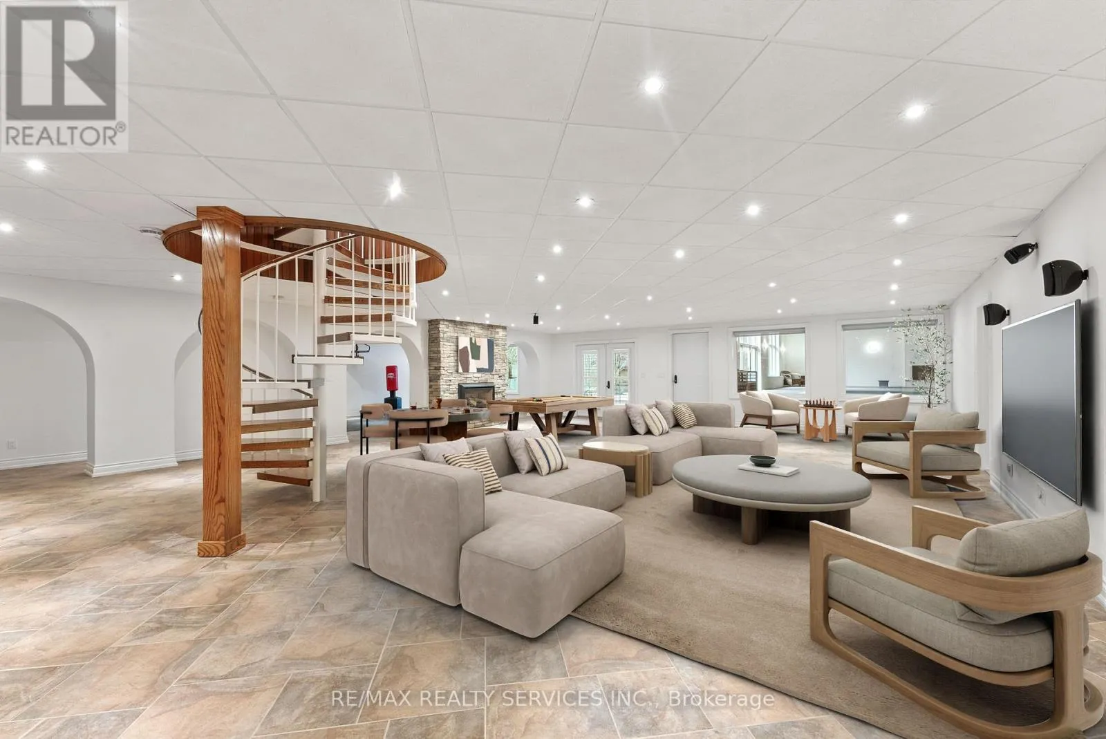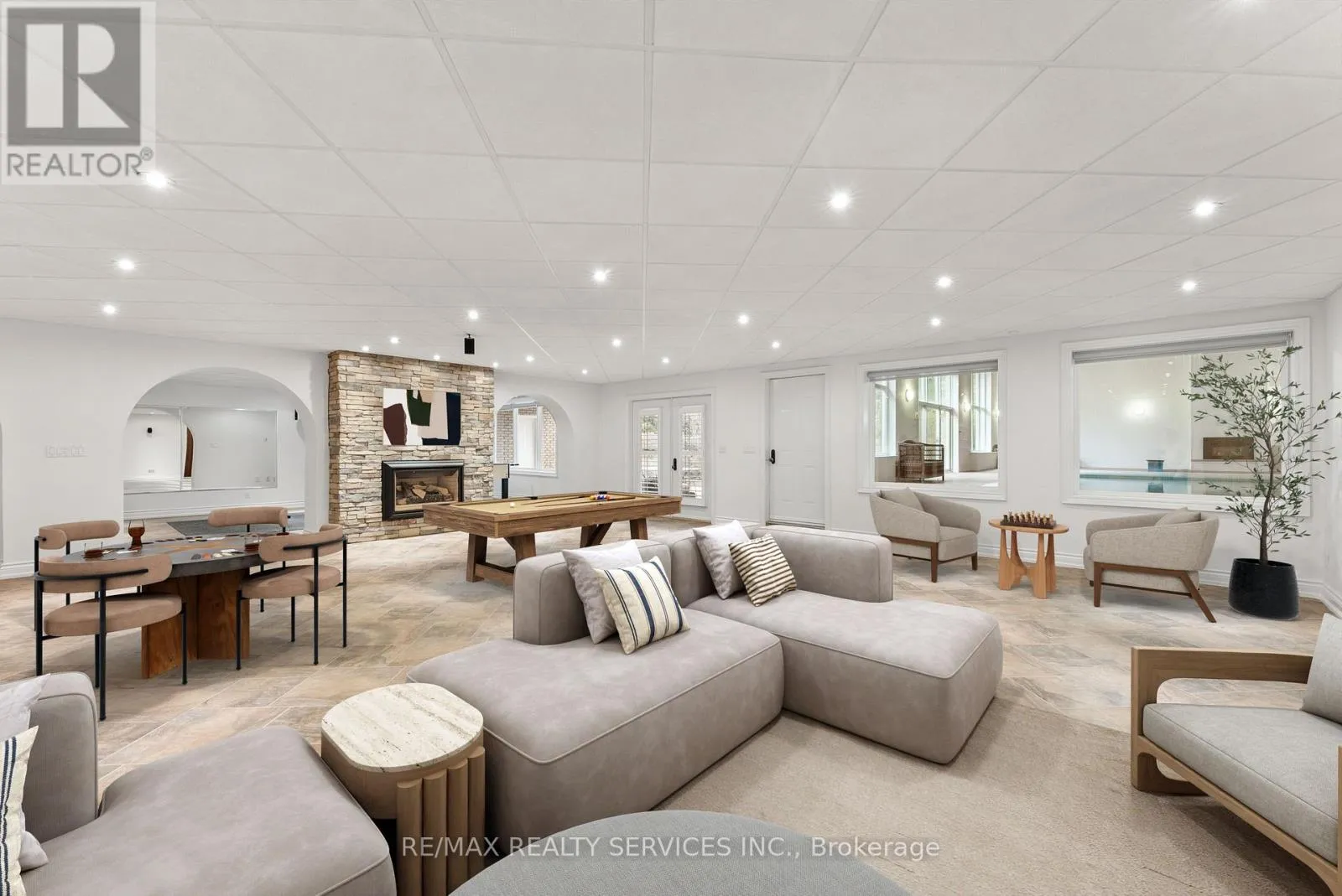 Cross Streets: Kennedy/Conservation. ** Directions: Head east on Conservation Dr, house is on the left. Welcome to this stunning custom-built raised bungalow on a private 1-acre lot in one of Brampton's most prestigious enclaves, directly across from Heart Lake Conservation Area. Offering 7,700 sq ft of total living space, including 3,200 sq ft above grade and a breathtaking 4,500 sq ft walk- out basement with an indoor pool complex and waterfall, this home is a true retreat. The chef's kitchen features a walk-out balcony, custom wood cabinetry, and natural light, capturing unobstructed views of Heart Lake and surrounding forest. The family room offers a walkout balcony overlooking the firepit and landscaped gardens, perfect for gatherings. The upper level includes four spacious bedrooms, with the primary suite boasting a private ensuite and walk-in closet. The lower level offers two additional bedrooms and a large recreational area with oversized windows, a fireplace, wet bar, and walkout to a stamped concrete patio. The indoor pool (18 ft x 42 ft) area features 14-foot ceilings, a waterfall, swim-up bar, and state of the art climate control, creating a year-round resort experience. Completing this luxurious space is a sizable gym, sauna and shower area. Indoor-outdoor flow seamlessly links to beautifully landscaped gardens and a stone patio with a gas firepit, providing an outdoor oasis. The backyard offers privacy and tranquility with mature trees, lush landscaping, and a large open yard for recreation. The front driveway is stamped concrete, with 5 vehicles indoors. Located on conveted Conservation Drive, surrounded by multimillion-dollar properties and with no homes across the street, this estate offers unobstructed views, nearby trail access, abundant wildlife, and a luxurious lifestyle immersed in nature. (id:27476)