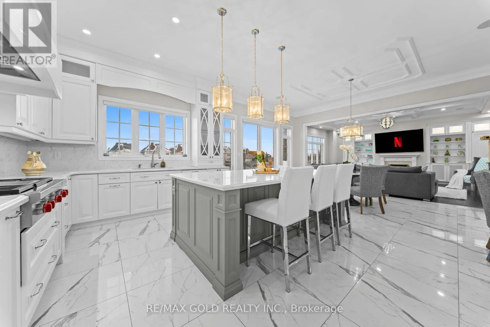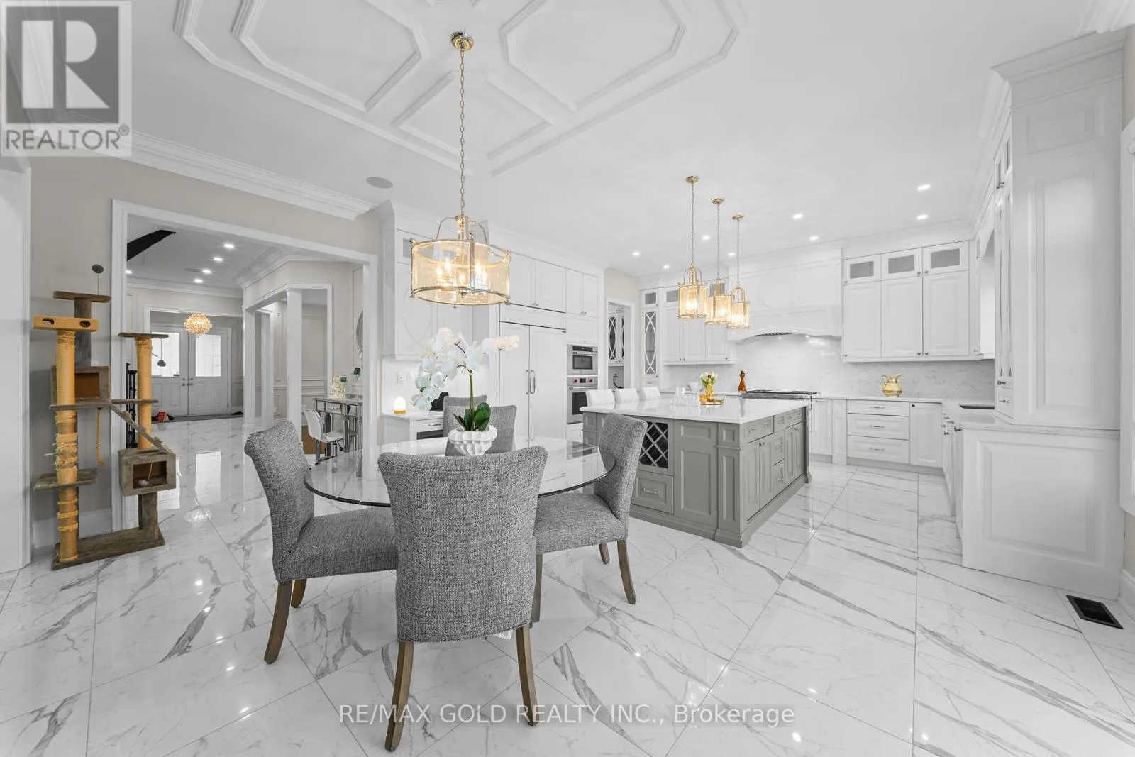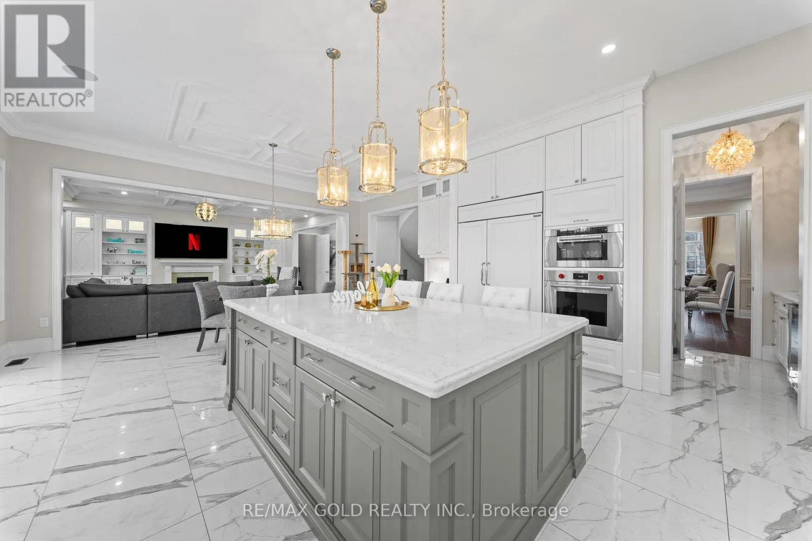 Cross Streets: COUNTRYSIDE / MCVEAN. ** Directions: MAYFIELD / MCVEAN. Welcome to 34 Yellowhammer Cres, an exceptional custom-built luxury detached residence situated on a rare 75.8 -ft wide premium Ravine lot with a Walk-Out Basement. This one-of-a-kind home offers a 3+1 (4-car) Garage, an impressive 9-Car private driveway, and a 8 feet grand double-door entrance, delivering outstanding curb appeal and functionality.A PRIVATE ELEVATOR services all three levels-basement, main floor, and second floor-a rare and highly desirable feature. The home boasts 10-ft ceilings on the main floor and 9-ft ceilings on the second floor and basement, complemented by high-end chandeliers, extensive pot lighting, custom wainscoting, and crown molding throughout.The main floor offers an elegant and functional layout with separate formal living and dining rooms, a large office, Servery with wet bar, walk-in pantry, breakfast area, family room, laundry, and mudroom. The living room features an open-to-above ceiling, gas fireplace, and large windows. The show-stopping chef's kitchen includes extended custom cabinetry, commercial-grade WOLF/SUB-ZERO Appliances, oversized island with undermount sink, quartz countertops and backsplash, upper cabinets, and a built-in recipe desk. The family room showcases a custom coffered ceiling, built-in cabinetry, gas fireplace, and ravine views.The second floor features 4 spacious bedrooms, all with private ensuite washrooms. The primary suite offers a 10-ft coffered ceiling, gas fireplace, large windows, a luxurious 6-pc ensuite with freestanding tub, frameless glass shower, private toilet room, and a walk-in closet with custom organizers.The finished walk-out basement includes 2 large bedrooms, each with attached 4-pc ensuite washrooms, recreation and sitting areas, party space, gym area, a luxury powder room, and rough-ins for bar, sauna, or kitchen. Additional features include 2 owned furnaces, 2 owned A/C units, owned hot water tank, exterior pot lights, and upgraded driveway lighting. A true luxury offering. (id:27476)