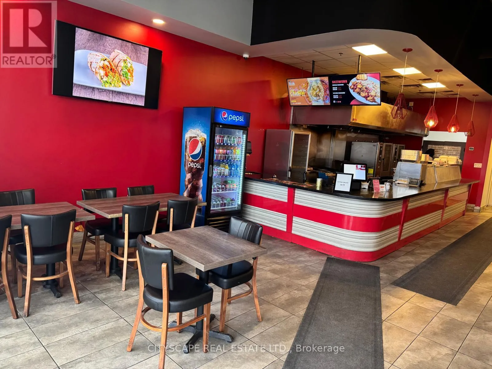 Mississauga Rd & Financial Dr Fantastic opportunity to own a restaurant in a high-traffic, well-established plaza surrounded by dense residential neighborhoods and thriving commercial businesses. Enjoy steady walk-in traffic and excellent visibility, with quick access to Hwy 407, Steeles Ave, and Mississauga Rd. This 1,390 sq. ft. space is fully equipped and ready to operate, featuring a 16-ft commercial hood system, walk-in cooler and freezer, and seating for 32. Perfect for dine-in, take-out, or delivery-focused concepts. The restaurant can easily be rebranded or converted to a different cuisine, subject to landlord approval. (id:27476)