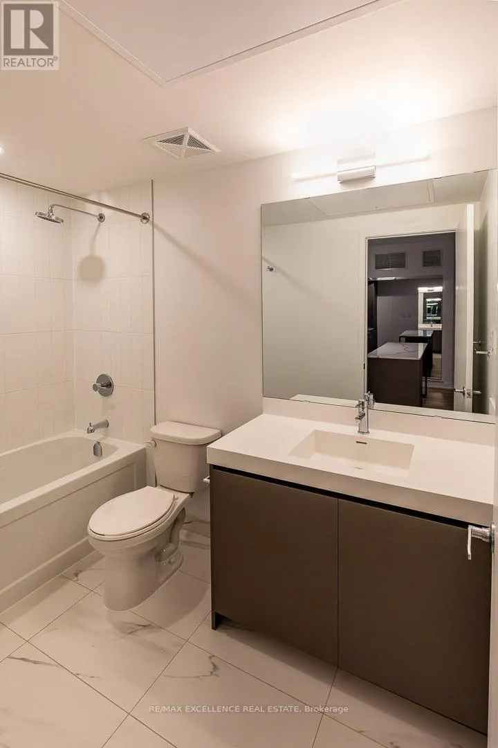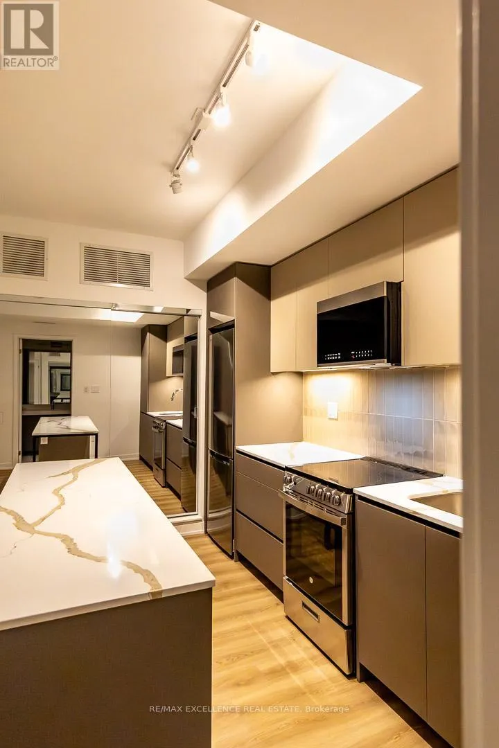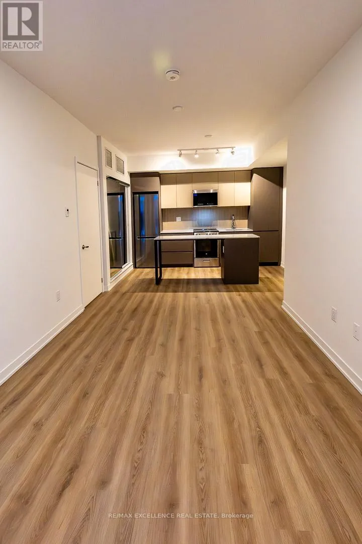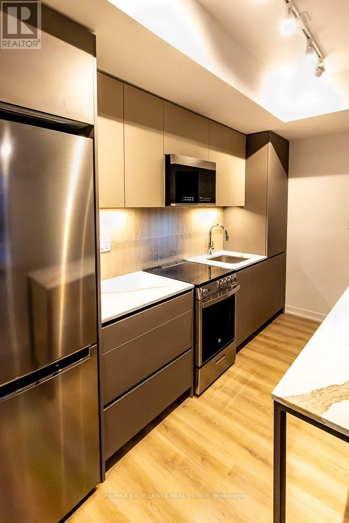 Mississauga Rd and Bovaird Dr Welcome to this bright and modern unit offering a thoughtfully designed layout and abundant natural light, overlooking a green space that provides privacy and a serene backdrop. The open-concept living space features laminate flooring and oversized windows with access to a private outdoor area, creating a warm and airy atmosphere. The sleek kitchen includes a large island with quartz countertops, flat-panel cabinetry, and stainless steel appliances-ideal for both everyday living and entertaining. The spacious bedroom offers excellent natural light and mirrored closet doors, while the full bathroom features modern finishes, a deep soaker tub anda stylish vanity with ample storage. Additional highlights include in-suite laundry, goodstorage, and quality finishes throughout. Residents also enjoy access to impressive building amenities, including a Fitness Zone, Co-Work Pods, Game Lounge, Party Room, Social Lounge, Kid's Club, Pet Room, Guest Suite, and beautifully maintained outdoor spaces with community BBQs, along with convenient underground guest parking. A wonderful opportunity to live in abright, comfortable, and well-designed home. (id:27476)