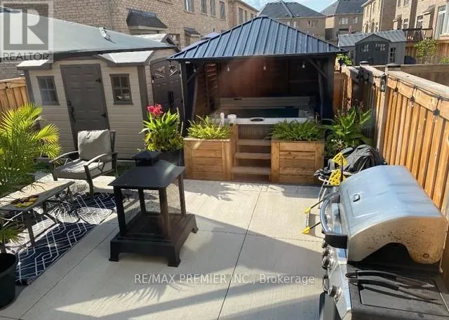 Cross Streets: JAMES POTTER RD & BONNIE BRAES. ** Directions: JAMES POTTER RD - BONNIE BRAES - KIMBROUGH HOLLOW. Welcome to this beautifully landscaped semi-detached home offering approximately 1,766 sq. ft. of thoughtfully designed living space with stylish, designer finishes throughout. From the moment you step inside, you'll appreciate the hardwood flooring, bay windows, and tasteful accent walls that create a warm an inviting atmosphere. The main level features a cozy electric fireplace, a separate dining room ideal for entertaining, and an open-concept kitchen overlooking the breakfast area, family room, and outdoor living space. Abundant storage and direct access to the garage add everyday convenience. The upper level was smartly converted from four bedrooms to a spacious three-bedroom layout, complete with an oversized laundry room with sink and ironing station. The generous primary retreat easily accomodates a king-sized bed with night tables on the same wall, while the extended bay window provides the perfect space for a home office or lounge. A coffered ceiling with an extended 9-foot feel enchances the sense of space, a generous sized walk-in closet, and the ensuite offers both a separate shower and a relaxing soaker tub. Two additional bedrooms provide excellent flexibility for a growing family, guests, or work-form-home needs. Enjoy your morning coffee or evening unwind on the private balcony off the third bedroom. The finished lower level adds even more living space, featuring laminate flooring, a large recreation room, and additional area suitable for a bedroom, gym, or hobby space. A built-in fish tank adds a calming focal point, while ample storage and a cold cellar complete the level. Enjoy the convenience of the new 3-piece bath that is plumbed but requires connection. Step outside to your backyard oasis, fully finished with concrete flooring, a hot tub uner a gazebo, dedicated cooking area,and an oversized shed - an ideal setting for relaxing or entertaining year-round. (id:27476)