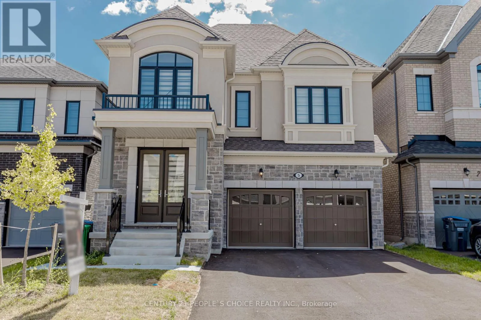 Cross Streets: CreditView/Bergin st. ** Directions: Credit View/Bergin st. Discover timeless luxury at 5 Bergin Street, Brampton in the prestigious 1.5-year-new Credit Ridge community. This spacious 3,545 sq.ft. masterpiece boasts 10ft ceilings on the ground floor and 9ft on upper levels, blending open-concept living with premium finishes throughout.Elegant brick & stone facade with stucco trim, covered front porch, double-railing staircase, arched doorway, and double door entry welcome you home. Large black-framed windows, including a stunning arched feature, flood interiors with light alongside gleaming hardwood floors, stone counters, pot lights, and central A/C.Open-concept great room flows seamlessly to a gourmet kitchen with high-end appliances, expansive island, and sunlit breakfast area. Perfect for entertaining, with elegant dining space and versatile office/den.Primary suite indulgence features spa-style ensuite, raised ceiling, and oversized walk-in closet. Five generous bedrooms-all with ensuite access and walk-in closets-plus a chic front Juliet balcony enhancing curb appeal.Unfinished basement with separate entrance offers endless potential (in-law suite, gym). Neutral palette, modern lighting, and superior build quality make this turnkey Credit Ridge gem a rare find. (id:27476)