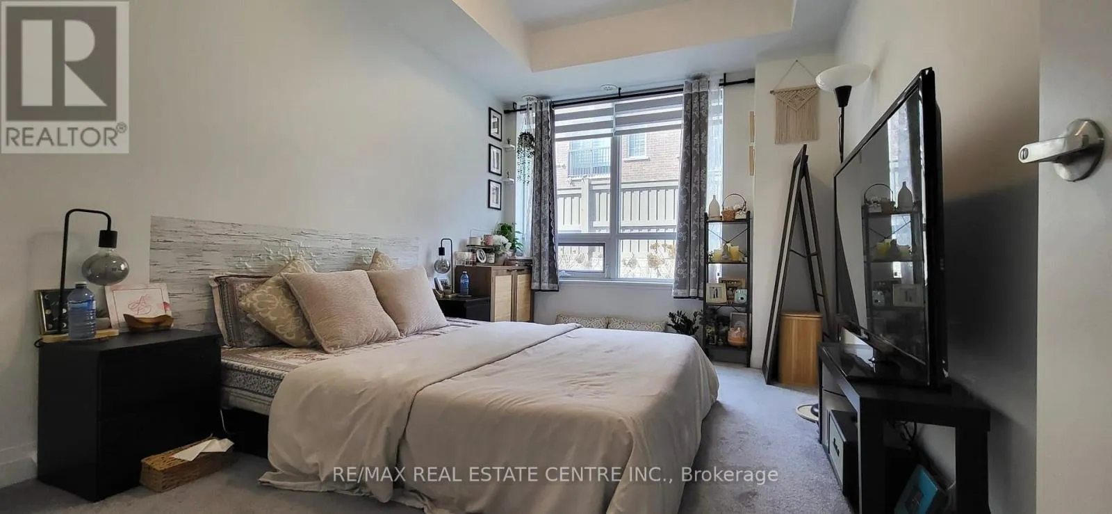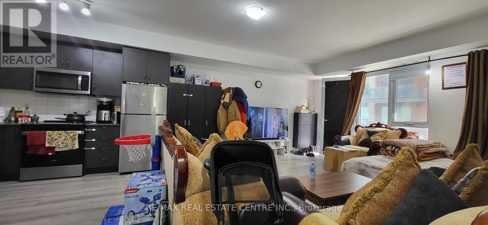 The Gore Rd & Queen St This ground-floor unit offers a sophisticated living experience with 9' ceilings and premium finishes throughout. The modern kitchen and both bathrooms are elegantly appointed with quartz countertops, complementing the open-concept layout. The master suite serves as a private retreat, featuring a walk-in closet, a full ensuite, and a walk-out to a private patio. Residents will enjoy the convenience of 1 underground parking space and a secondary front patio off the main living area. Minutes from Highways 427, 407, and 7, with easy access to transit stops just a 3-minute walk away. Walking distance to grocery stores, pharmacies, and popular dining like Gurus Chilli Chinese. Located near the Gore Mandir. (id:27476)