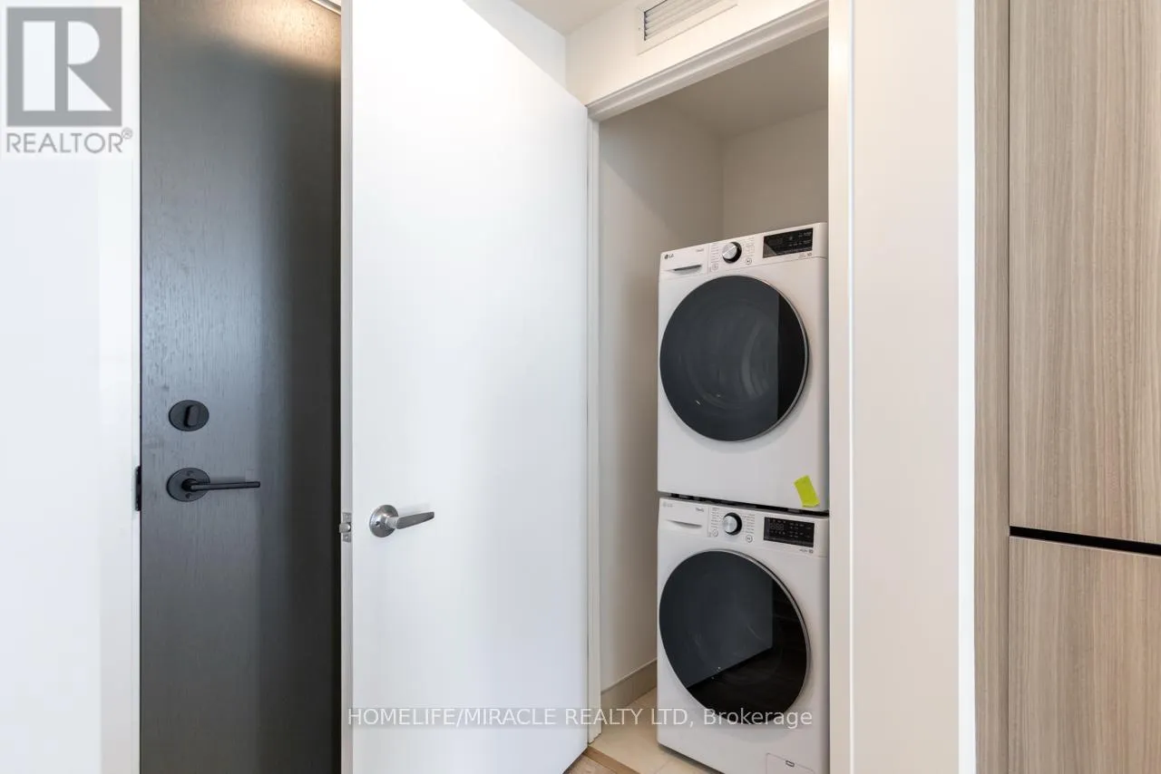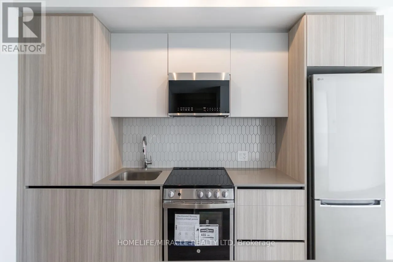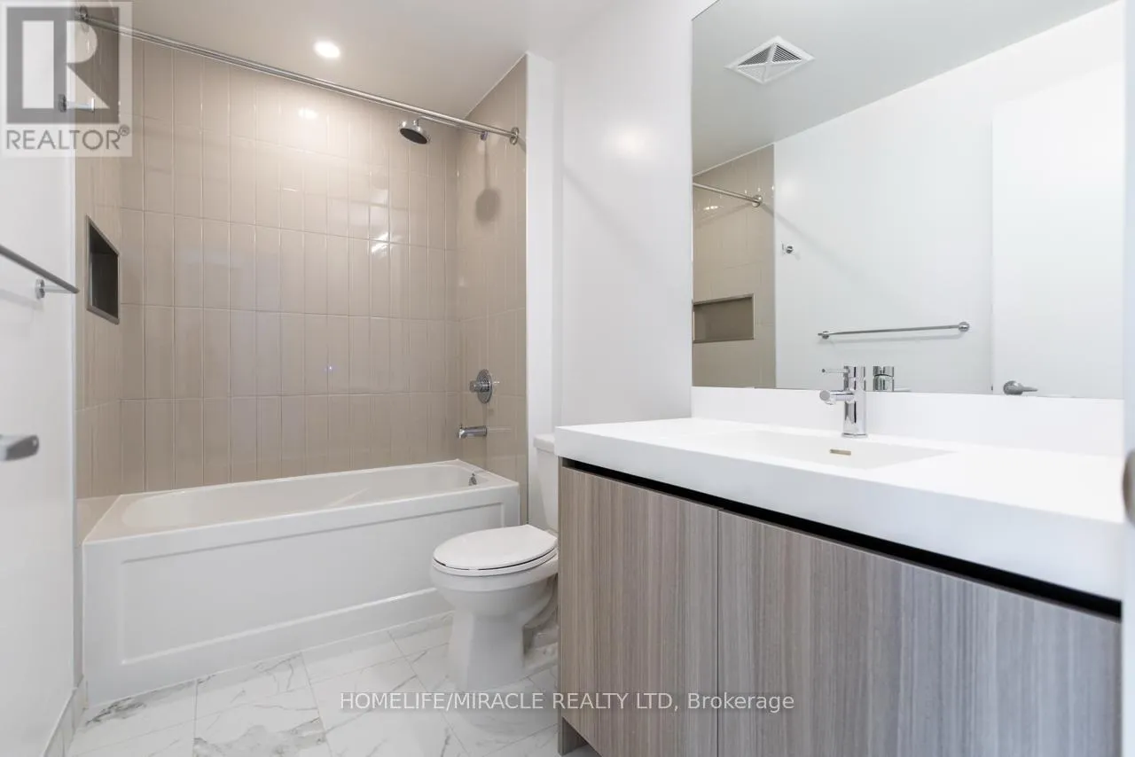 Bovaird Dr / Mississauga Rd Stunning, brand-new one-bedroom plus den condo in the highly desirable Mount Pleasant community. This unit offers a thoughtfully designed layout with 9-foot ceilings, smooth finishes, LED lighting, and laminate flooring throughout. The unit includes one parking space and convenient LG in-suite laundry. The modern kitchen features quartz countertops, soft-close cabinetry and drawers, a ceramic backsplash, under-cabinet lighting, an under-mount sink, a center island with added storage, a paneled GE dishwasher, and stainless steel appliances. The open-concept living and dining area seamlessly extends to the balcony, creating a bright and inviting space. The primary bedroom boasts a large double mirrored closet, while the generously sized den is perfect for a home office. The stylish 4-piece bathroom includes a vanity with soft-close drawers and a relaxing soaker tub. Residents enjoy access to premium building amenities, including a fitness centre, activity zone, co-working space, kids' club, games lounge, party room, and outdoor barbecue area. Situated just minutes from Mount Pleasant GO Station, shopping, parks, trails, schools and highways. (id:27476)