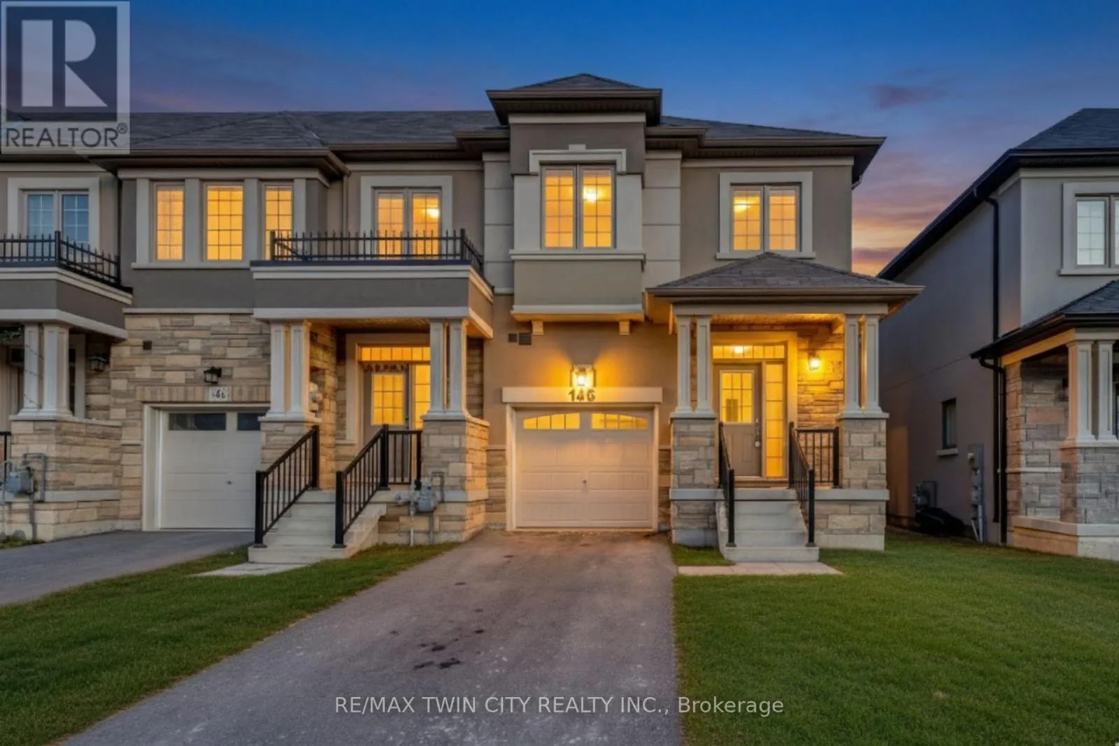 Cross Streets: Scenic Ridge Gate. ** Directions: Hudson Gate to Flagg Avenue. Welcome to 146 Flagg Avenue, Freehold end-unit townhome located in the charming and highly sought-after Town of Paris. Offering the feel of a semi-detached home, just-a-few-years-old residence showcases modern finishes, thoughtful design and an inviting neighbourhood surrounded by scenic views and community charm. Approach the home to find excellent curb appeal and the convenience of two parking spaces: one garage, one driveway. Step inside to a carpet-free main level that offers open-concept floor plan including a spacious living area enhanced by wall of windows, allowing natural light to pour in throughout the day. The chef-inspired kitchen is equipped with stainless steel appliances, sleek cabinetry and stylish backsplash. Flowing seamlessly into the adjacent dining area, this layout is perfect for hosting family dinners, celebrations and everyday meals alike. The upper level offers 3 generously sized bedrooms, along with a full laundry room. The primary bedroom is thoughtfully designed with a large walk-in closet plus the luxurious ensuite bathroom features a separate soaker tub and an elegant walk-in shower. The full unfinished basement presents a blank canvas with endless possibilities: whether you envision a home theatre, additional living space, gym or guest suite, the potential is limitless. Step outside to enjoy the rear covered patio, a rare and valuable feature that allows for outdoor enjoyment in all seasons, ideal for relaxing mornings, evening gatherings or quiet moments of retreat with no rear neighbours and a convenient backyard entry leading directly to the main walking path, ideal for walking, jogging, or easy access outdoors. As an end unit, this home benefits from added privacy, extra natural light and enhanced curb appeal. Perfectly positioned, this home is close to top-rated schools, parks, trails, major highways and all modern amenities. Book your private showing today and experience this remarkable property for yourself. (id:27476)