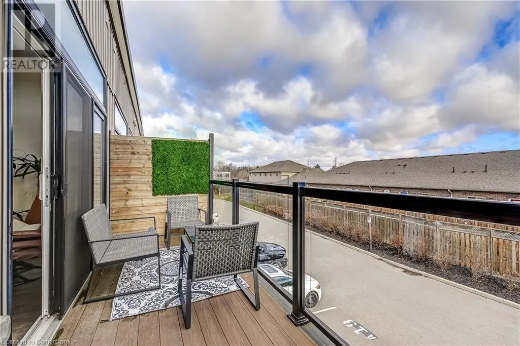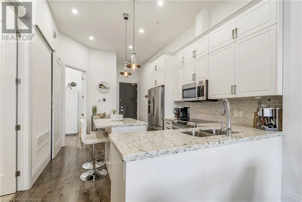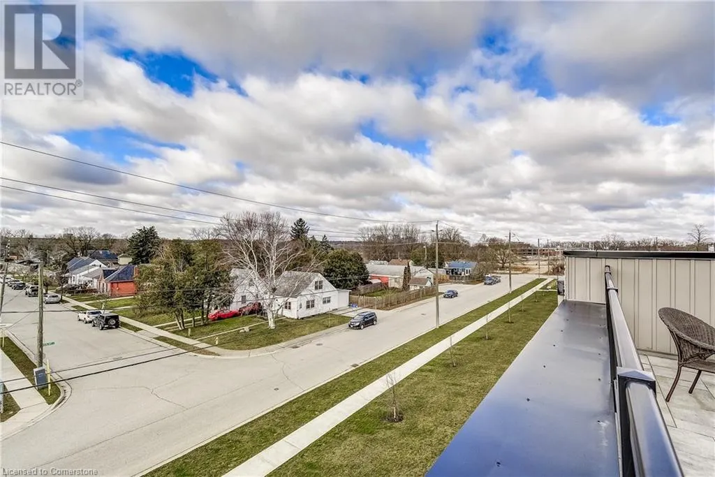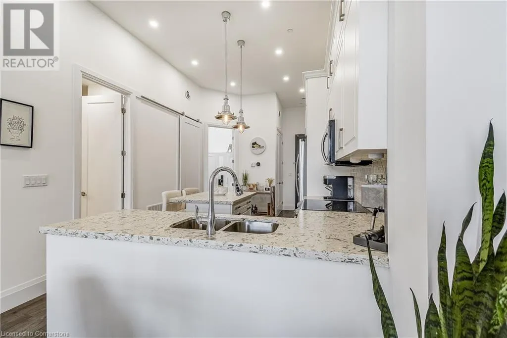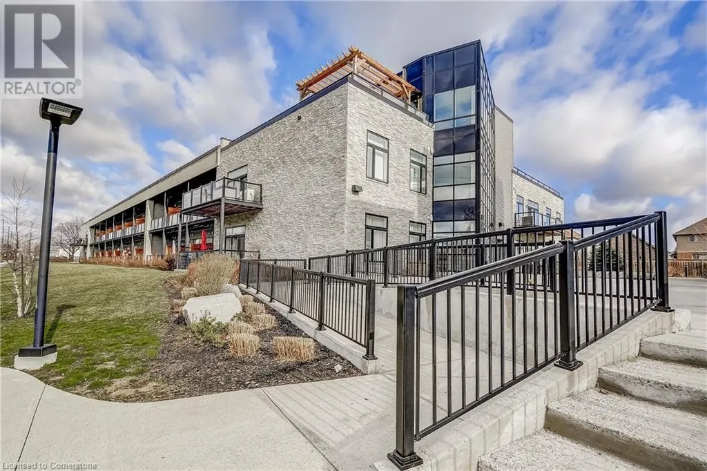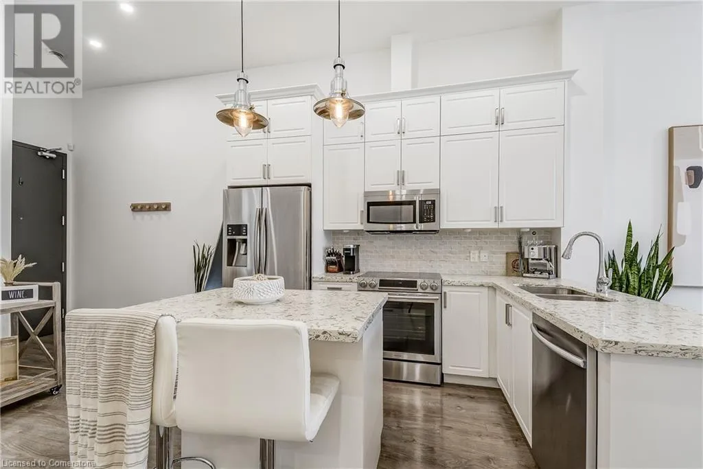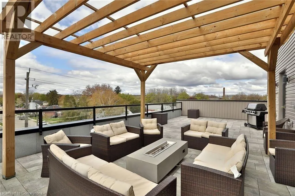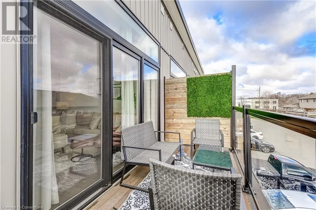 Dufferin to Morrell STUNNING! This is simply the only word one can use to describe this truly magazine worthy condo. Soaring 11 Ft ceilings with elegant 8 foot tall doors, stepping into this home for the first time is nothing short of Breathtaking. Oversized modern windows flood the living space with natural light, while the newly painted Benjamin Moore Chantilly lace paint provides the perfect airy canvas for your interior design. The well laid out kitchen provides lots of quartz countertop for prep space, while the peninsula allows you to work in the kitchen while entertaining and being part of the conversation in the living room. Adding to the grand feel is the double-high premium cabinets with crown moulding providing lots of extra storage. All new light fixtures and potlights were installed throughout in 2021, all of which are on wifi smart light switches. Create beautiful mood lighting and various lighting scenes with a simple voice command. The large primary bedroom has ensuite access to the 4-pc bath and the stackable laundry set hidden behind the sliding door makes for an easy laundry day. A second bedroom with gorgeous skylight and oversized closet provide a lot of versatility to the unit. Outside is a tranquil 19'x5' deck to enjoy morning coffees. Upstairs are two large roof-top terraces with lounges, Fire-table, and BBQ's, as well a games and entertainment room for when entertaining bigger parties. The unit is situated near the highway, The Grand River and many hiking trails. (id:27476)