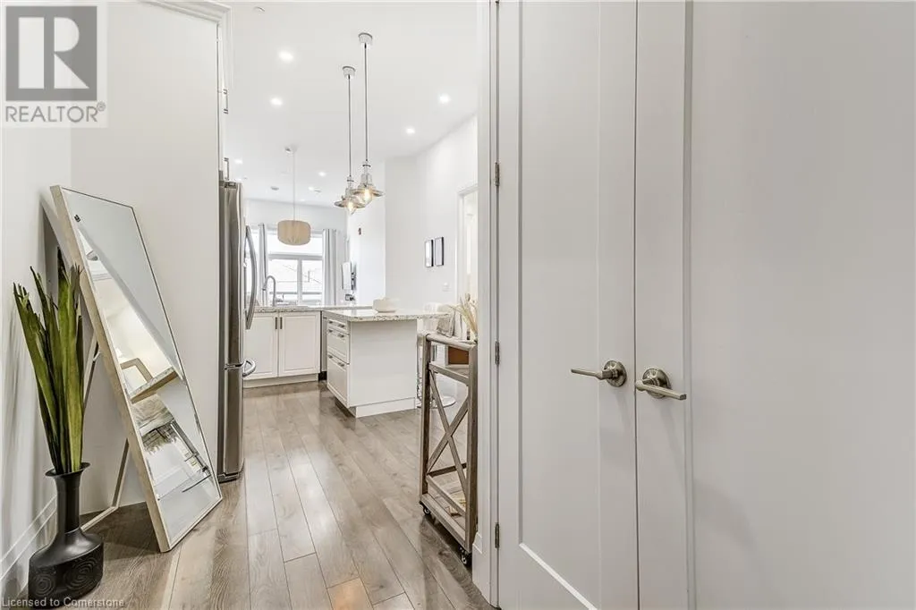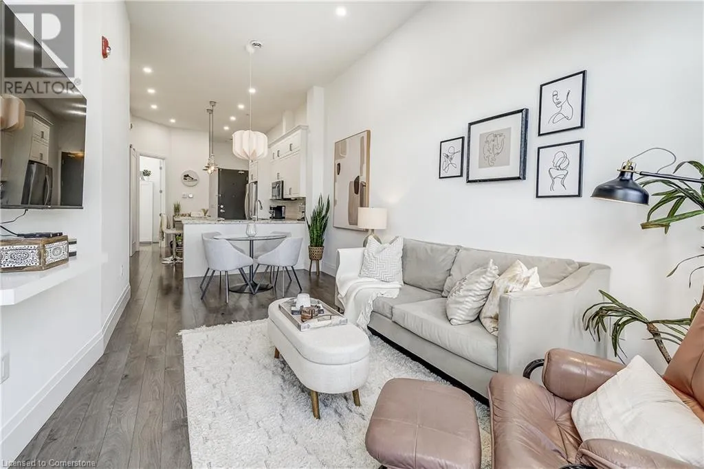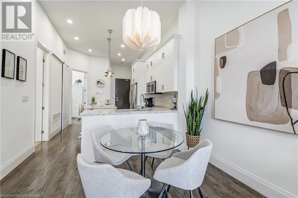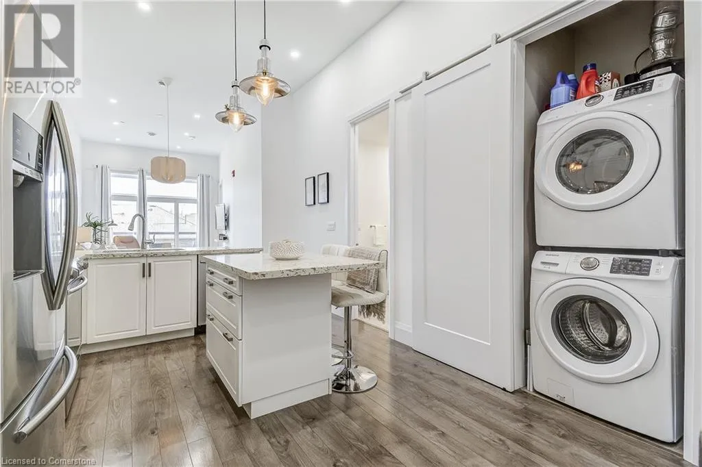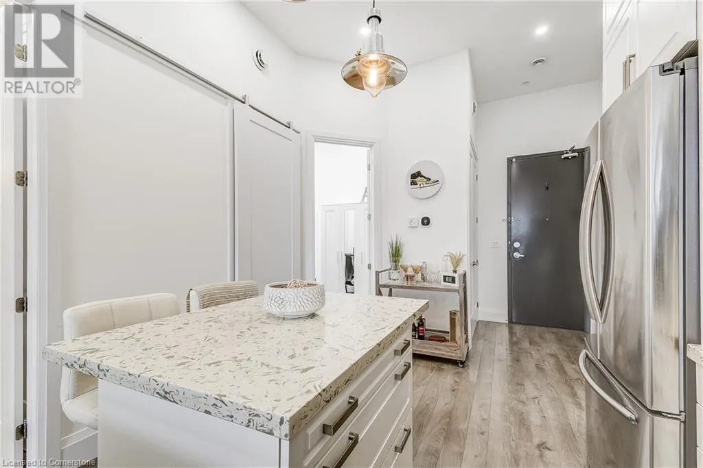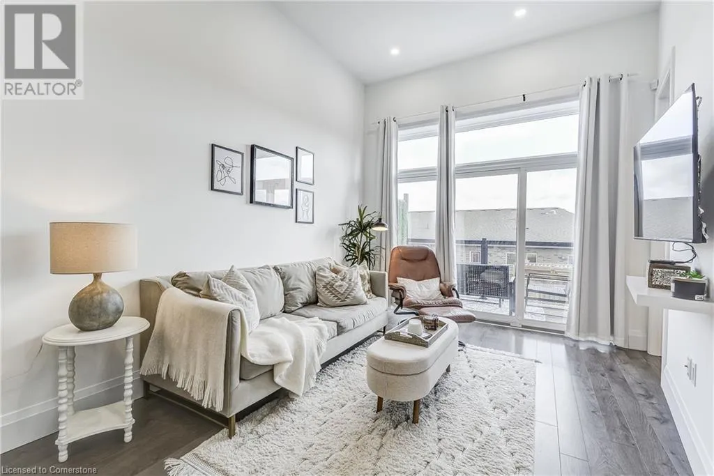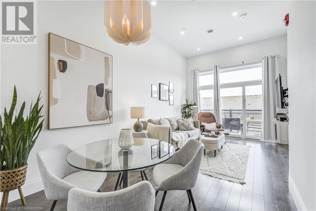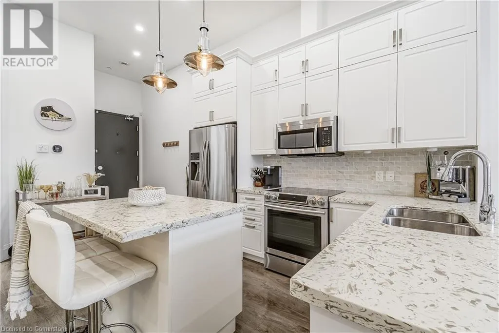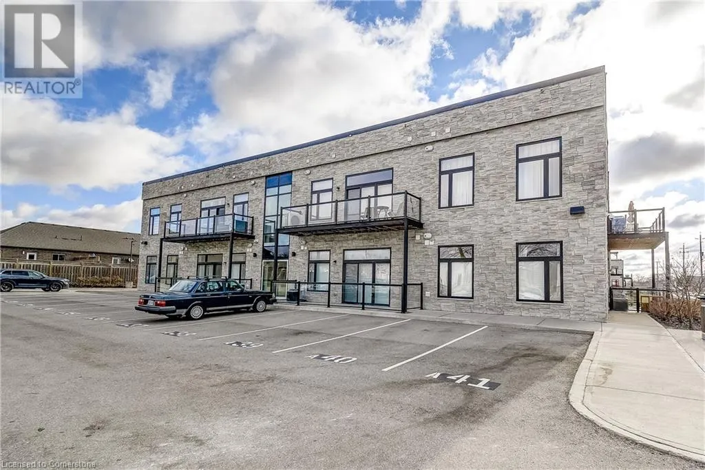 Dufferin to Morrell STUNNING! This is simply the only word one can use to describe this truly magazine worthy condo. Soaring 11 Ft ceilings with elegant 8 foot tall doors, stepping into this home for the first time is nothing short of Breathtaking. Oversized modern windows flood the living space with natural light, while the newly painted Benjamin Moore Chantilly lace paint provides the perfect airy canvas for your interior design. The well laid out kitchen provides lots of quartz countertop for prep space, while the peninsula allows you to work in the kitchen while entertaining and being part of the conversation in the living room. Adding to the grand feel is the double-high premium cabinets with crown moulding providing lots of extra storage. All new light fixtures and potlights were installed throughout in 2021, all of which are on wifi smart light switches. Create beautiful mood lighting and various lighting scenes with a simple voice command. The large primary bedroom has ensuite access to the 4-pc bath and the stackable laundry set hidden behind the sliding door makes for an easy laundry day. A second bedroom with gorgeous skylight and oversized closet provide a lot of versatility to the unit. Outside is a tranquil 19'x5' deck to enjoy morning coffees. Upstairs are two large roof-top terraces with lounges, Fire-table, and BBQ's, as well a games and entertainment room for when entertaining bigger parties. The unit is situated near the highway, The Grand River and many hiking trails. (id:27476)