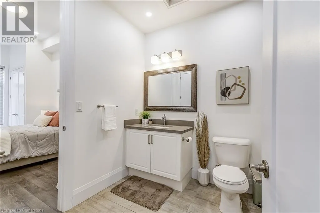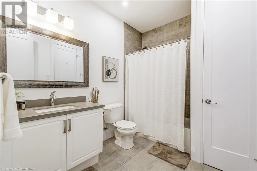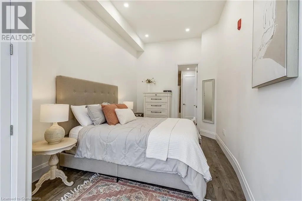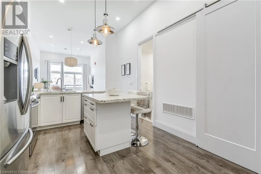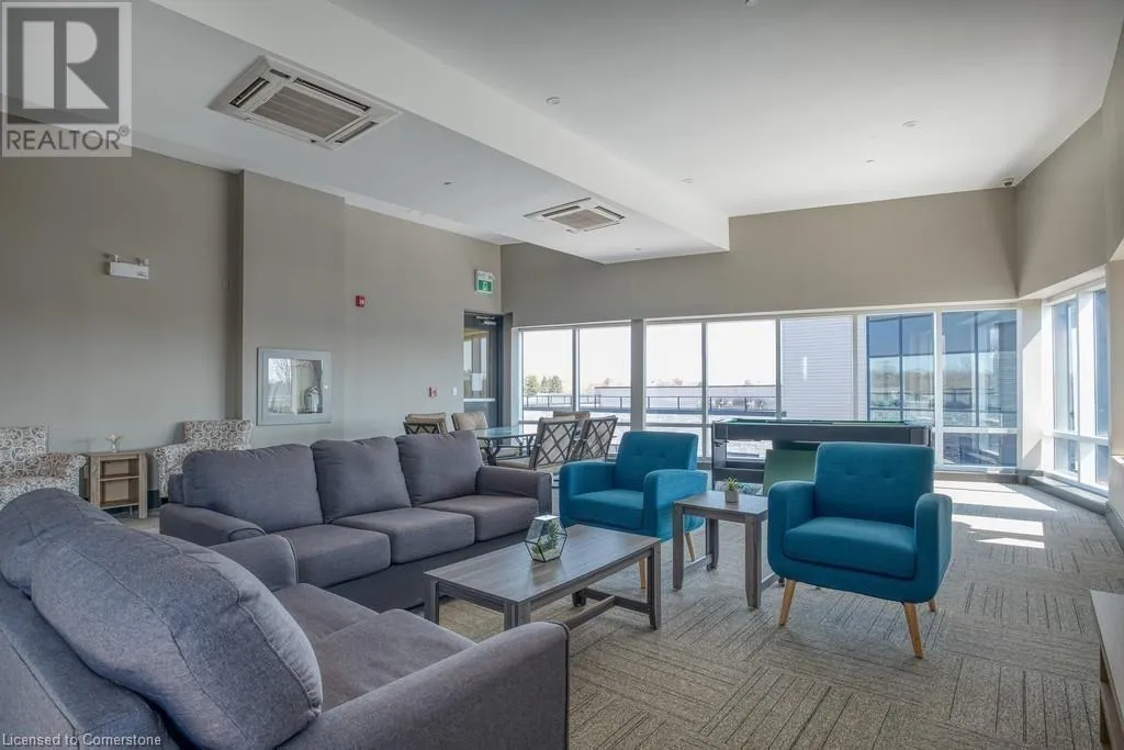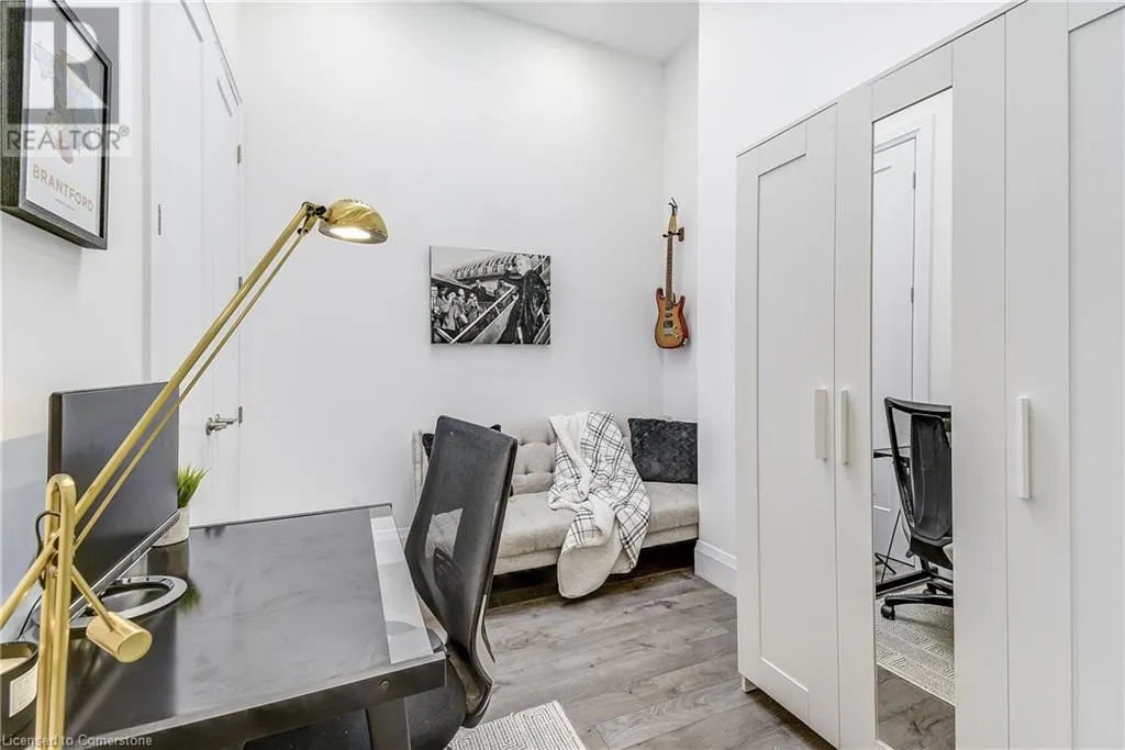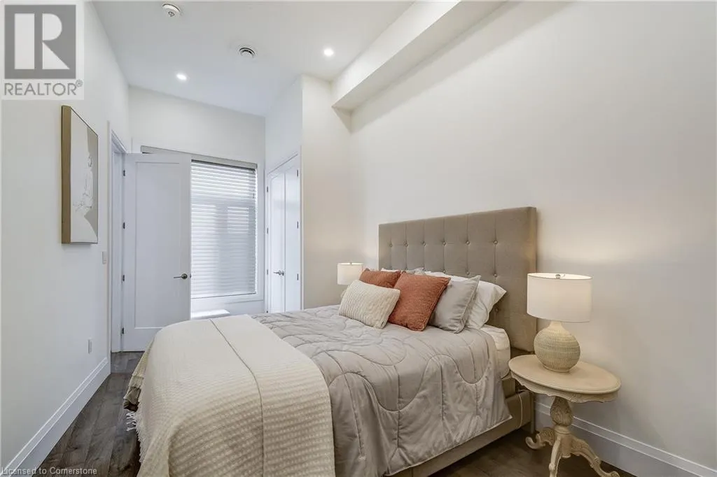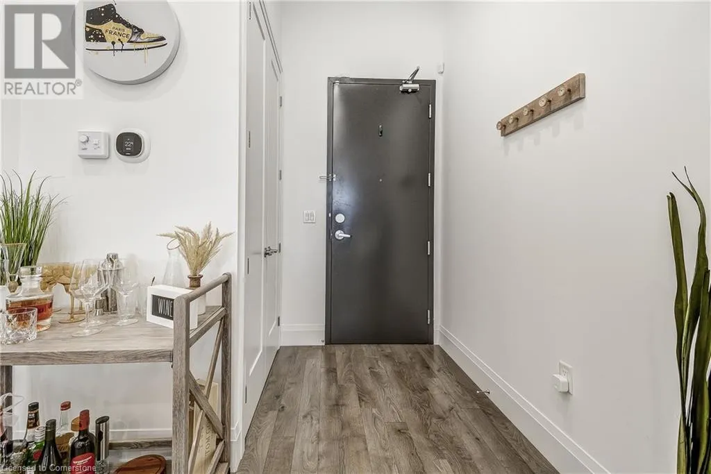 Dufferin to Morrell STUNNING! This is simply the only word one can use to describe this truly magazine worthy condo. Soaring 11 Ft ceilings with elegant 8 foot tall doors, stepping into this home for the first time is nothing short of Breathtaking. Oversized modern windows flood the living space with natural light, while the newly painted Benjamin Moore Chantilly lace paint provides the perfect airy canvas for your interior design. The well laid out kitchen provides lots of quartz countertop for prep space, while the peninsula allows you to work in the kitchen while entertaining and being part of the conversation in the living room. Adding to the grand feel is the double-high premium cabinets with crown moulding providing lots of extra storage. All new light fixtures and potlights were installed throughout in 2021, all of which are on wifi smart light switches. Create beautiful mood lighting and various lighting scenes with a simple voice command. The large primary bedroom has ensuite access to the 4-pc bath and the stackable laundry set hidden behind the sliding door makes for an easy laundry day. A second bedroom with gorgeous skylight and oversized closet provide a lot of versatility to the unit. Outside is a tranquil 19'x5' deck to enjoy morning coffees. Upstairs are two large roof-top terraces with lounges, Fire-table, and BBQ's, as well a games and entertainment room for when entertaining bigger parties. The unit is situated near the highway, The Grand River and many hiking trails. (id:27476)