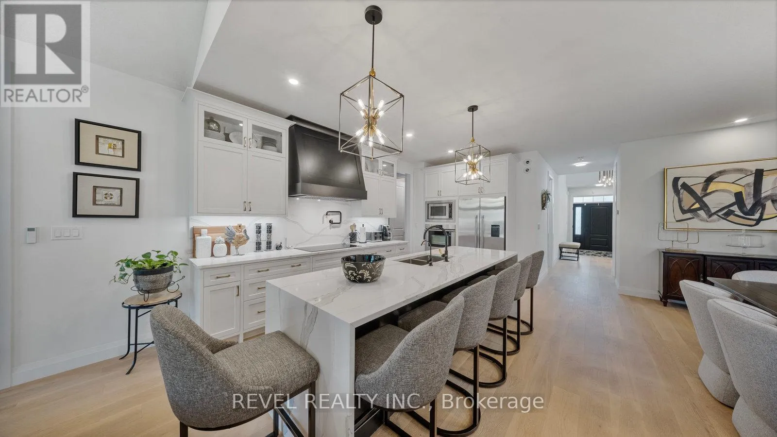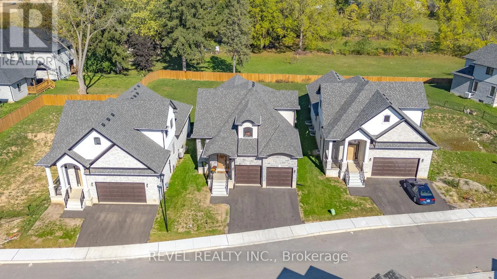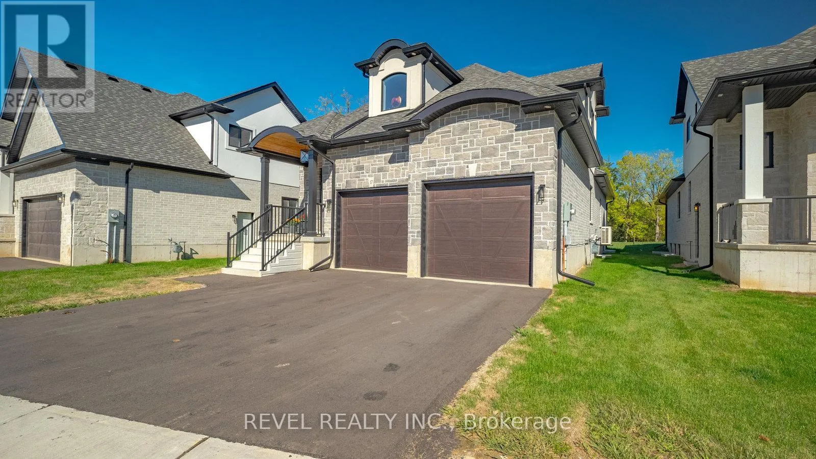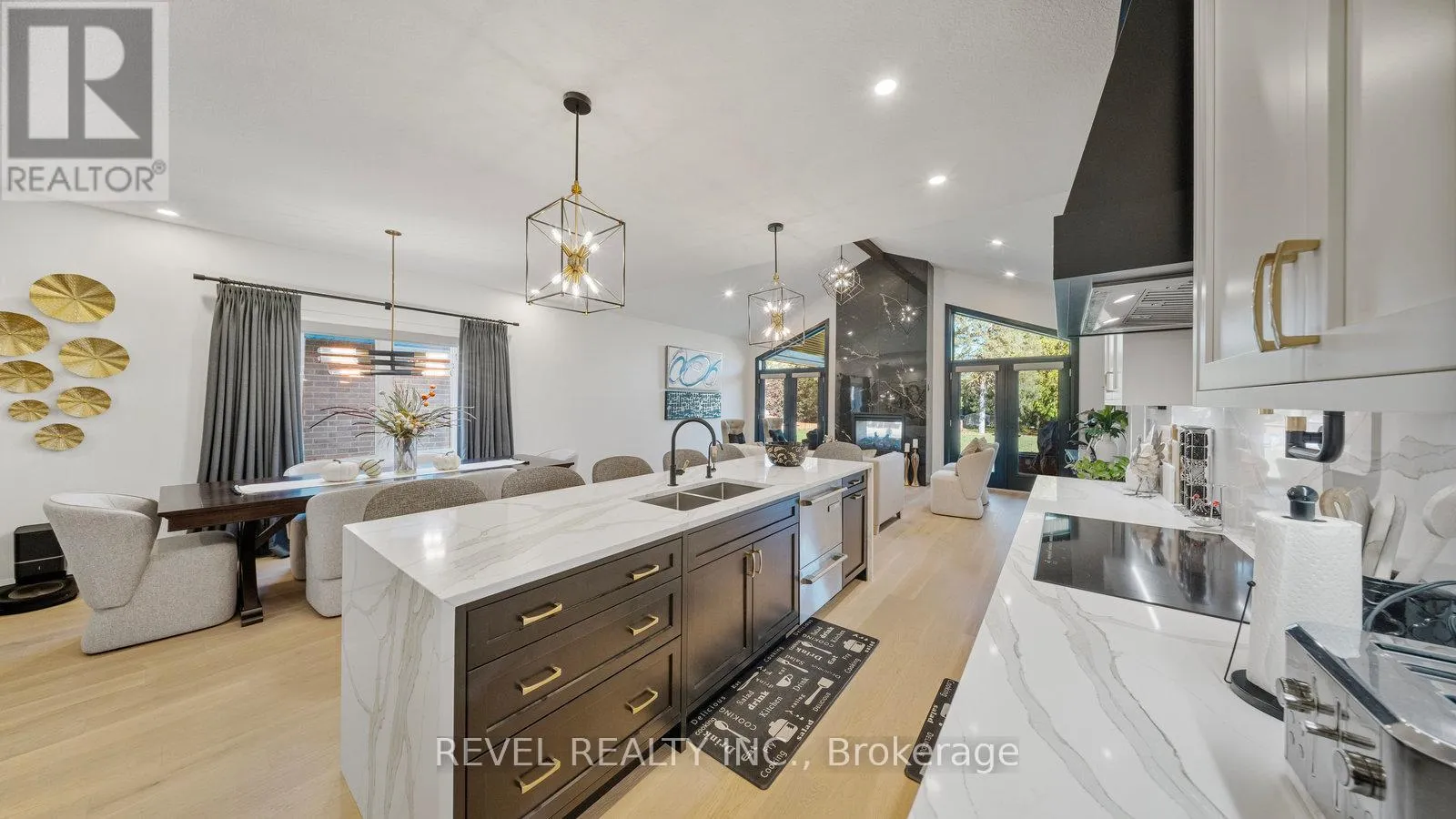 Veterans Memorial and Mount Pleasant St Welcome to 242 Mount Pleasant Street #17, an exceptional residence in Brantford's sought-after Lions Park Estates. Nestled on a quiet cul-de-sac just steps from Lions Park, Gilkinson Trail, and the Grand River, this home blends sophistication, comfort, and convenience in one breathtaking package. With 4+1 bedrooms, 3.5 bathrooms, and over 4,300 square feet, the property showcases more than $330,000 in upgrades. The main floor impresses with soaring ceilings, wide-plank hardwoods, and an open layout anchored by a dramatic dual-sided fireplace connecting the living room to the covered back patio. Evenings here can be spent fireside, cooled by a built-in fan, and surrounded by nature. The gourmet kitchen is a showpiece with an oversized waterfall island, custom cabinetry, and Fisher & Paykel appliances. Open sightlines to the dining and living areas make it ideal for gatherings, while designer lighting adds elegance throughout. The primary suite offers a true retreat with a tray ceiling, private patio walkout, spa-like ensuite with Riobel fixtures, freestanding soaker tub, glass shower, and double vanity, plus a custom walk-in dressing room. Upstairs are two additional bedrooms, a full bathroom, and a versatile loft perfect for an office, study, or lounge. The fully finished lower level extends the home with an impressive in-law suite including a kitchenette, bedroom, full bathroom, spacious living/dining area, and a stylish bar with rec room perfect for guests or multigenerational living. Unique features include a dog spa in the mudroom, a dedicated main-floor office (or bedroom), electric vehicle charging stations, and a covered outdoor living space for year-round entertaining. This is more than a home: it's a lifestyle. (id:27476)