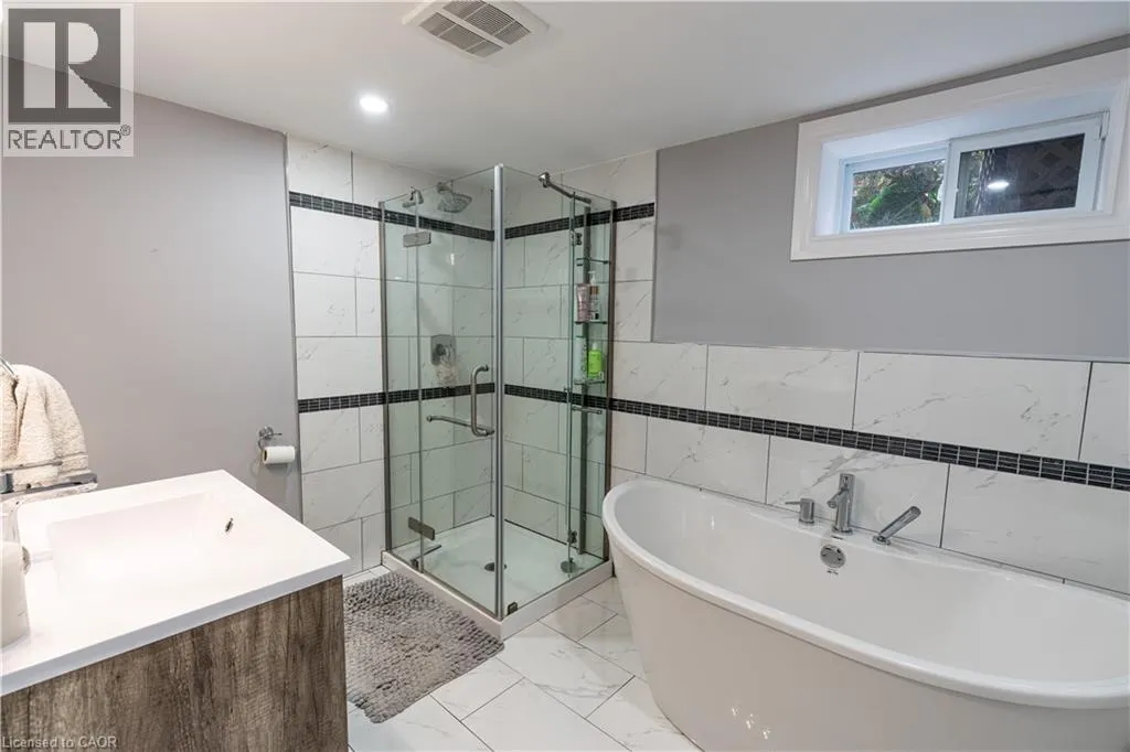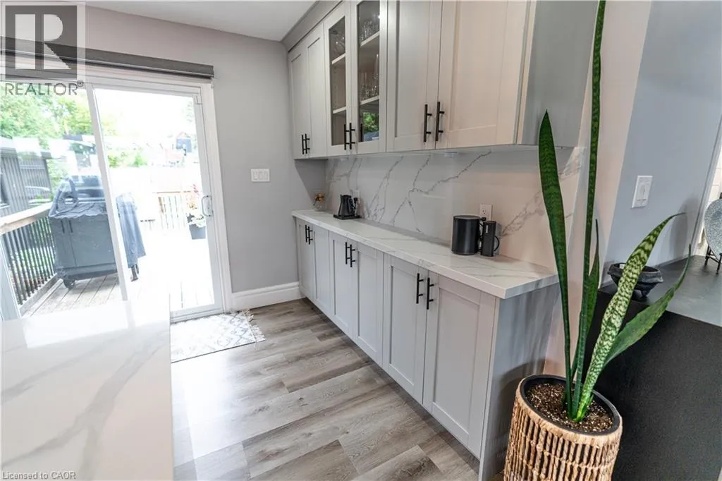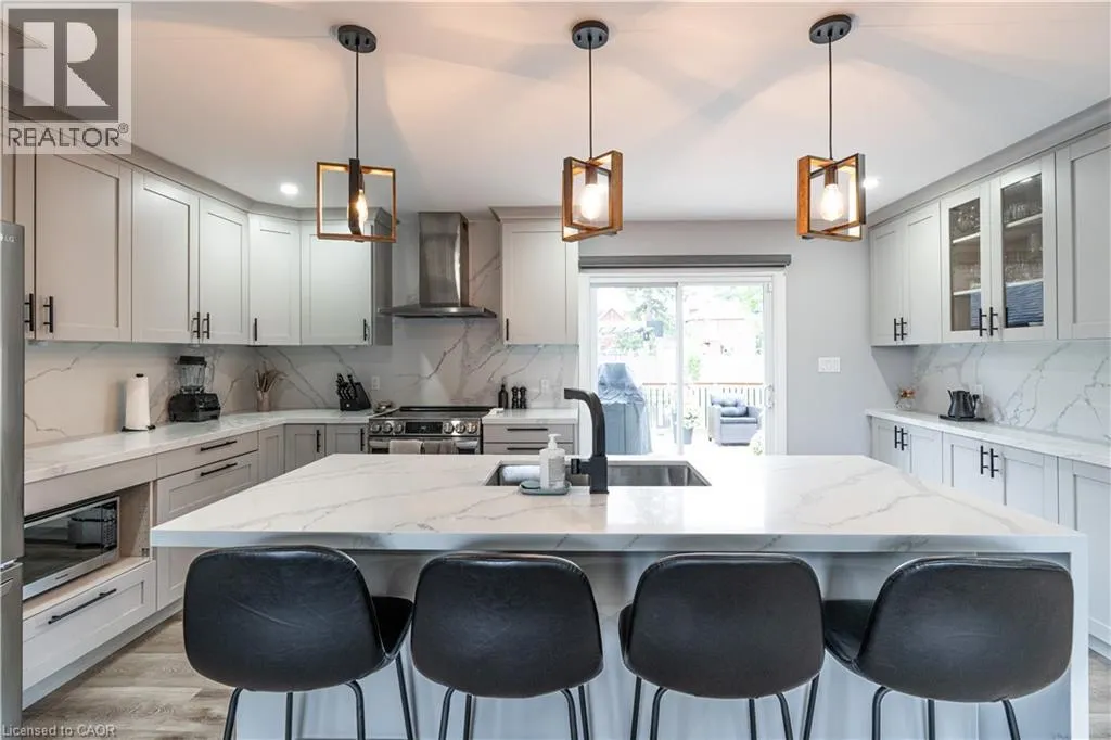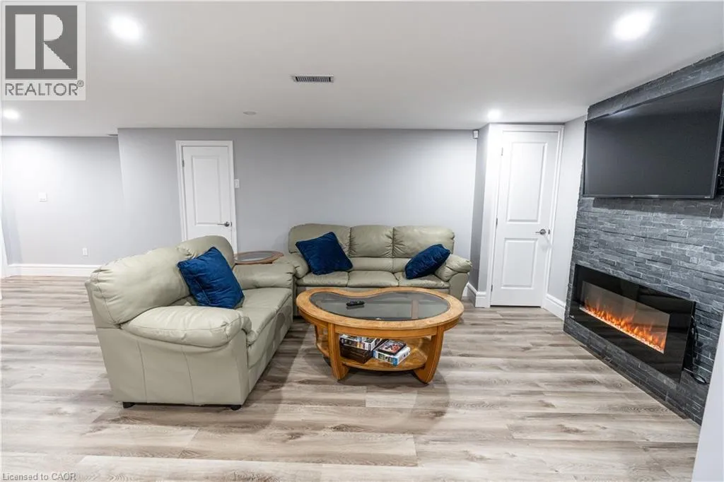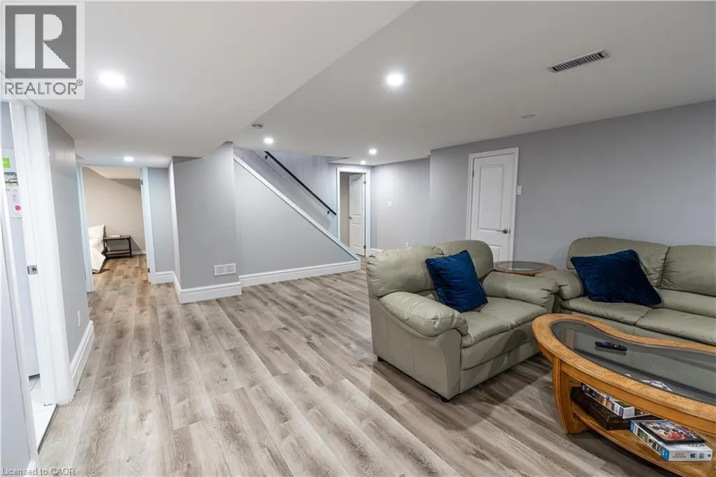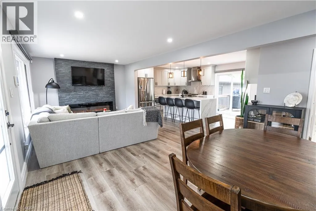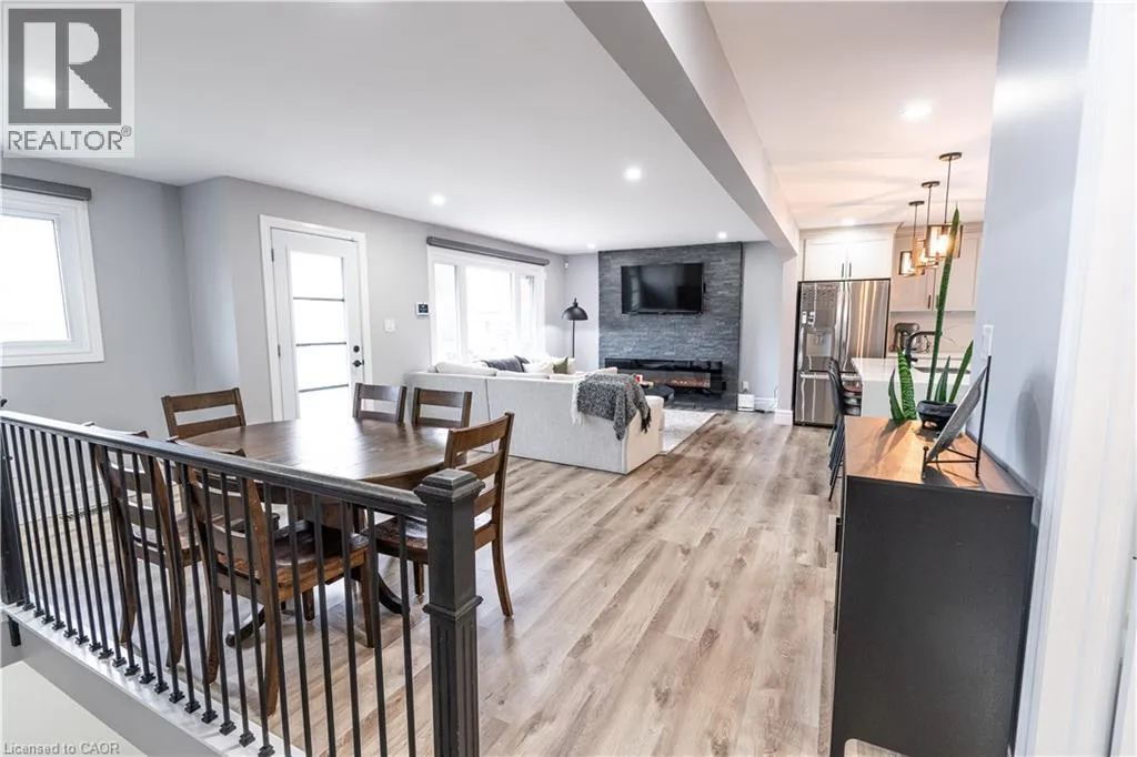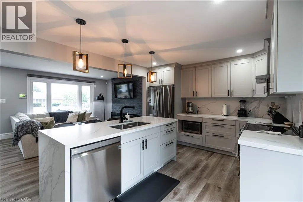 North Park St to Russell St Welcome to 19 Russell Street, a meticulously renovated bungalow nestled in the heart of Brantford. This move-in-ready home offers 2 spacious bedrooms on the main floor and 2 additional bedrooms in the fully finished basement, making it ideal for growing families, multi-generational living, or those seeking flexible space. Step inside to discover an open-concept layout featuring a sun-filled living room with a sleek electric fireplace and wall-mounted TV, perfect for cozy evenings. The modern kitchen is a chefâs dream, boasting quartz countertops, stainless steel appliances, stylish cabinetry, and LED pot lighting. Sliding glass doors lead to a large private, fully fenced backyard complete with a deck and pergola âperfect for summer barbecues or quiet morning coffee. Downstairs, the professionally finished basement offers a generous rec room, a second full bathroom, and a dedicated laundry area. Outside, you'll appreciate the detached garage and paved, extra-long asphalt driveway that easily accommodates multiple vehiclesâperfect for families or visitors. Located close to schools, parks, shopping, and public transit, this home combines comfort, convenience, and contemporary style in one of Brantfordâs most established communities. Donât miss your chance to own this turnkey gem. (id:27476)