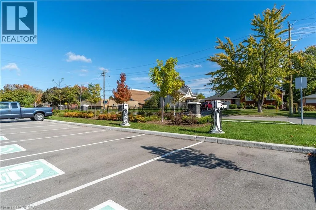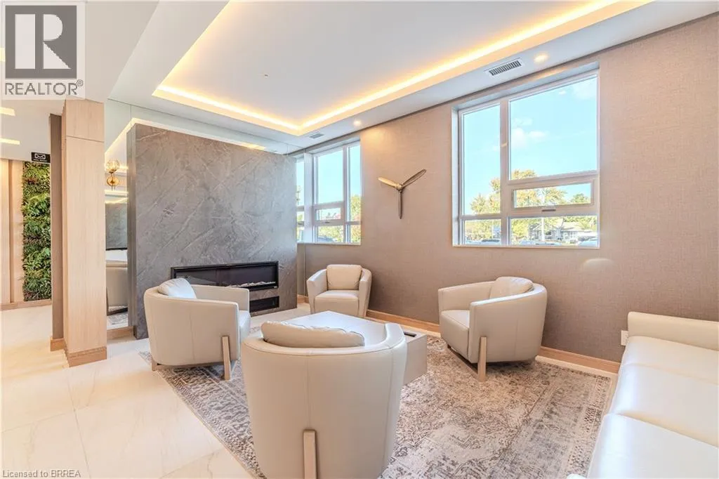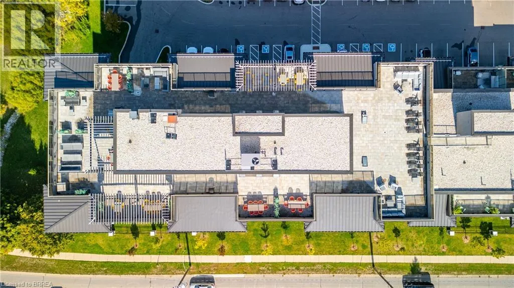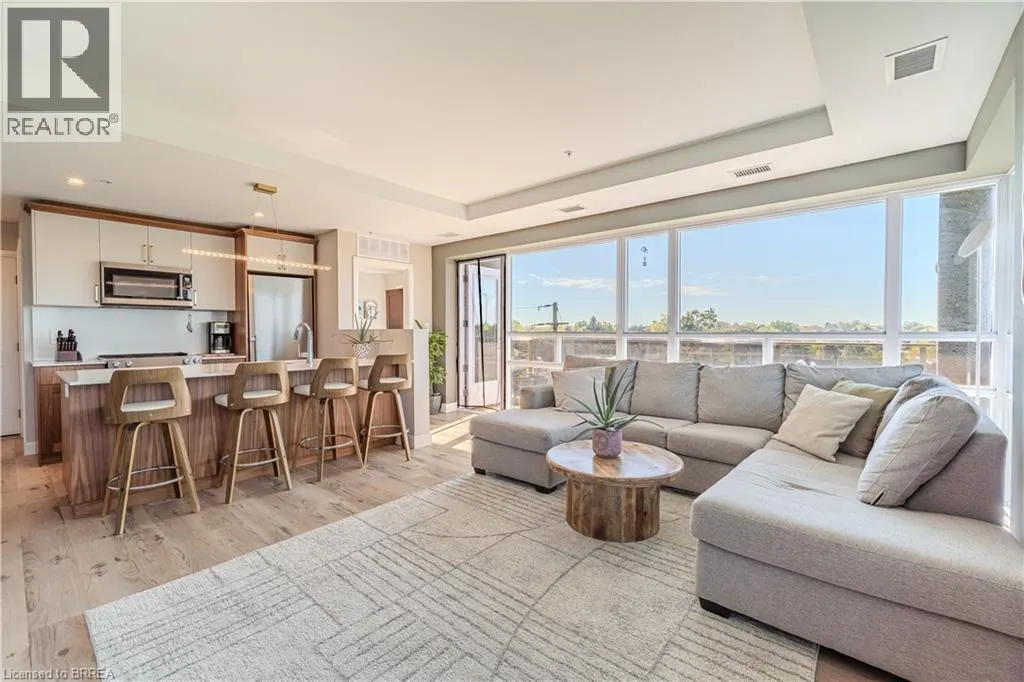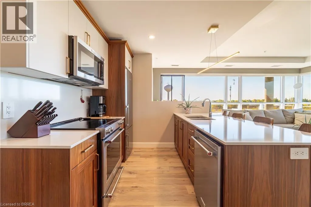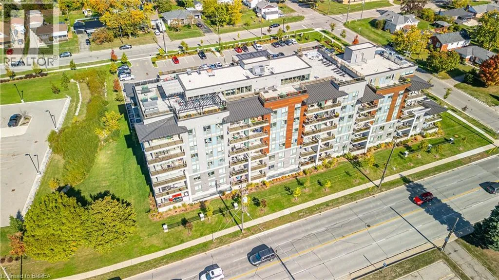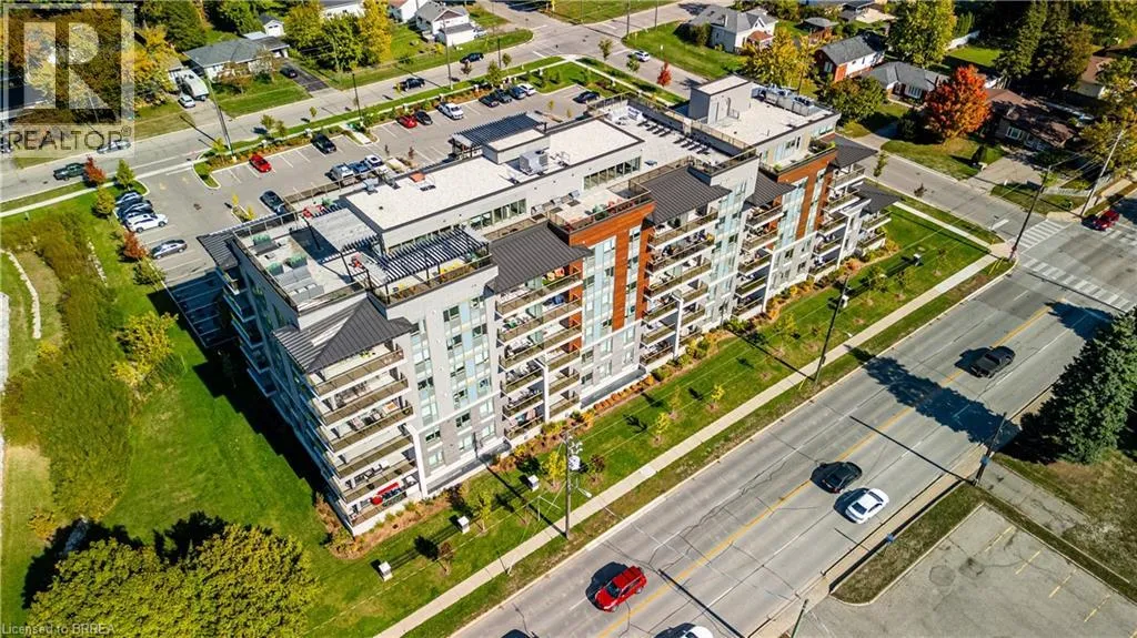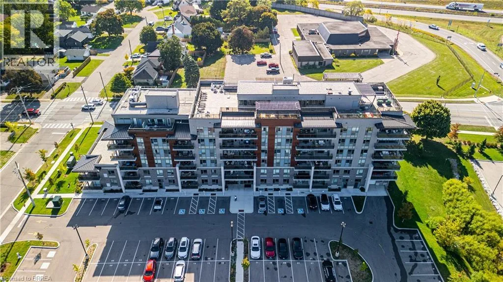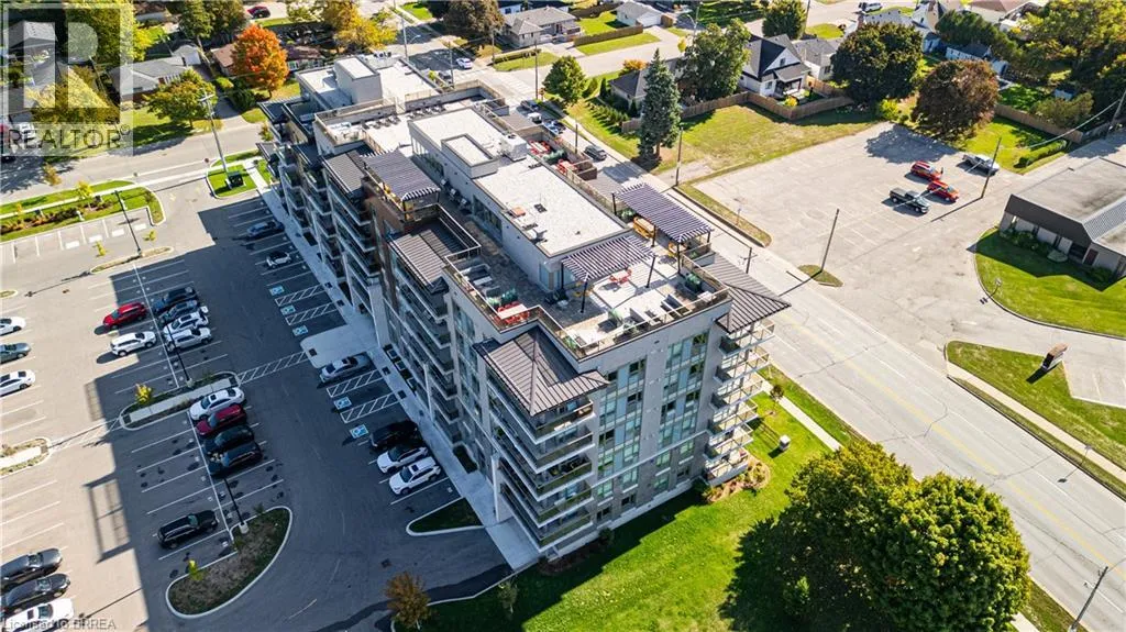 fairview to wayne to norman From the moment you arrive, youâll feel like youâve stepped into a boutique hotel â luxurious, stylish, and far from ordinary. Paying homage to the historic Brantford Flying Club, The Landing blends aviation-inspired design with modern elegance and top-tier craftsmanship. This premium southwest corner unit on the 4th floor offers 900 sq ft of refined indoor living with floor-to-ceiling windows for an abundance of natural light and sweeping views. Step outside to enjoy 200 sq ft of private outdoor space on a covered, south-facing wraparound balcony â ideal for entertaining or relaxing. Inside, the 2-bedroom, 2-bathroom layout features 9â ceilings and a bright, open-concept design. The upgraded âSight Seerâ Interior Design Package includes: Walnut veneer & white kitchen cabinetry Premium Silestone solid surface countertops with matching backsplash Rich Luxury Vinyl Plank flooring throughout Shaker & slab-style cabinetry, designer lighting Chrome kitchen & bath fixtures,modern hardware Hexagonal bathroom tiles, cloud white trims, upgraded vanities Ensuite with tub & guest bathroom with walk-in glass shower Premium Appliance Package: Stainless steel fridge, convection range, microwave hood fan, dishwasher, and in-suite stacked washer & dryer 2 PARKING SPOTS, and a large storage locker are included. Building amenities: Rooftop patio, private speakeasy, fitness studio, and library. Location! Location! Location! Located at 34 Norman Street, this north-end gem provides immediate access to Highway 403 and King George Road, putting you minutes from top-tier restaurants, retail, schools, and all of Brantfordâs best amenities. This is not just a condo â itâs a lifestyle upgrade. Donât miss your chance to own one of the most desirable and well-appointed units in Brantfordâs most exciting and thoughtfully designed new development. This isnât just a condo â itâs a lifestyle upgrade. (id:27476)