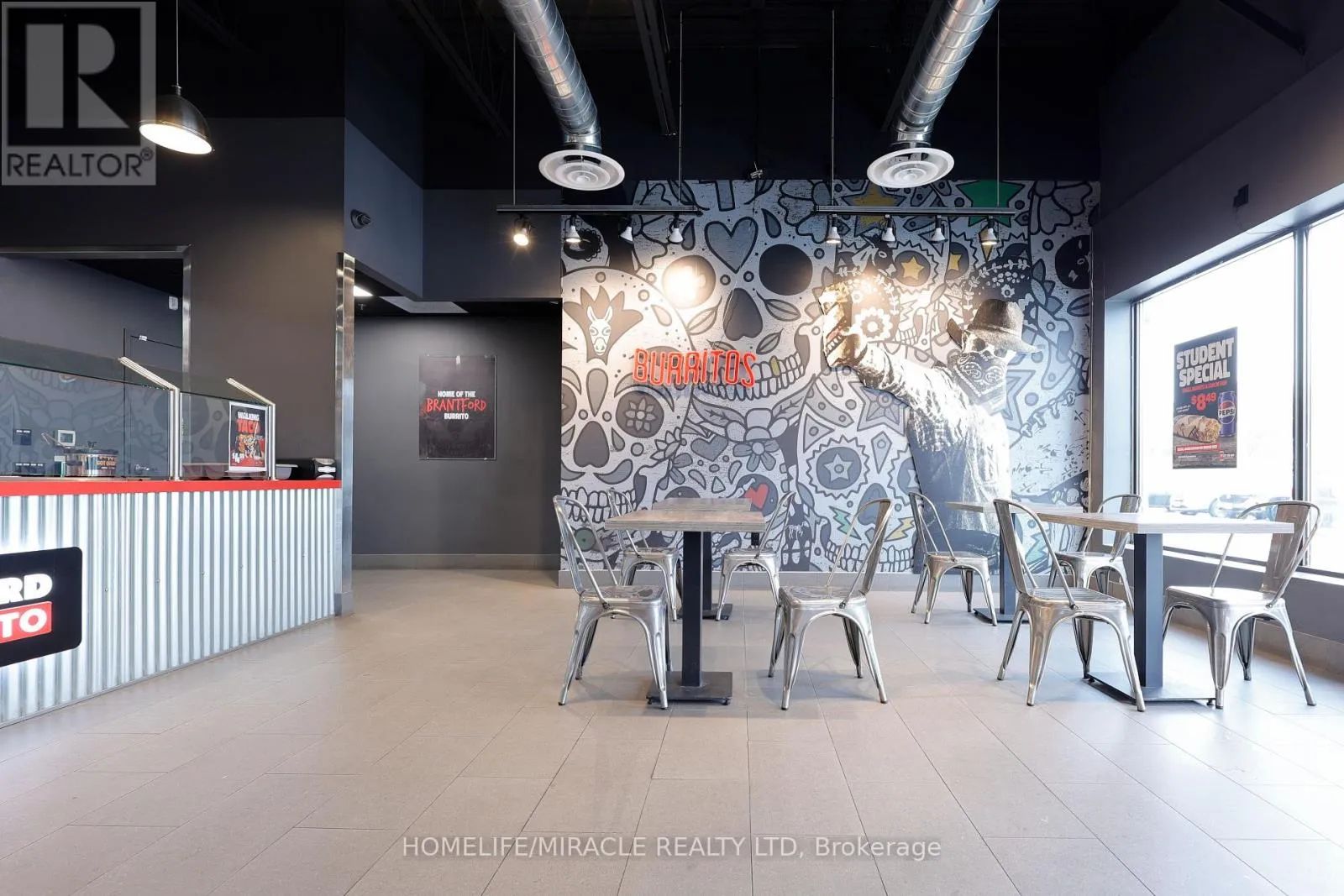 Cross Streets: Colborne St E/Kiwanis Way. ** Directions: Turn right on Colborne St E. Fat Bastard Burrito Business in Brantford, ON is For Sale. Located at the busy intersection of Colborne St E/Kiwanis Way. Surrounded by Fully Residential Neighbourhood, Close to Schools, Highway, Offices, Banks, Major Big Box Store and Much More. Business with so much opportunity to grow the business even more. Rent: $3545/m including TMI + HST, Lease Term: Existing 8.5 Years + 5 + 5 years Option to renew, Royalty: 8%, Advertising: 2%. (id:27476)