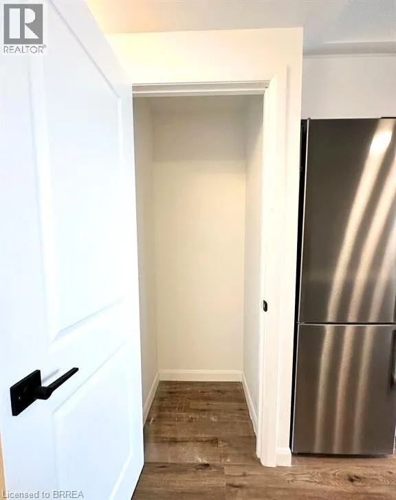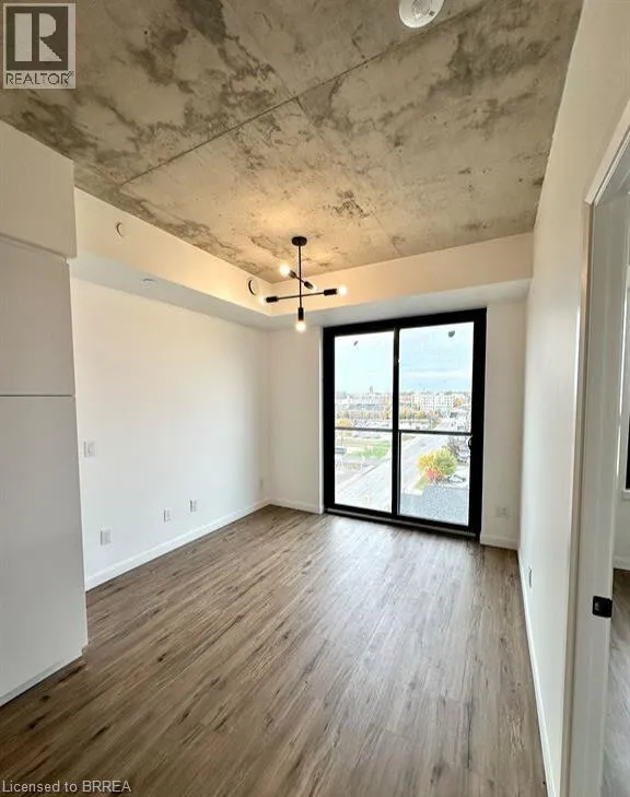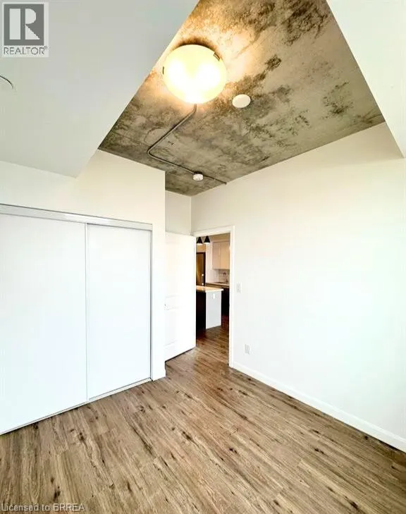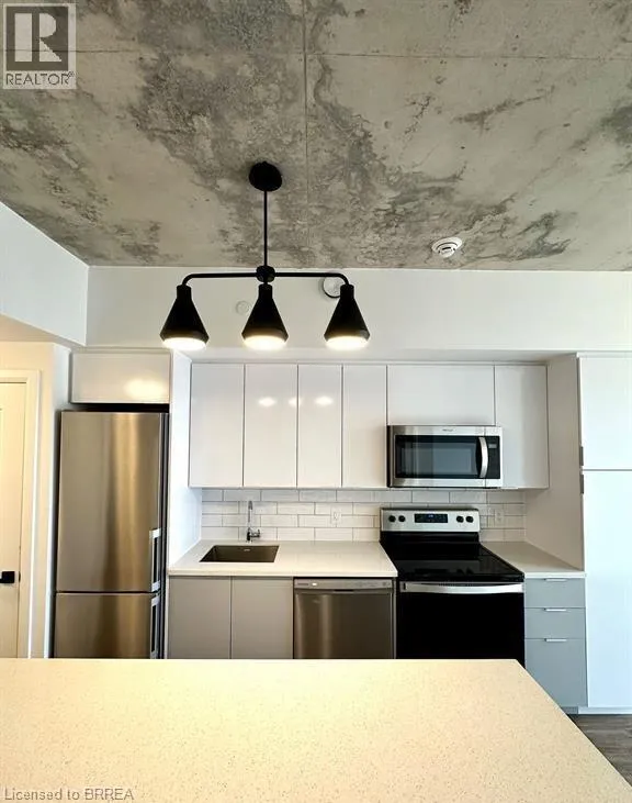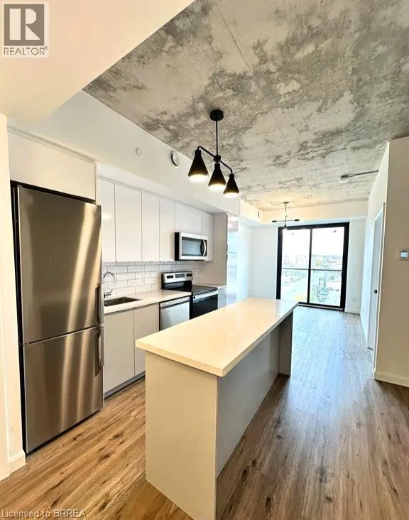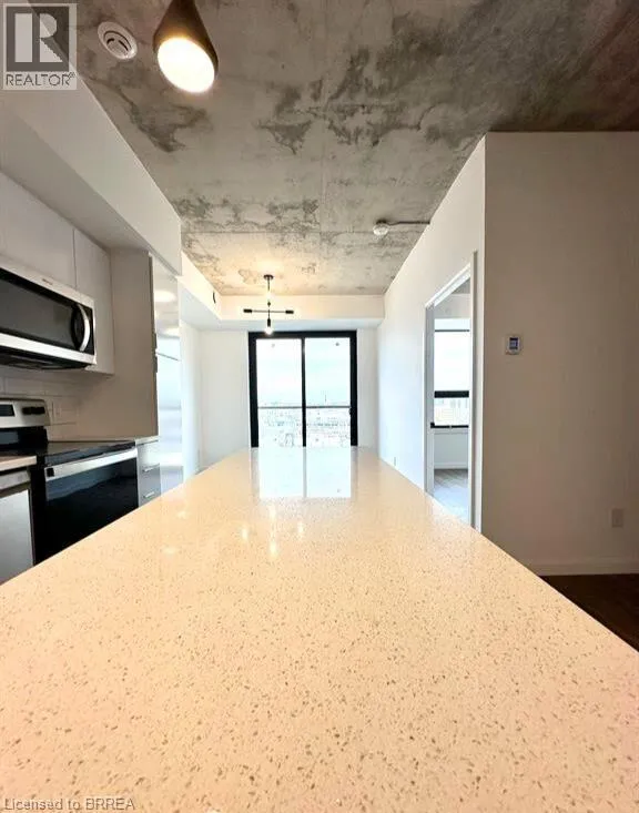 ERIE AVE AND MARKET ST SOUTH Penthouse Level Unit! Newly built 7 Erie Condo unit having 1 bedroom + den with luxury finishes. Large den can be used as a 2nd bedroom or office! 9' ceilings throughout, full bath with B/I vanity, in-suite laundry, large kitchen with quartz counter top and breakfast island, dedicated closet/pantry space, 1 covered parking and storage locker, modern finishes, upscale amenities and convenience. Located within walking distance to all amenities including grocery stores, restaurants, shopping, Laurier University, walking/biking trails along the Grand River, Earl Haig water park, TD Civic Centre for all the sports fans, and Freshco plaza with many amenities including Tim Hortons, Freshco, Beer Store, Boston Pizza And Many Others. Perfect Unit For Working Professionals Or Small Families! Available for December 1 2025. Rent is $1900 + Hydro. (id:27476)