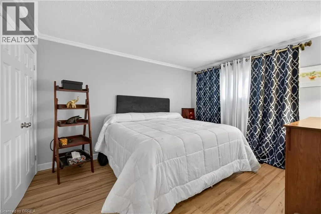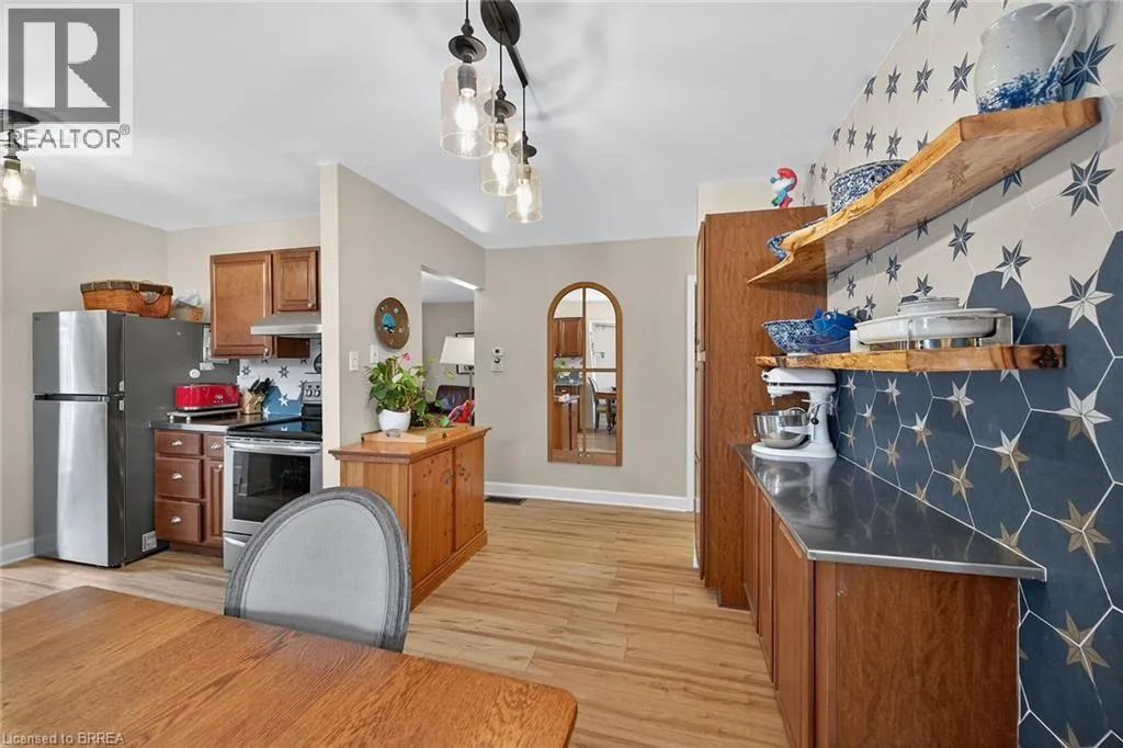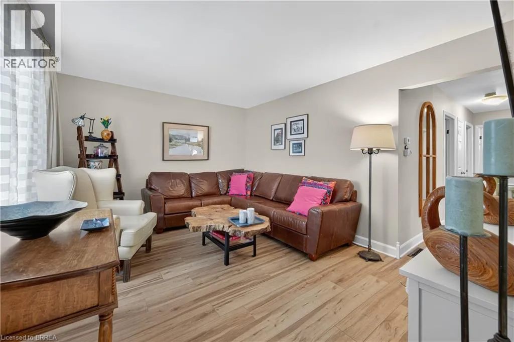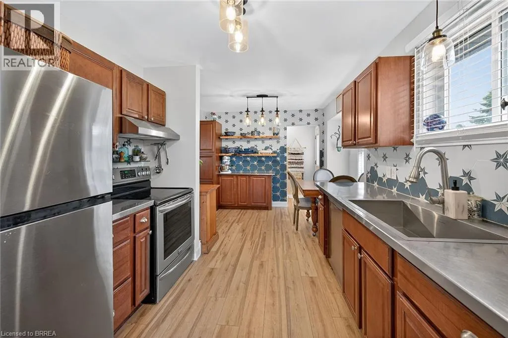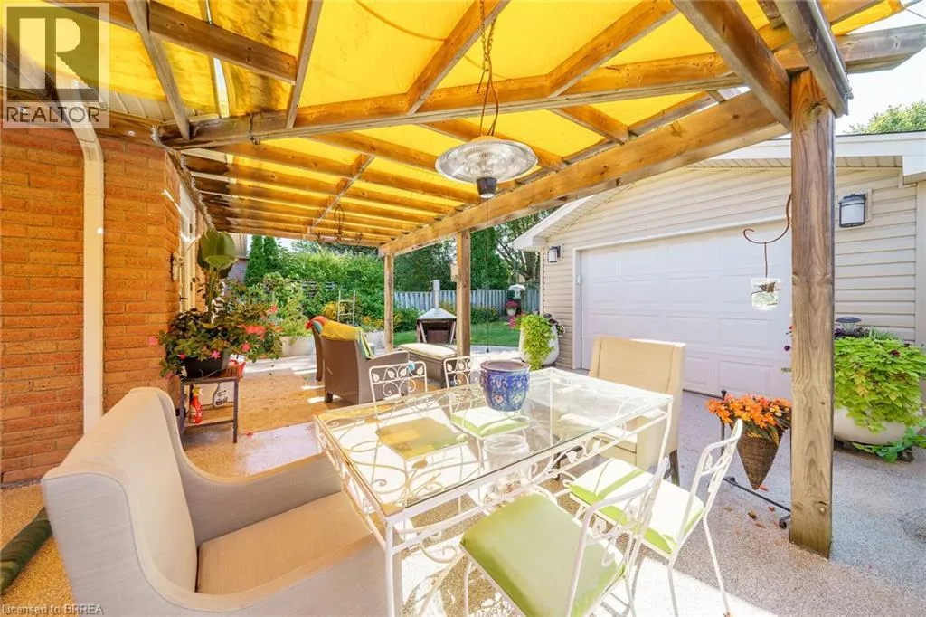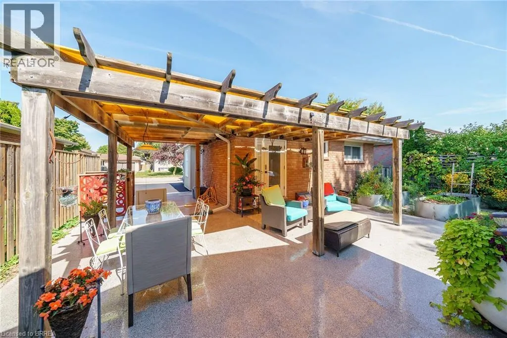FROM BRANTWOOD PARK RD TURN ONTO SYMPATICA CRESCENT-NAUTICAL ROAD IS OFF OF SYMPATICA CRESCENT Spectacular Brick Bungalow with Garage in Desirable North End Location! Larger than it looks, this beautifully updated all-brick bungalow offers 3+ bedrooms & 2 modern bathrooms, set on a well-landscaped, fully fenced lot in the sought-after Lynden Park area. Step inside to discover a fabulous eat-in kitchen featuring rich, warm-toned cabinetry, stainless steel appliances, & hygienic easy-to-clean stainless steel countertops complemented by a ceramic tile backsplash. A striking accent wall showcases a pantry & workstation with live-edge shelving & additional lower cabinetry. A side door off the eating area allows for easy access to the rear yard & patio for summer entertaining & BBQ's. The spacious living room features a large picture window, newer luxury vinyl plank flooring that flows throughout the main floor. The updated main bath offers a modern vessel sink & fixtures. 3 well appointed bedrooms complete this level-one with direct access to the rear patio. Downstairs, youâll find a beautifully finished lower level with a spacious family room featuring a gas fireplace, surround sound system, built-in shelving & desk area, & gorgeous honed & polished travertine tile flooring. The lower level also includes a modern 3-piece bath with a walk-in shower, & a bonus room currently used as a 4th bedroom with ample storage & closet space. This home is truly move-in ready and ideally located just minutes from Hwy 403 -perfect for commuters. Enjoy being within walking distance to both public & separate schools, & only minutes from Lynden Park Mall, grocery stores, most amenities, & the new Costco. The extra-long paved driveway provides ample parking & features rolling gates for easy access to the newer single-car garage. In the private backyard, relax or entertain on the durable epoxy-coated patio under the huge shaded pergola-perfect for family gatherings or weekend staycations. Most newer windows/exterior doors. Move right in & start living your North End dream today! (id:27476)