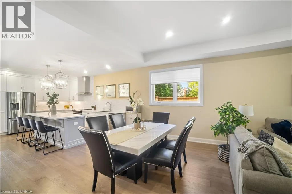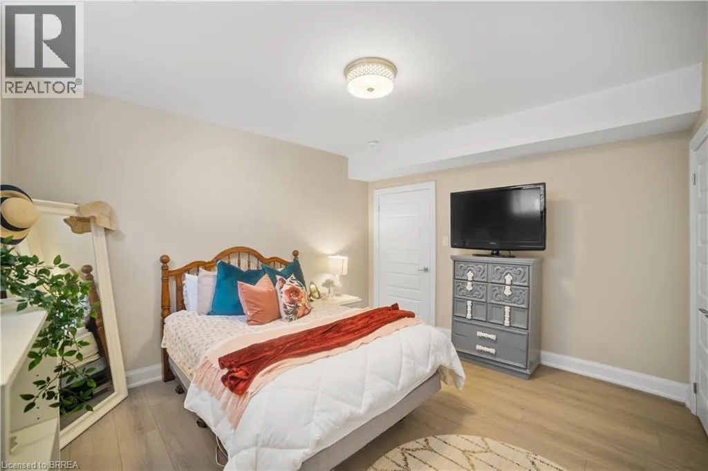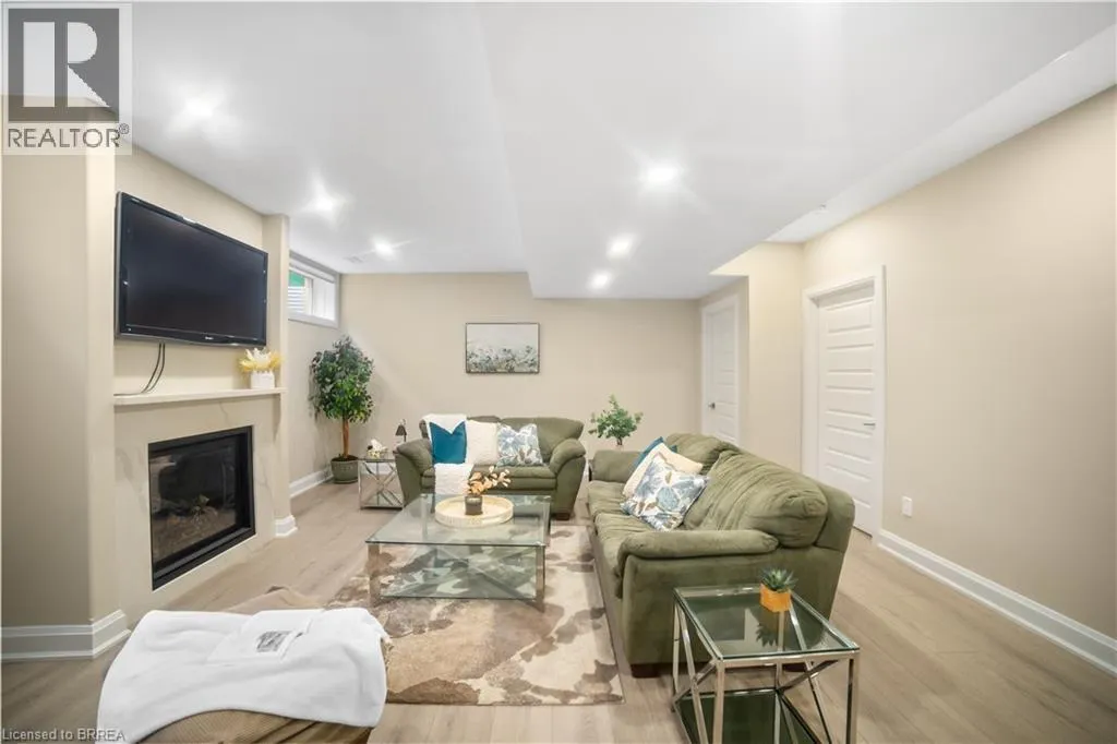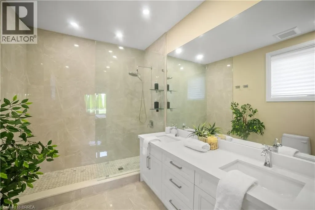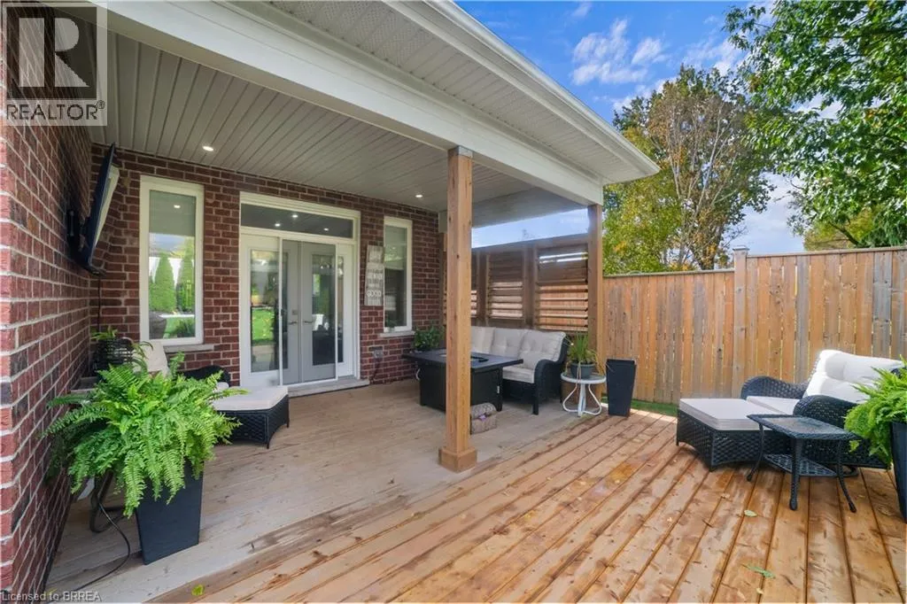 Travelling south on Mt. Pleasant Street, turn right onto Beckett Drive Welcome to your dream home in Brantford's Beckett neighbourhood. This stunning custom-built 3-bedroom, 3-bathroom detached condominium bungalow perfectly blends modern elegance, comfort, and convenience. Nestled in a serene and sought-after community, this residence showcases a spacious open-concept design where the living room, dining area, and kitchen flow seamlessly together, creating an inviting atmosphere ideal for both relaxation and entertaining. Clean architectural lines, 9â ceilings on both levels, and large windows fill the home with natural light, highlighting the beautiful engineered hardwood floors and sleek finishes throughout. The striking kitchen is a true showpiece, featuring custom white cabinetry, quartz countertops, stainless steel appliances, and a generous island â a perfect space for culinary creativity or casual gatherings. The relaxing living room leads directly out to a large covered deck overlooking a beautifully landscaped backyard â perfect for outdoor entertaining or quiet moments in nature. The primary bedroom easily accommodates a king-sized bed and offers a walk-in closet along with a spa-inspired ensuite boasting dual vanities and a luxurious walk-in shower. The fully finished lower level expands your living space with wide-plank luxury vinyl flooring, a cozy family area anchored by a gas fireplace, two additional spacious bedrooms with wall-to-wall closets, a bonus room, and a stylish bathroom. Additional highlights include an elegant oak staircase, energy-efficient windows, abundant pot lighting, underground automated irrigation system, and a one-car garage. With thoughtful upgrades, high-end finishes, and meticulous craftsmanship, thereâs nothing left to do but move in and enjoy this exceptional quality-built home. Book your showing today! (id:27476)