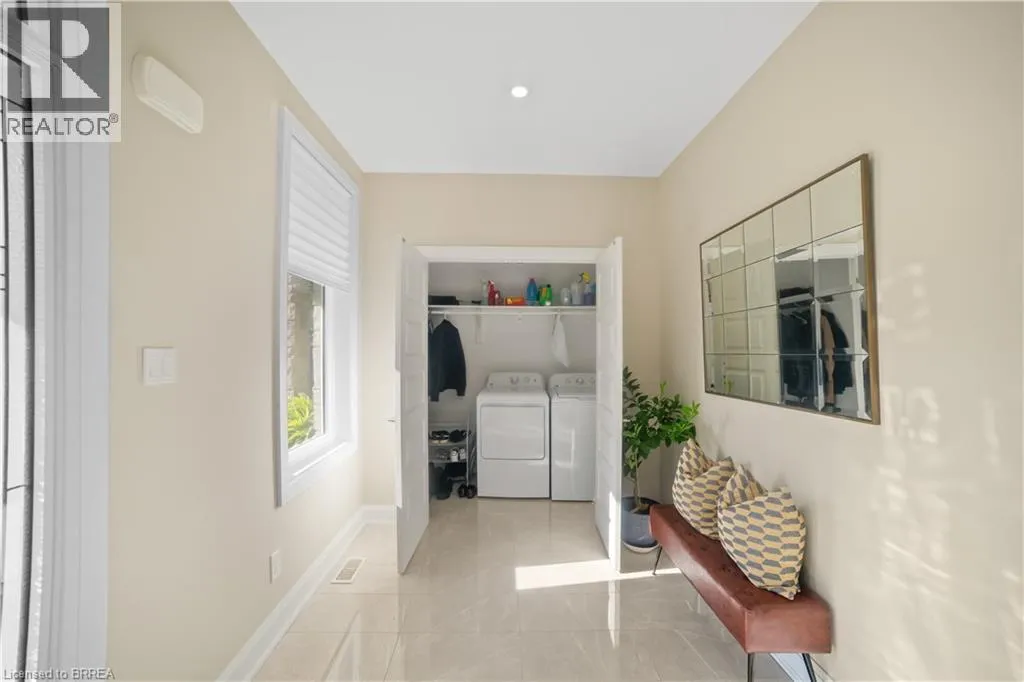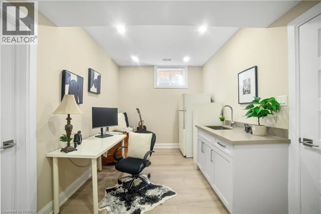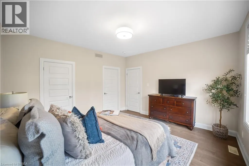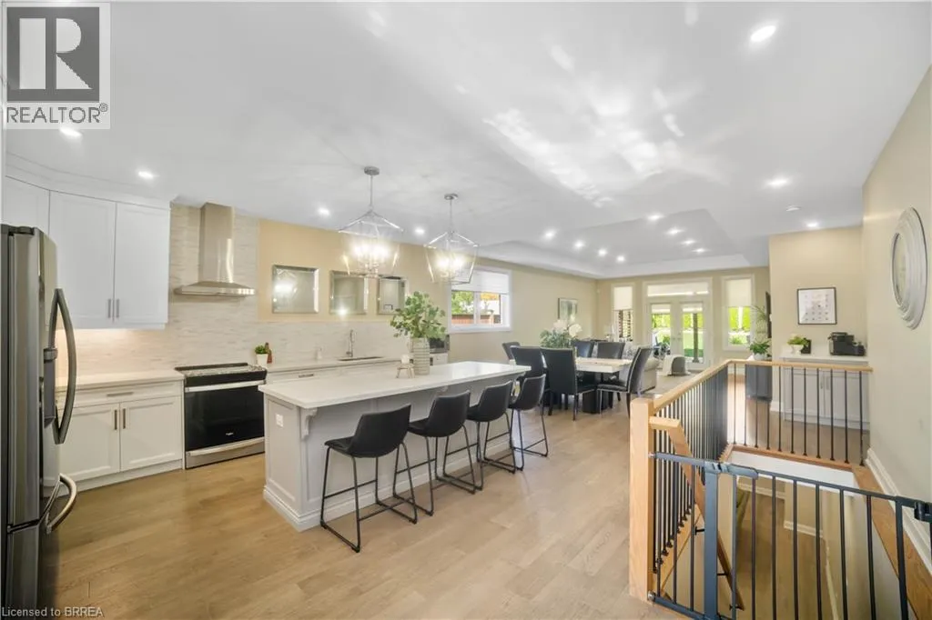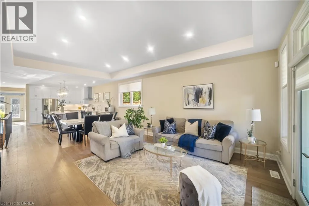 Travelling south on Mt. Pleasant Street, turn right onto Beckett Drive Welcome to your dream home in Brantford's Beckett neighbourhood. This stunning custom-built 3-bedroom, 3-bathroom detached condominium bungalow perfectly blends modern elegance, comfort, and convenience. Nestled in a serene and sought-after community, this residence showcases a spacious open-concept design where the living room, dining area, and kitchen flow seamlessly together, creating an inviting atmosphere ideal for both relaxation and entertaining. Clean architectural lines, 9â ceilings on both levels, and large windows fill the home with natural light, highlighting the beautiful engineered hardwood floors and sleek finishes throughout. The striking kitchen is a true showpiece, featuring custom white cabinetry, quartz countertops, stainless steel appliances, and a generous island â a perfect space for culinary creativity or casual gatherings. The relaxing living room leads directly out to a large covered deck overlooking a beautifully landscaped backyard â perfect for outdoor entertaining or quiet moments in nature. The primary bedroom easily accommodates a king-sized bed and offers a walk-in closet along with a spa-inspired ensuite boasting dual vanities and a luxurious walk-in shower. The fully finished lower level expands your living space with wide-plank luxury vinyl flooring, a cozy family area anchored by a gas fireplace, two additional spacious bedrooms with wall-to-wall closets, a bonus room, and a stylish bathroom. Additional highlights include an elegant oak staircase, energy-efficient windows, abundant pot lighting, underground automated irrigation system, and a one-car garage. With thoughtful upgrades, high-end finishes, and meticulous craftsmanship, thereâs nothing left to do but move in and enjoy this exceptional quality-built home. Book your showing today! (id:27476)
