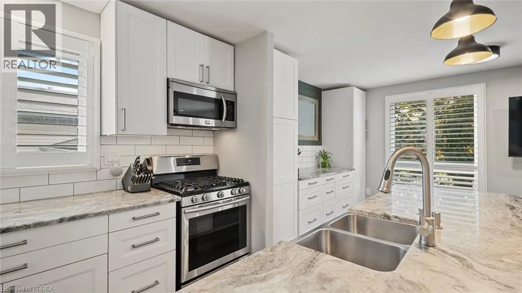 From Hwy 403: King George Rd (#24) exit, north on King George Rd., left on Oxford St., right on Balmoral Dr., left on Myrtleville Dr., right on Heritage Rd., left on Latzer Cres. Welcome to 45 Latzer Crescent, located in Brantfordâs beautiful and sought-after North End. This move-in ready home sits on a quiet, mature lot offering exceptional privacy â perfect for families looking for more space in a prime location. Close to all major amenities, golf courses, and highway access, this is one you wonât want to miss! Featuring 3+2 bedrooms, 1.5 bathrooms, and a bright, spacious layout, this home shows true pride of ownership throughout. The inviting entryway offers a coat closet, built-in bench, and storage. Just up a few steps, youâll find the stunning living area and a recently renovated kitchen showcasing white shaker-style cabinetry, stainless steel appliances, a custom oversized island, coffee bar, subway tile backsplash, under-cabinet lighting, granite countertops, and a gas stove. The open-concept main level is complete with new hardwood flooring, recessed lighting, and stylish new fixtures. The upper level includes three spacious bedrooms, including the primary suite, and a beautifully updated 4-piece bathroom featuring granite counters, wainscotting, and a spa-inspired design. A few steps down from the main entry, the on-ground lower level offers sliding patio door access to the backyard and includes a cozy family room, two additional bedrooms, a bathroom, and a laundry areaâproviding flexibility for guests, teens, or a home office setup. Step outside to enjoy the large backyard, complete with a wooden deck, concrete patio, and lush mature trees, creating a perfect private retreat for entertaining or relaxing. With a new roof (2025) and countless updates throughout, 45 Latzer Crescent truly checks all the boxes â space, style, and a fantastic North End location. (id:27476)