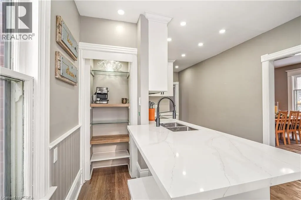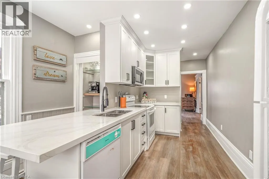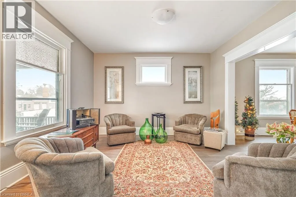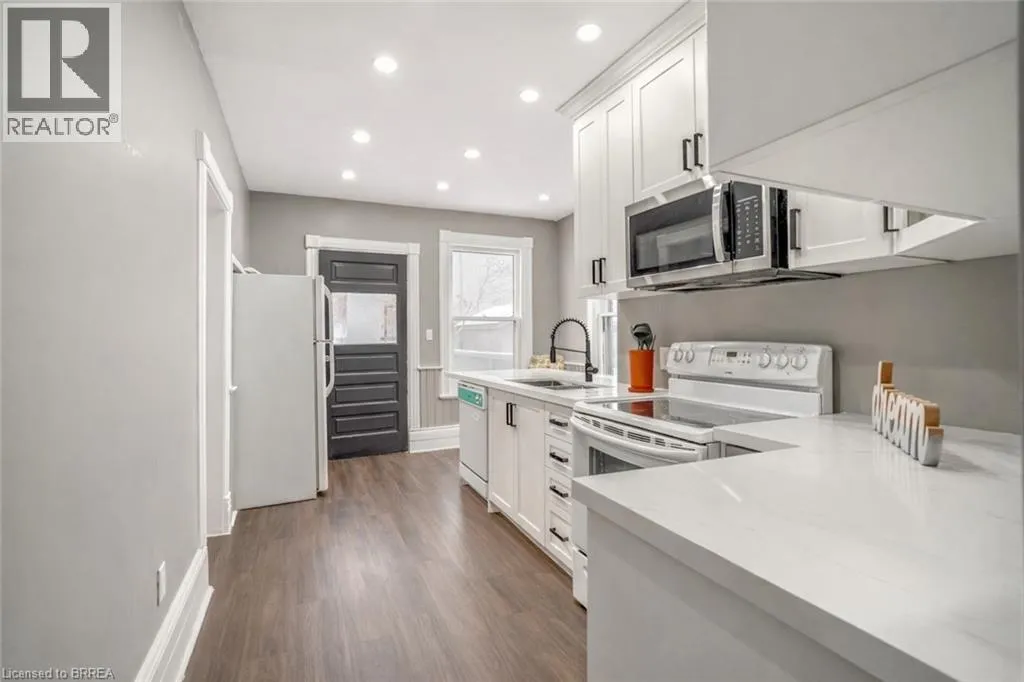 Head West on Dalhousie Street. Property at Corner of Rawdon St. and Dalhousie St. First Time Offered for Sale! Check out this beautifully updated and spacious 5 bedroom, 2 bathroom all brick home that is loaded with character and charm featuring a roomy covered front porch for relaxing with your morning coffee, an inviting entrance for greeting your guests, generous-sized principle rooms with high baseboards, attractive luxury vinyl plank flooring, and elegant Craftsman style trim around the windows, French doors leading to a bright living room for entertaining that is open to a formal dining room that's large enough for you to enjoy hosting family gatherings, a gorgeous kitchen with contemporary cabinetry, attractive quartz countertops, a new built-in microwave and a new dishwasher, and access to the backyard, two newly updated bathrooms with one featuring a modern tiled walk-in shower, a full basement that offers lots of possibilities, and a big backyard for the kids to run around and play. This home is conveniently located in the desirable East Ward neighbourhood thatâs close to schools, parks, trails, shopping, restaurants, on the bus route, and only minutes away from highway 403 for commuters. Pride of ownership shines in this solid brick home that has been lovingly maintained by the same family for many years with 5 bedrooms all on the same level and despite the recent renovations the character and charm of yesteryear has been preserved with the original high baseboards, beautiful trim and woodwork, a claw foot tub, and more. Recent updates include a new kitchen in 2025 with quartz countertops, a new built-in microwave and a new dishwasher, new roof shingles in 2024, new high efficiency forced air gas furnace in December 2025, new vanities in both of the bathrooms with marble countertops and modern fixtures, newly tiled walk-in shower, new luxury vinyl plank flooring, and more. A wonderful family home thatâs just waiting for you to move-in and enjoy! Book a viewing for this home today! (id:27476)